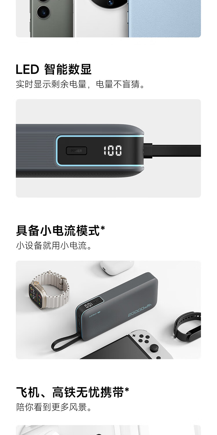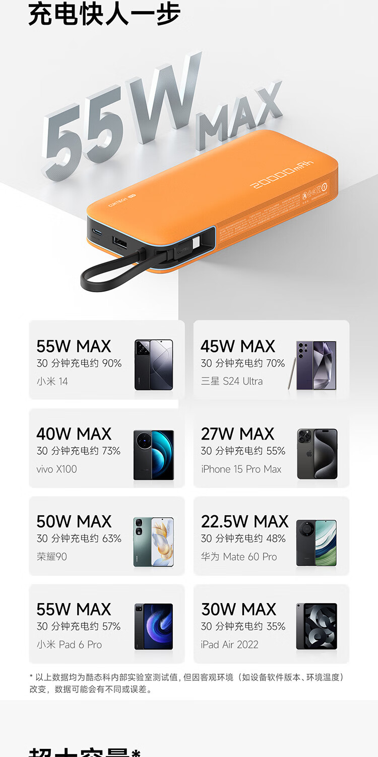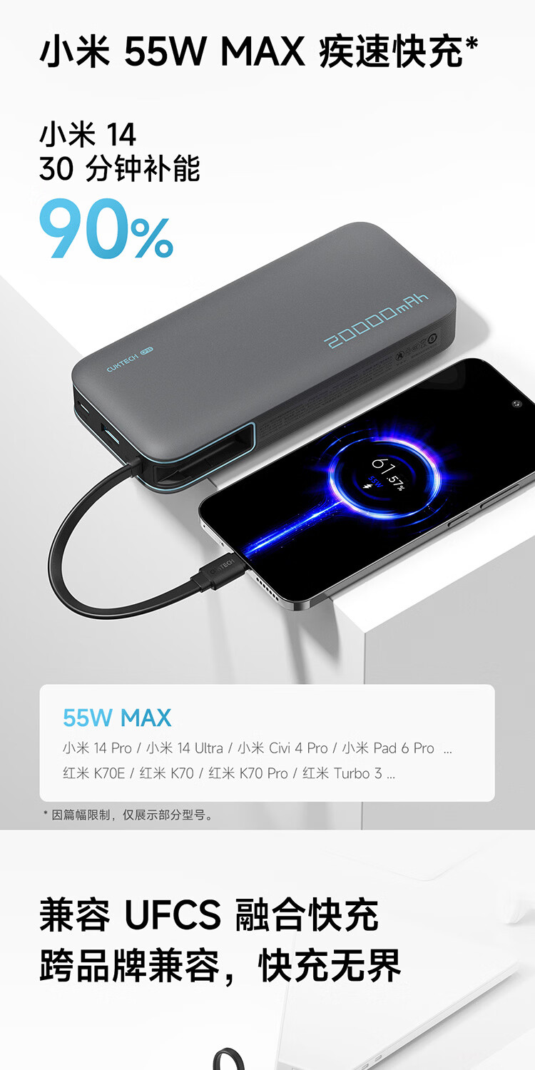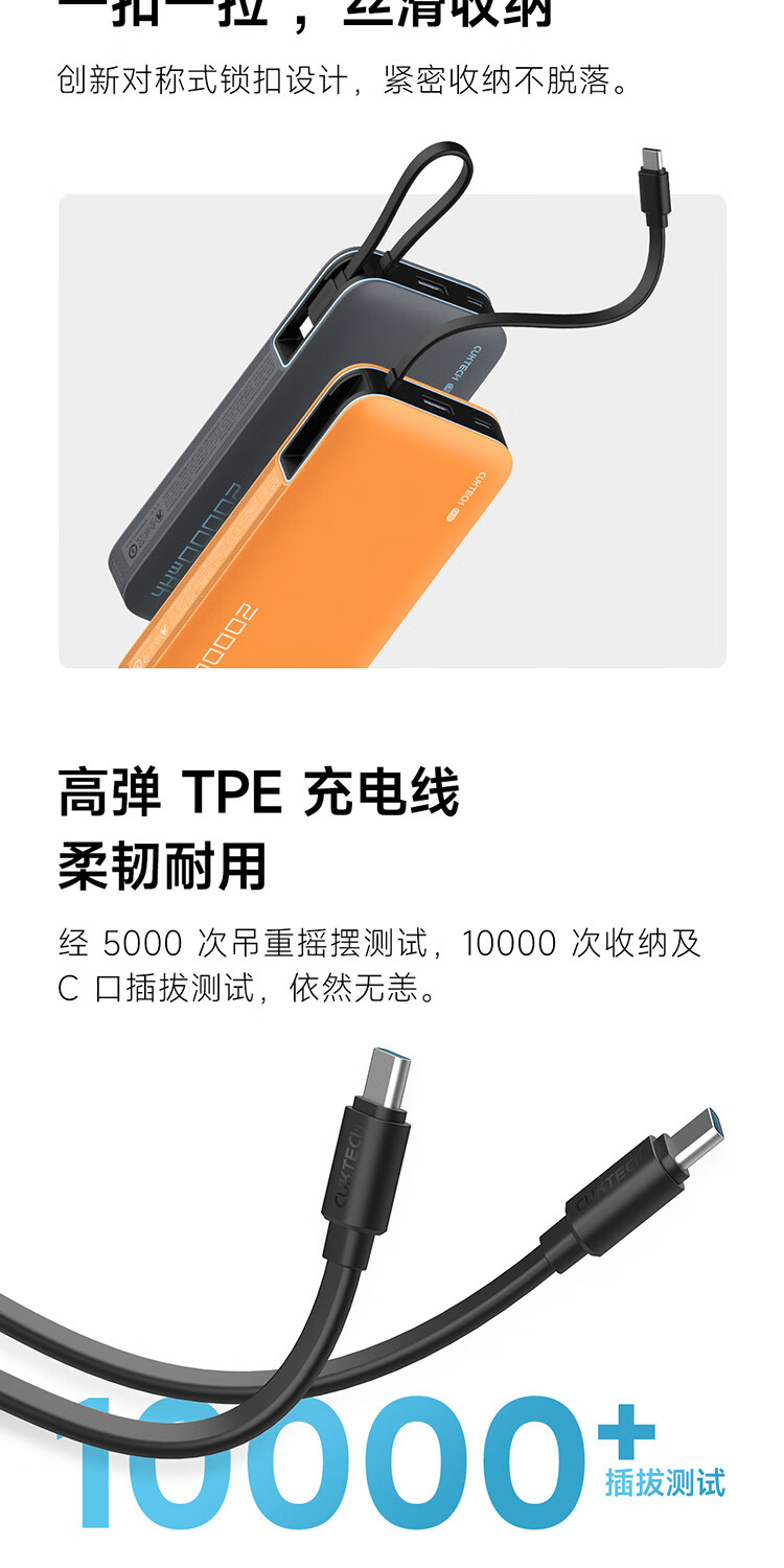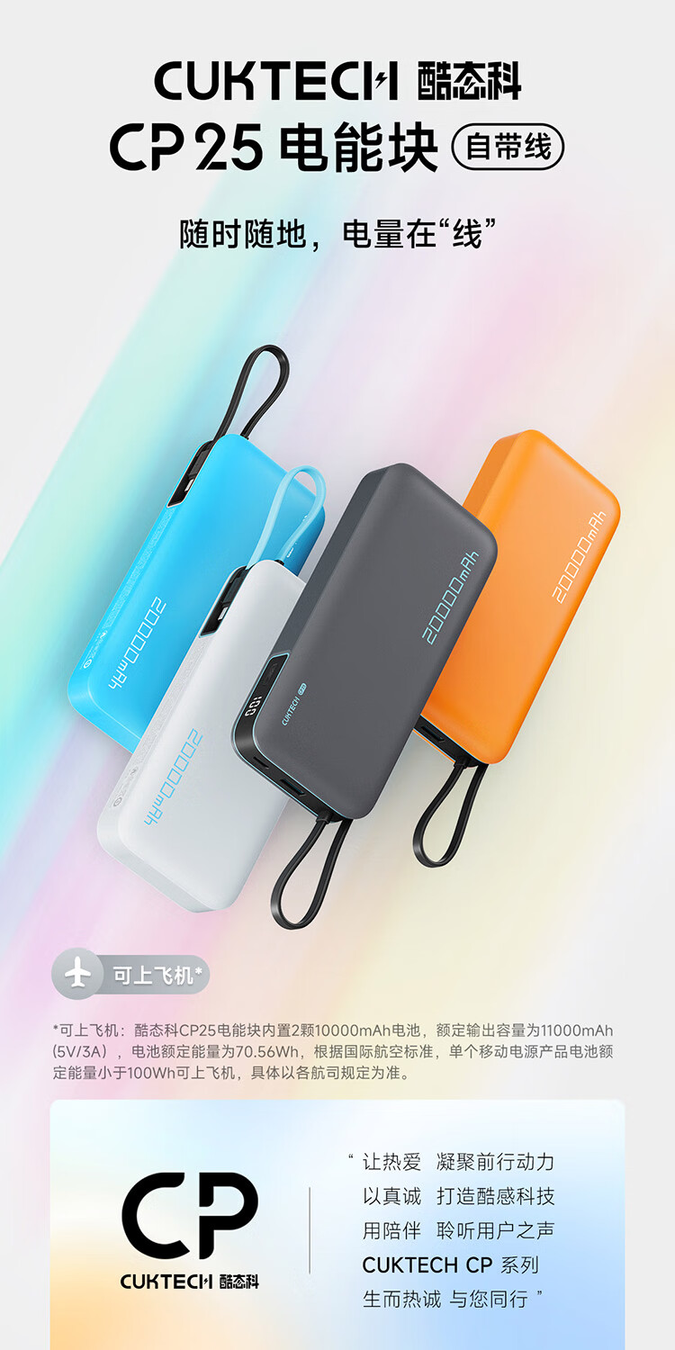 CUKTECH酷态科【3C认证上飞机】充电宝自带线20000毫安移动电源55W快充CP25适用手机笔记本户外储能电源