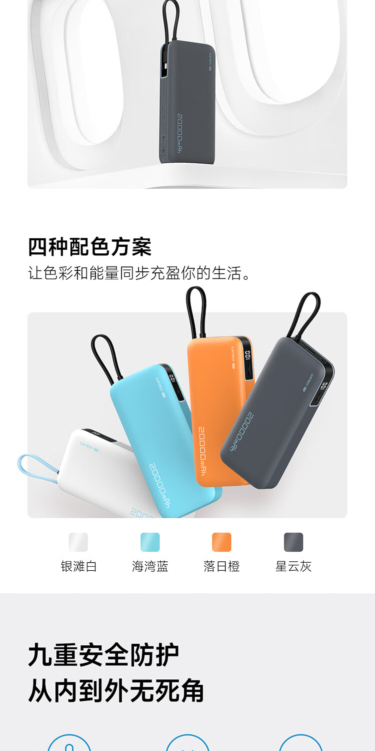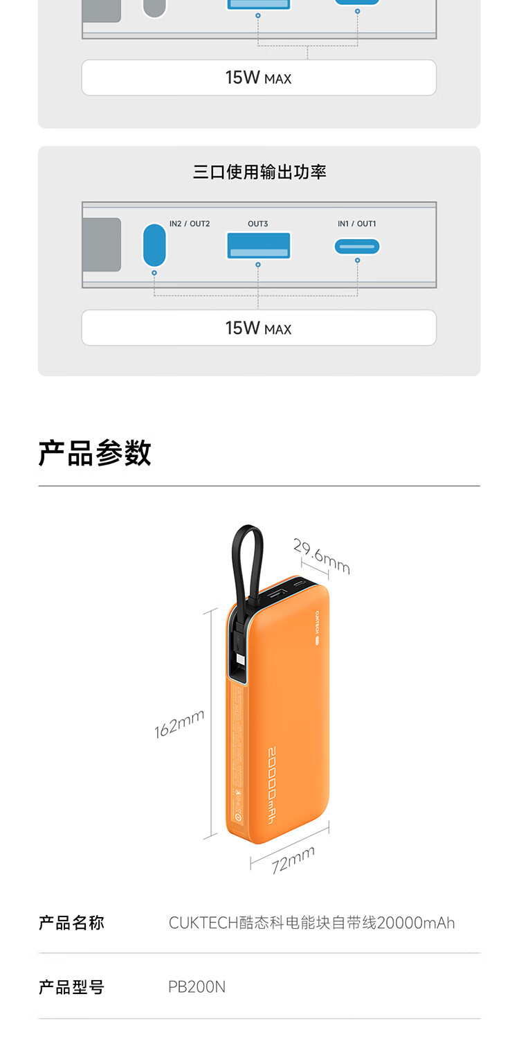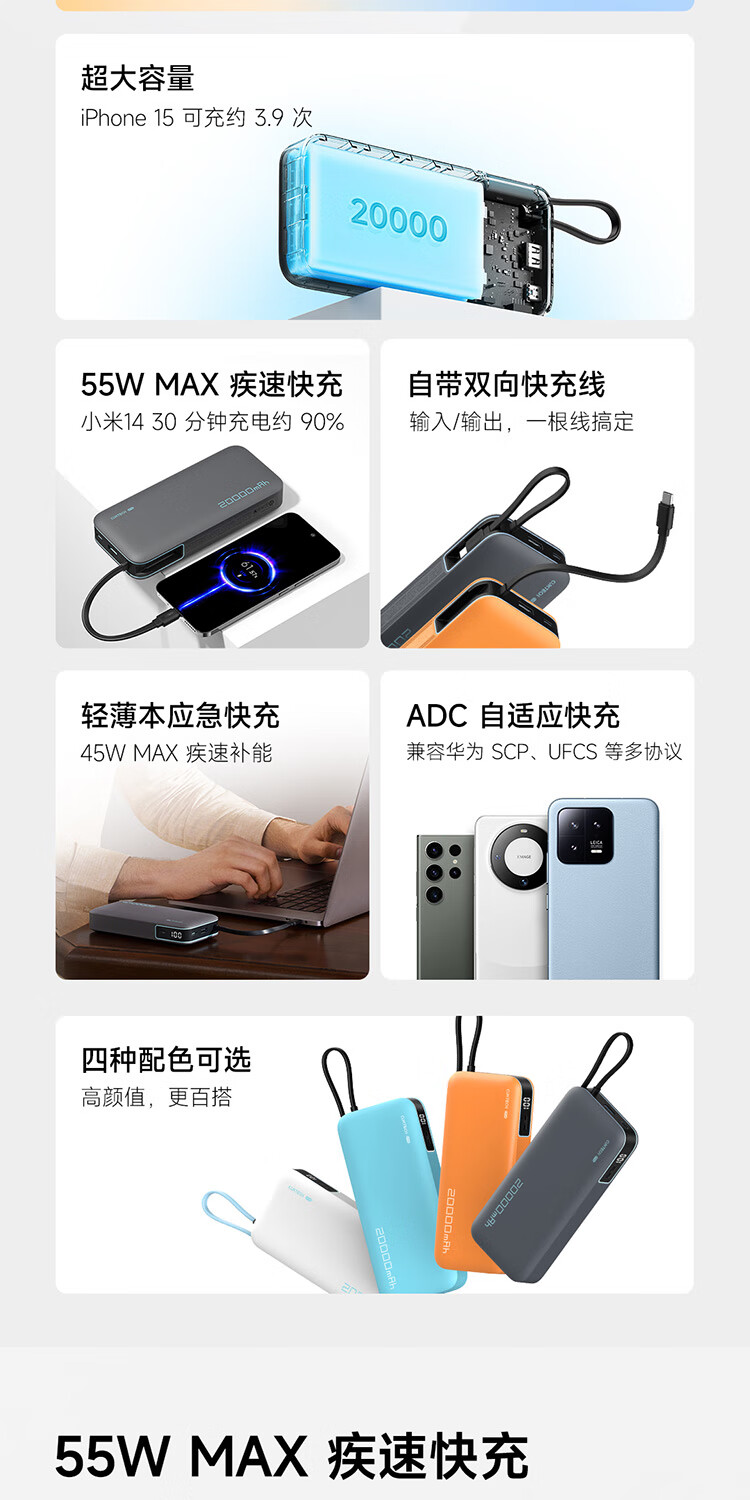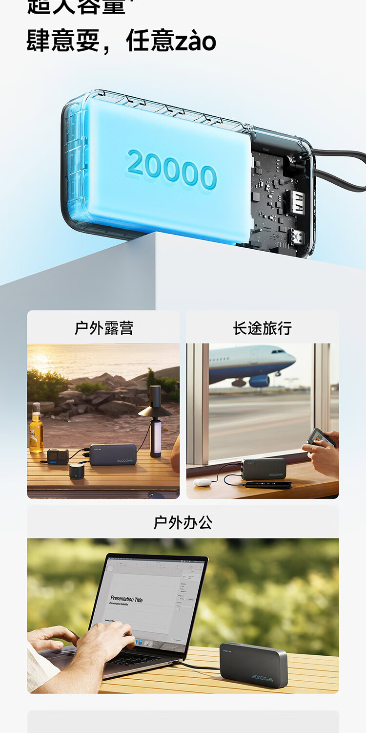 CUKTECH酷态科【3C认证上飞机】充电宝自带线20000毫安移动电源55W快充CP25适用手机笔记本户外储能电源
