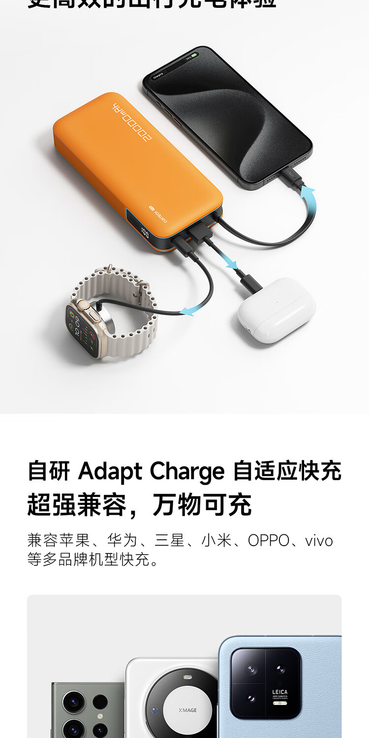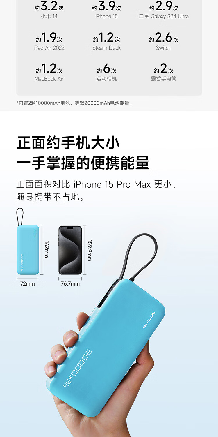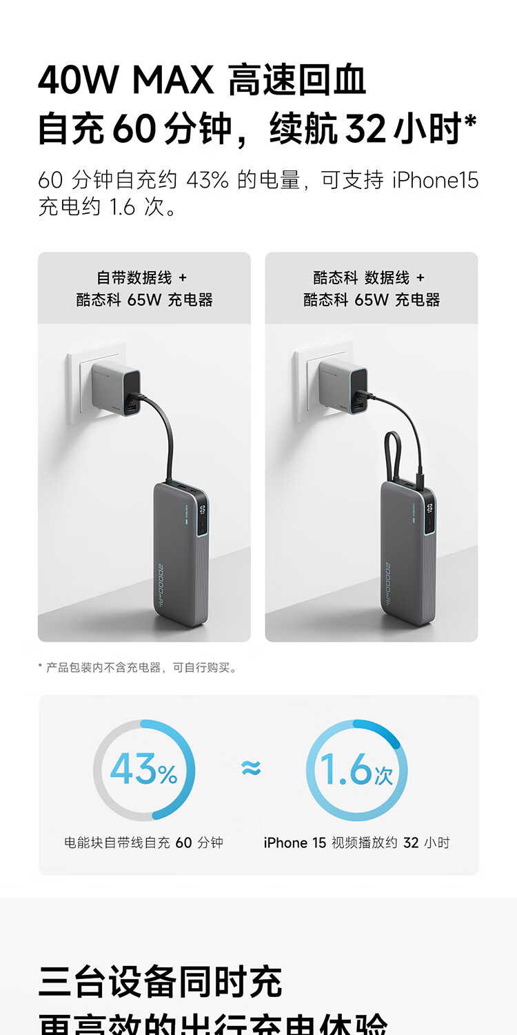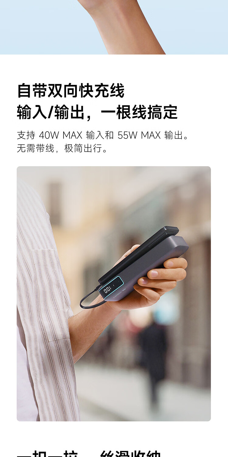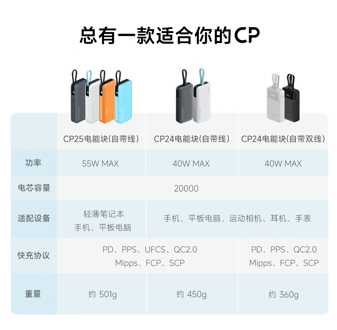 CUKTECH酷态科【3C认证上飞机】充电宝自带线20000毫安移动电源55W快充CP25适用手机笔记本户外储能电源