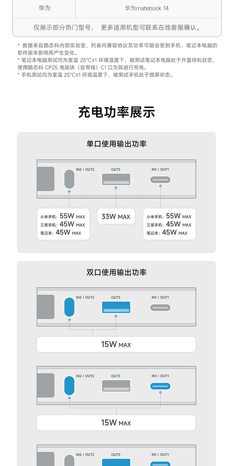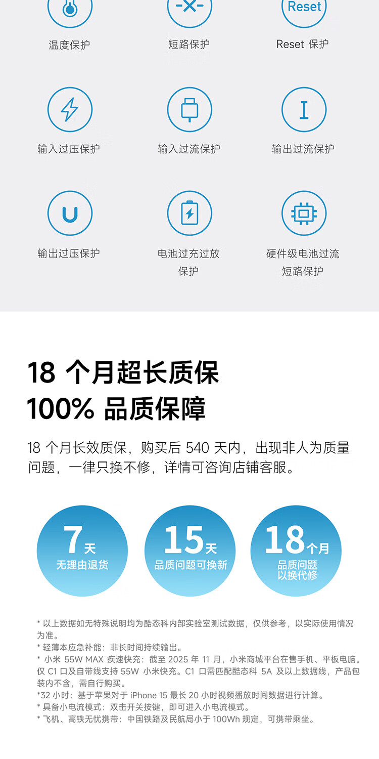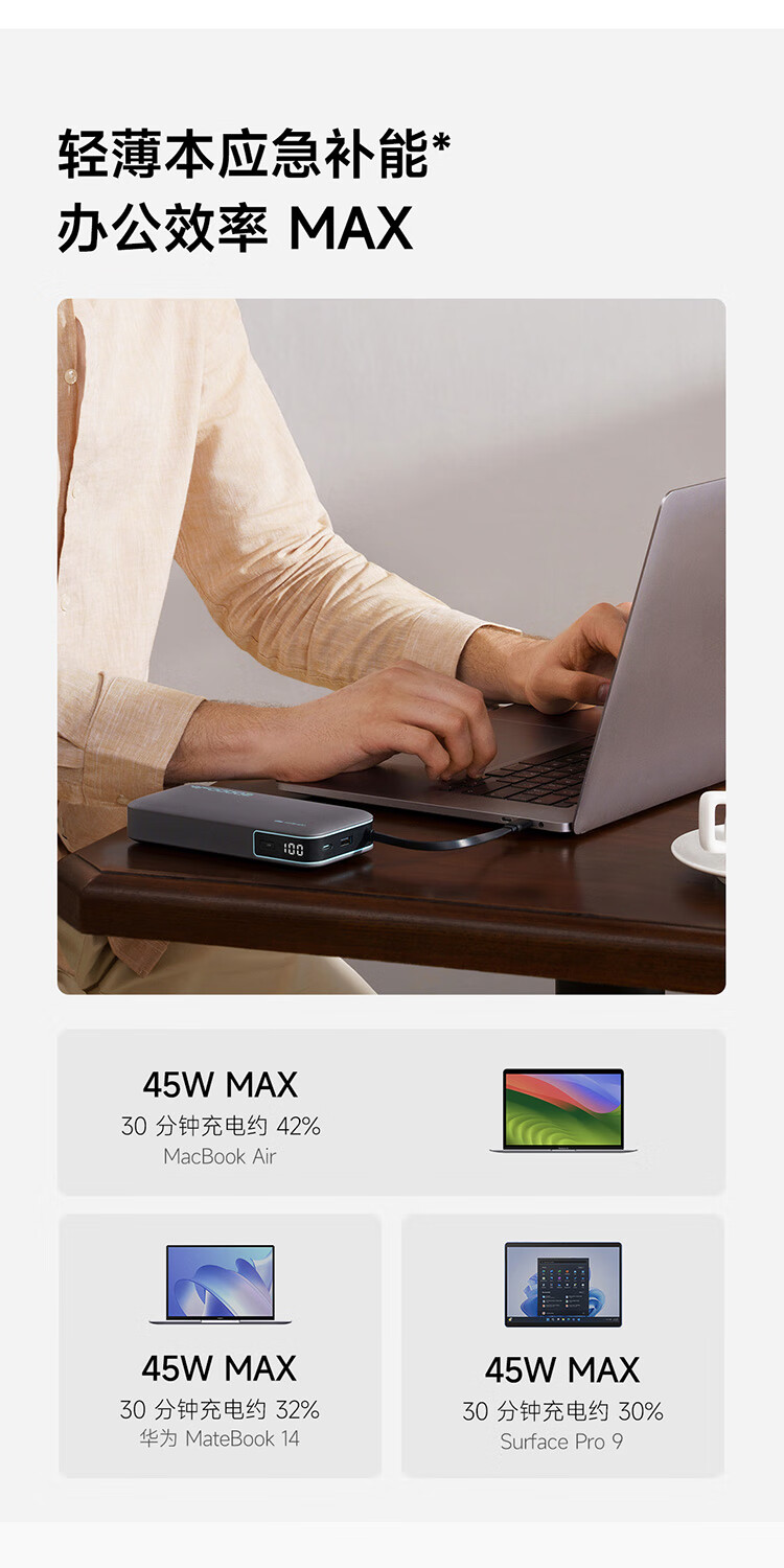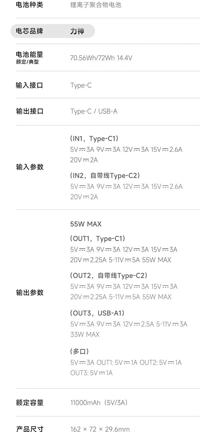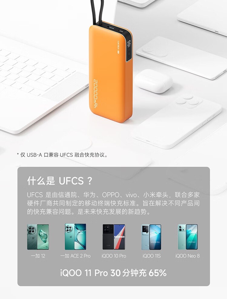 CUKTECH酷态科【3C认证上飞机】充电宝自带线20000毫安移动电源55W快充CP25适用手机笔记本户外储能电源