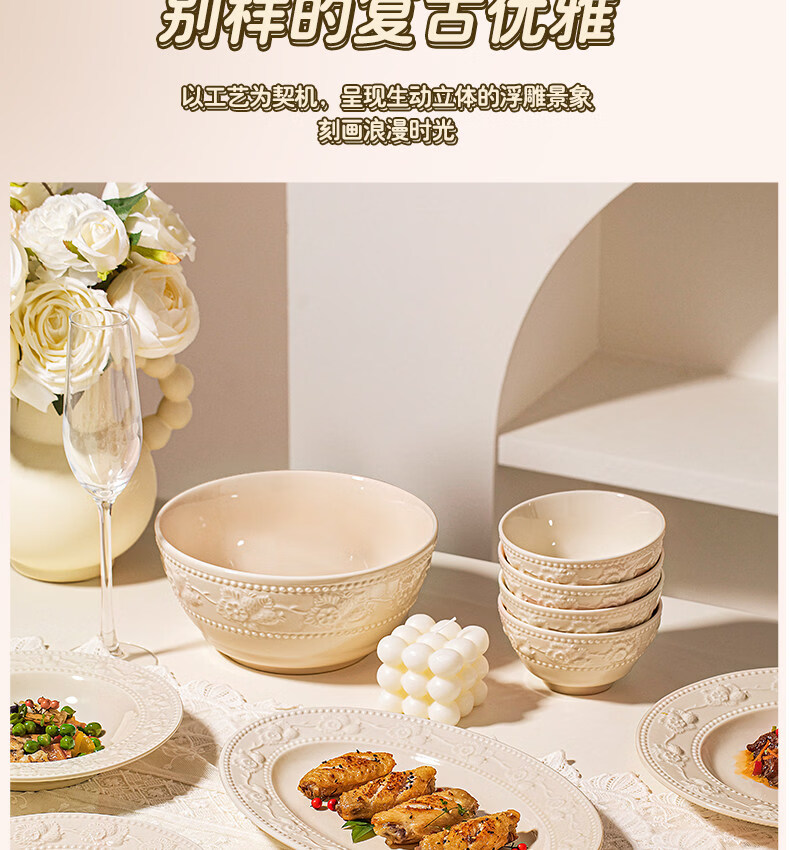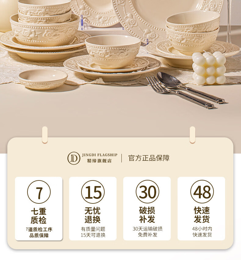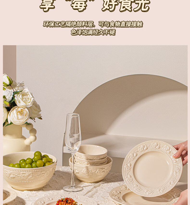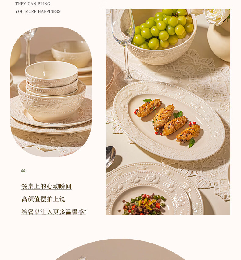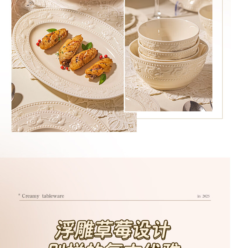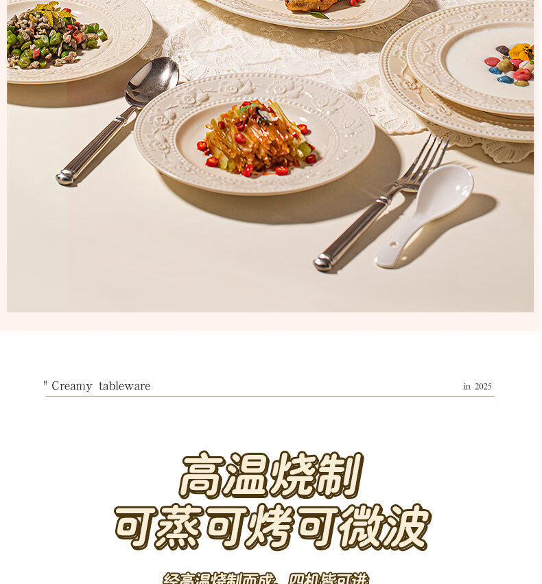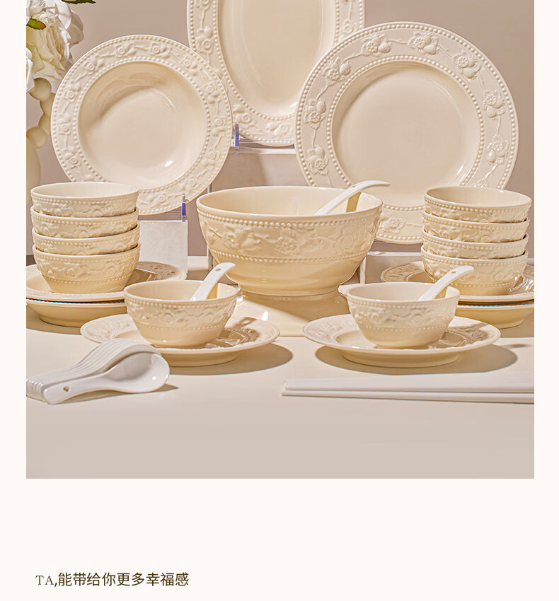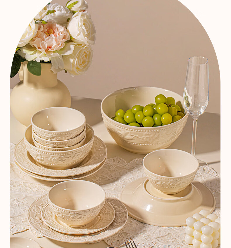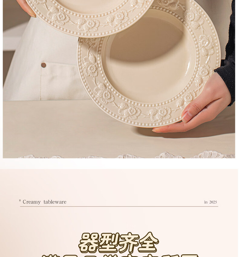 精缔陶瓷JINGDI釉下彩2025浮雕法式奶油风碗碟套装家用高颜值餐具套装碗盘乔迁 【80%用户购买】奶白6人食31件【送砂锅】
