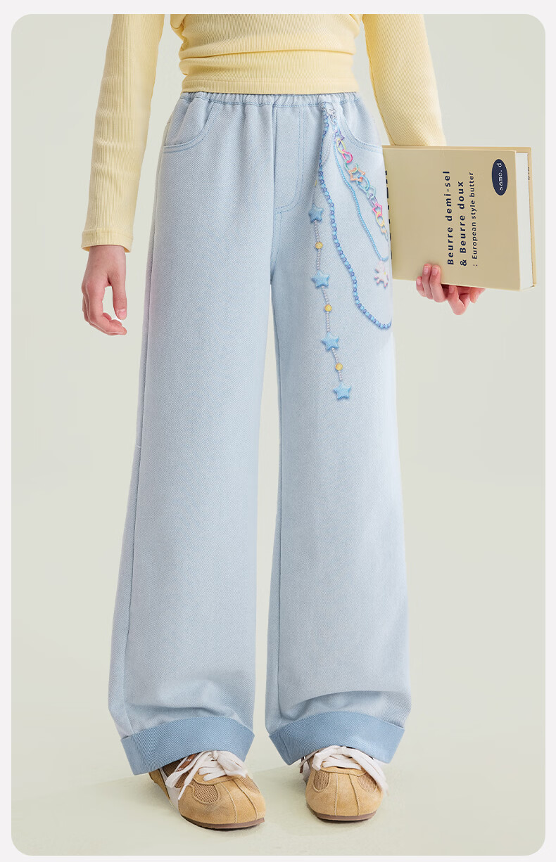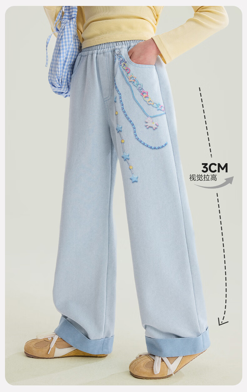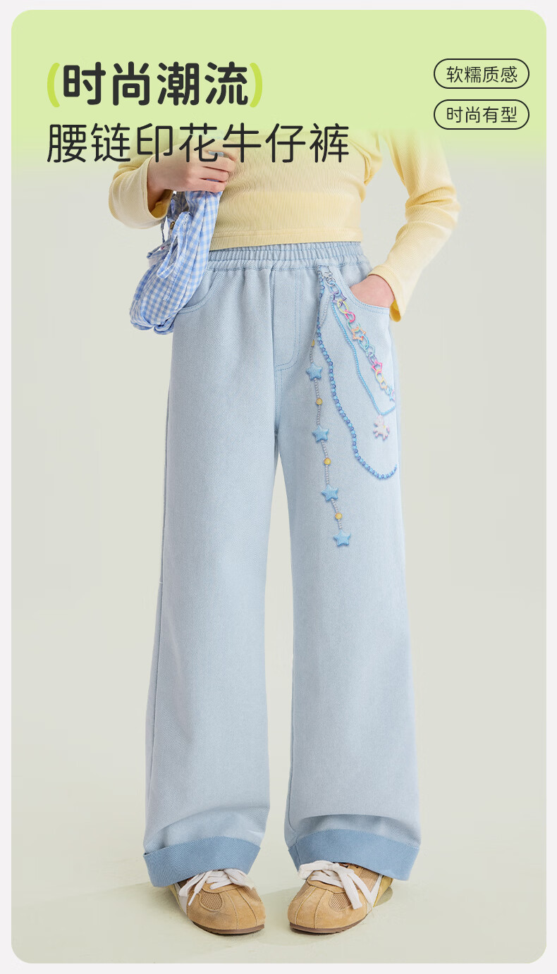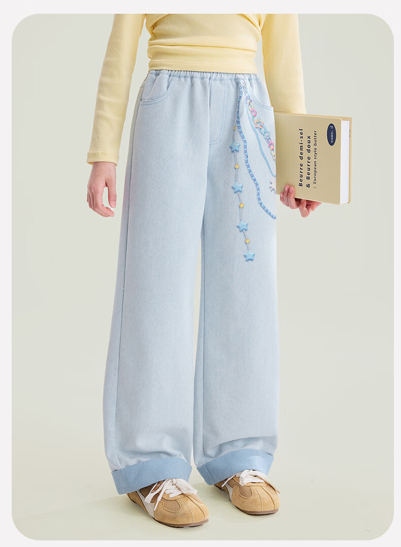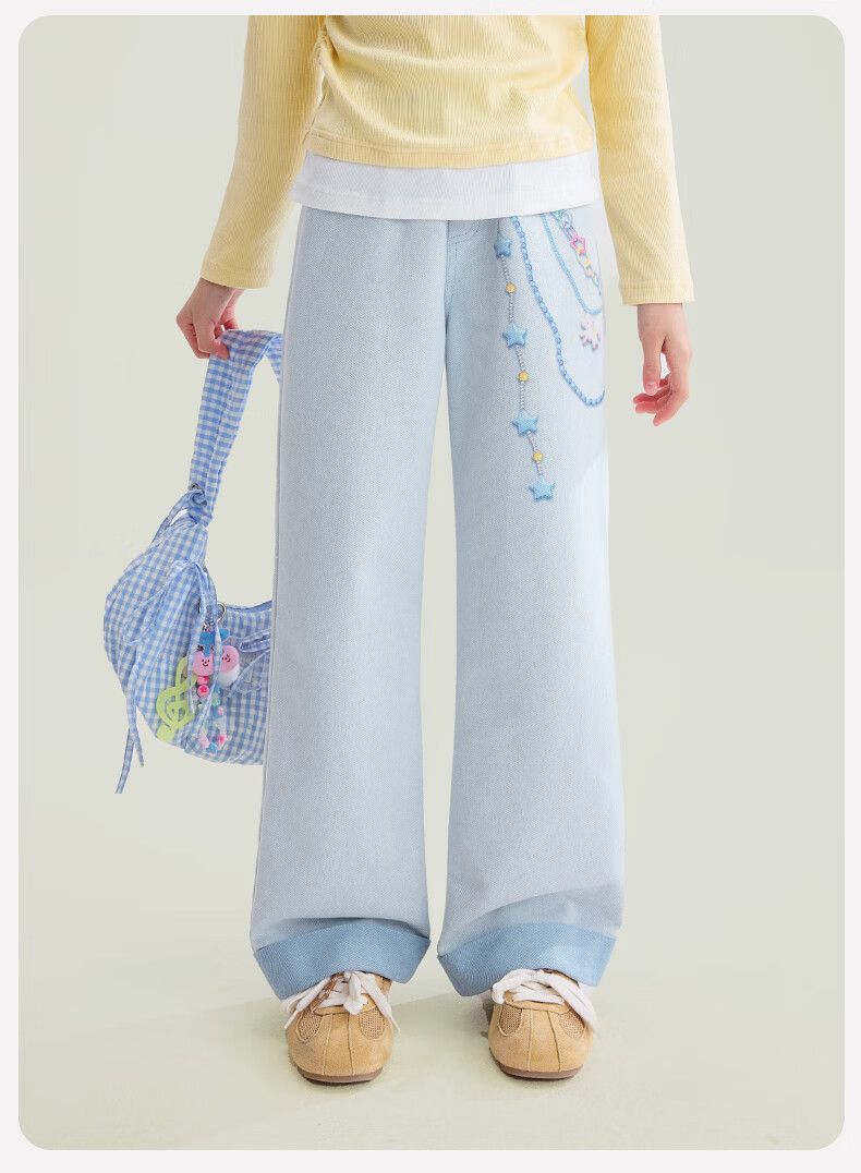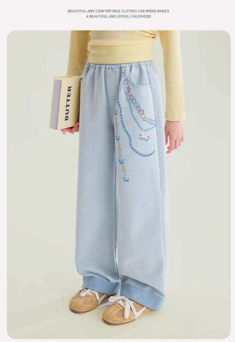 媛媛公主女童星星印花软牛仔裤26春秋新款儿童裤子中大童时尚宽松直腿裤 浅蓝色 110