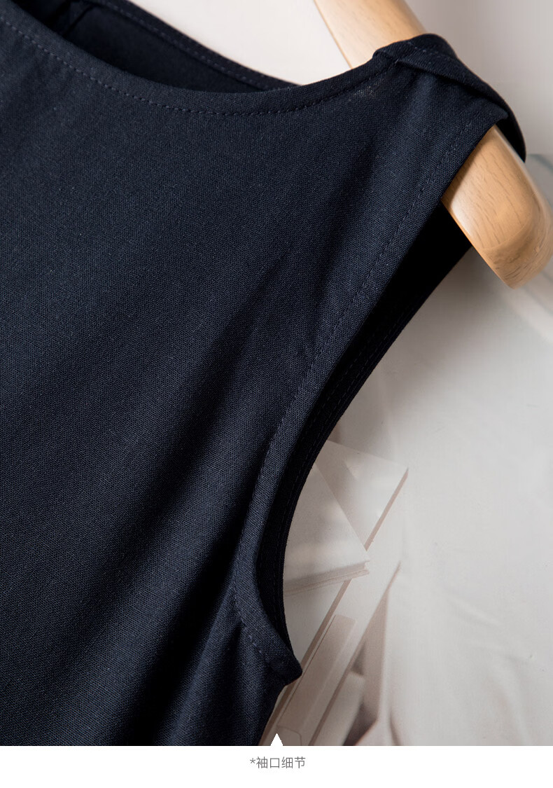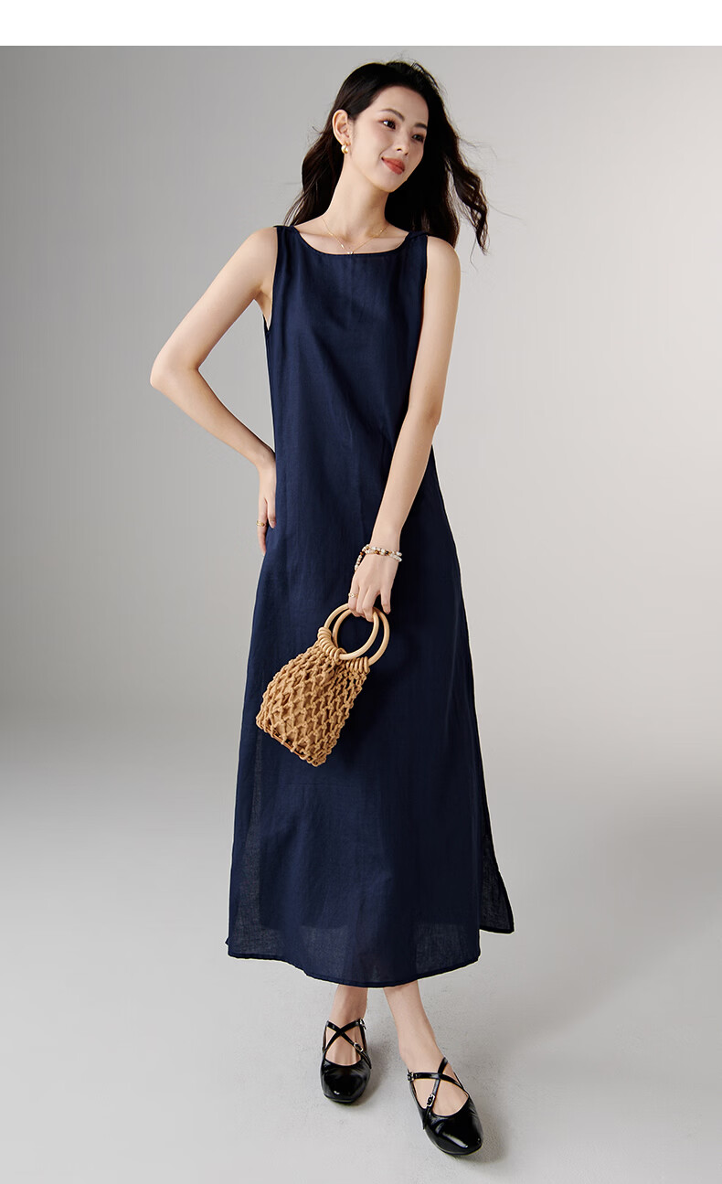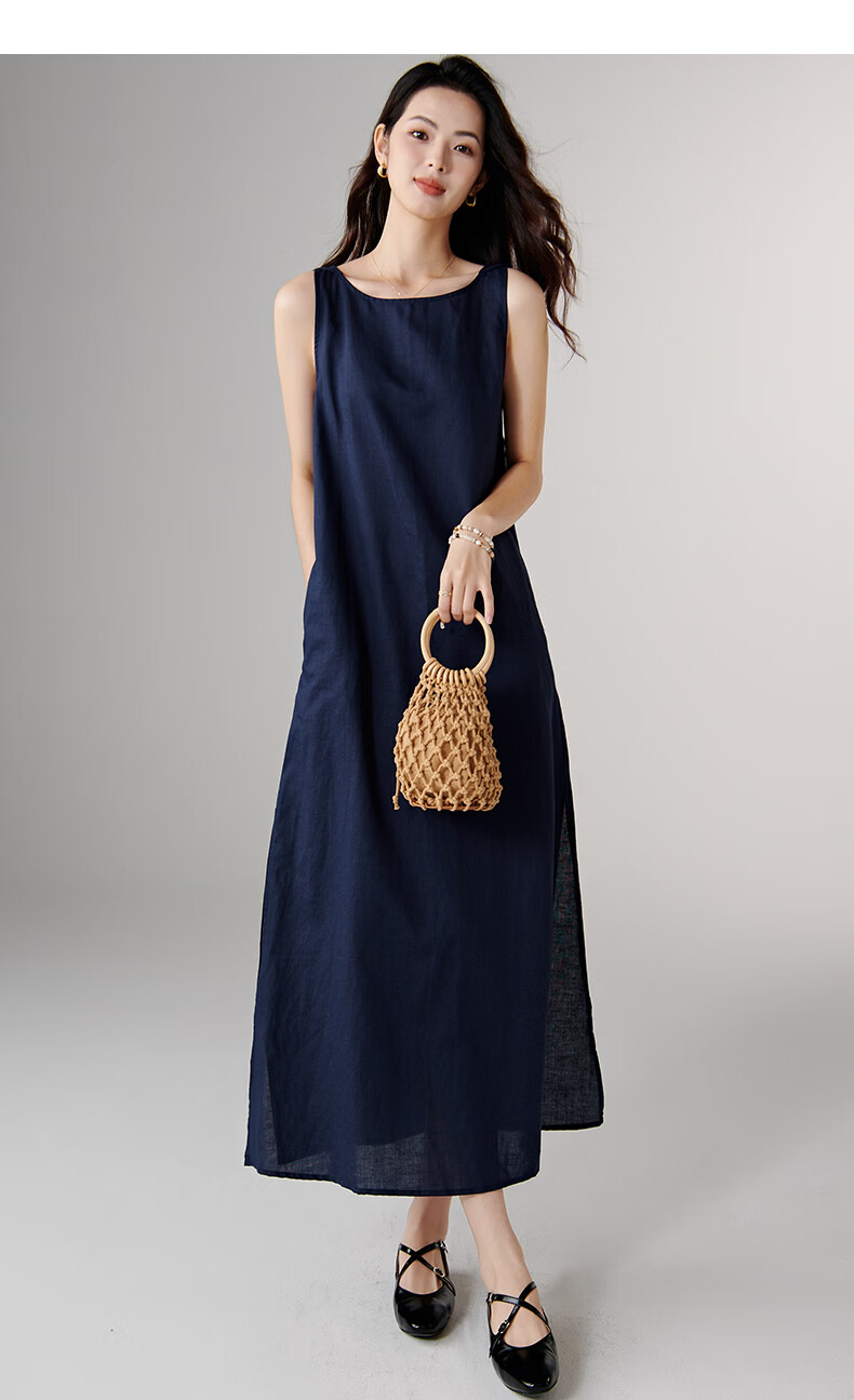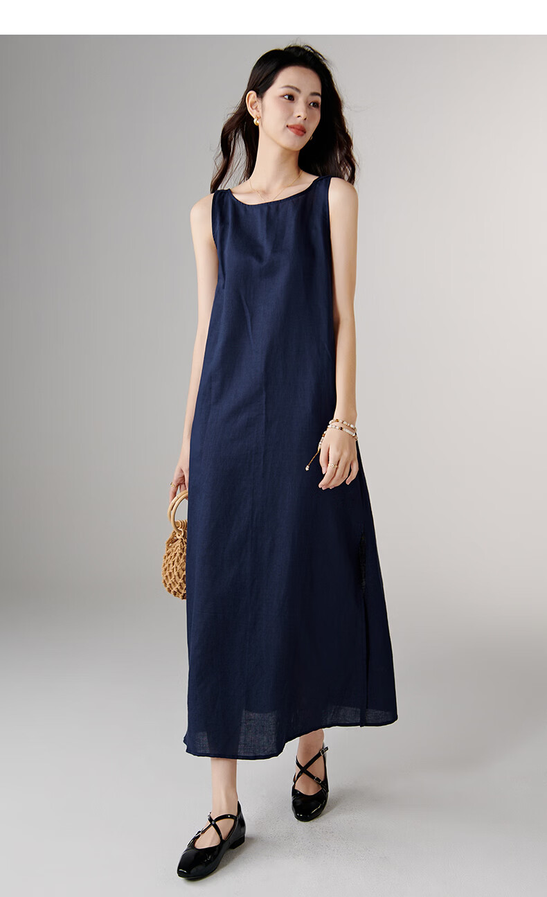 晚白【新品】2026年春款休闲棉麻裙子宽松显瘦纯色无袖连衣裙 蓝色 S