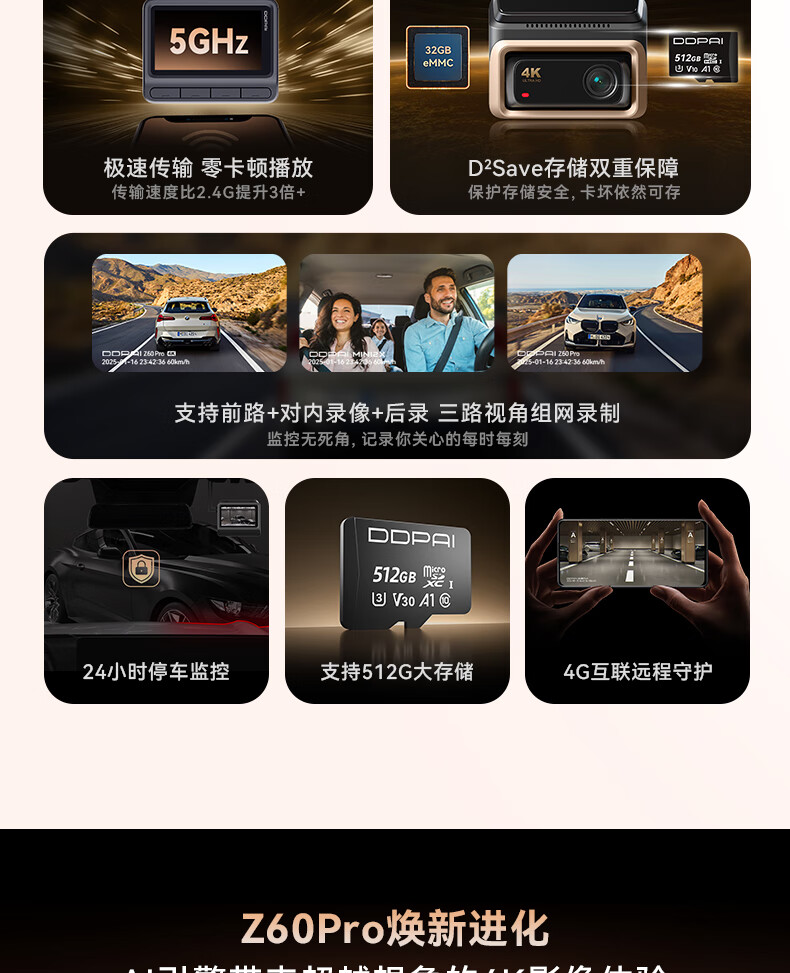 盯盯拍AI行车记录仪Z60Pro 4K前后双录 双索尼传感器 4G远程互联 5GWiFi