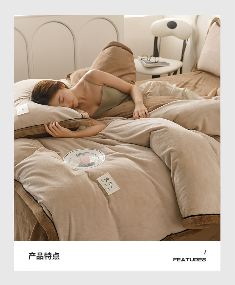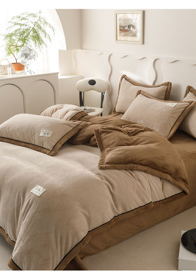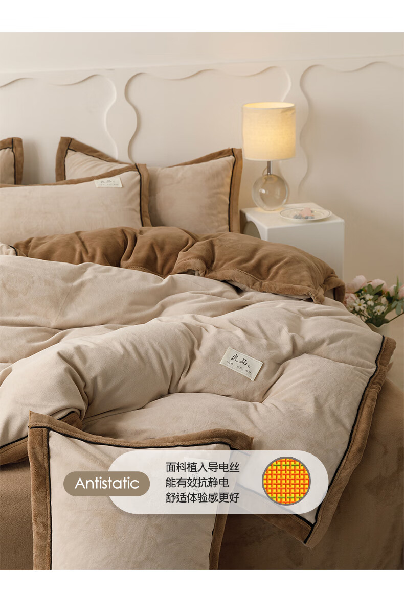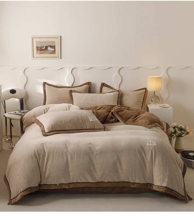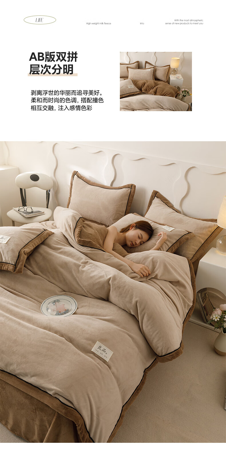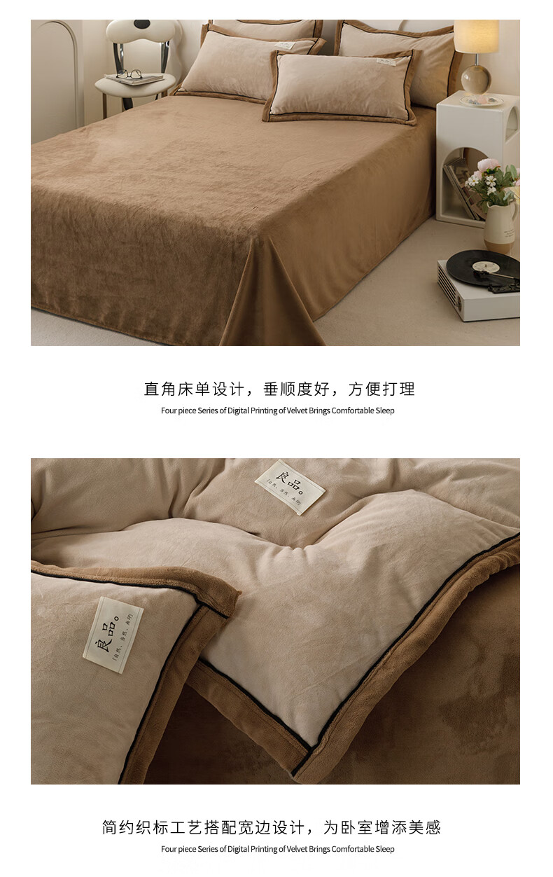 猫人(MiiOW)冬季牛奶绒床上四件套 加厚双面绒被套罩床单床笠单双人床品 米驼+奶茶咖 1.5/1.8 床单款 四件套(被套200*230)