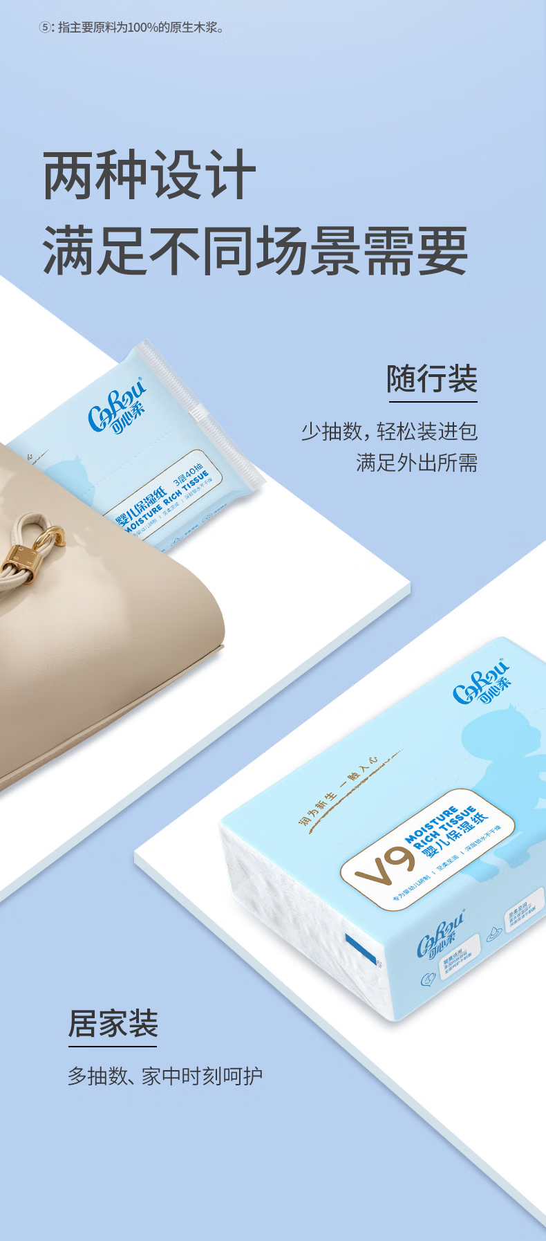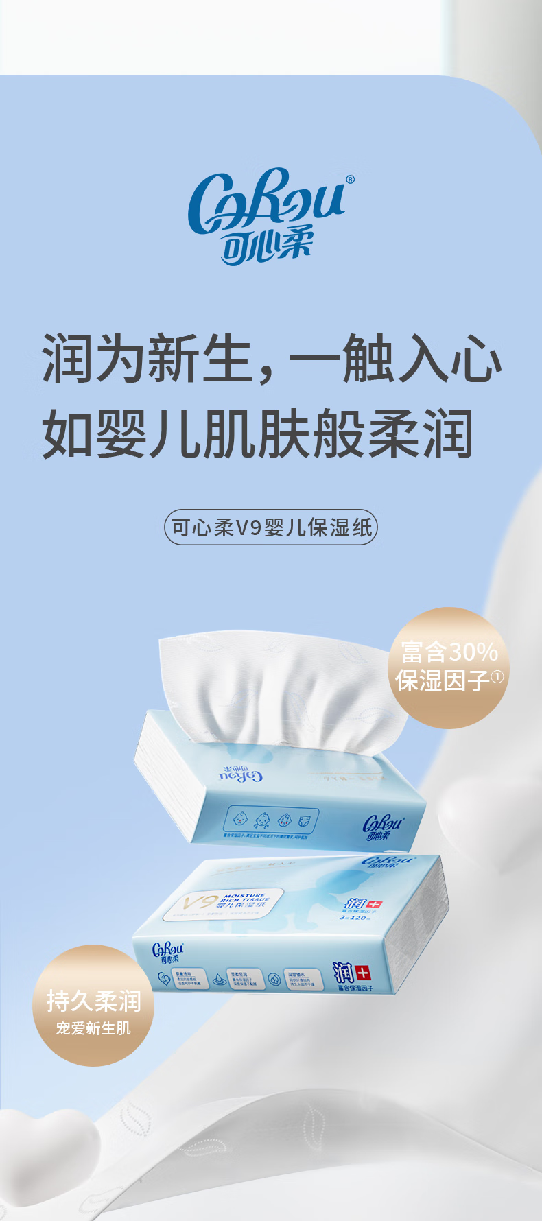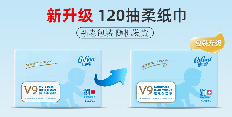 可心柔(COROU)V9婴儿纸巾3层M码120抽乳霜纸母婴宝宝云柔巾卫生纸抽纸 【保湿柔润】 3层 120抽*5包 M码