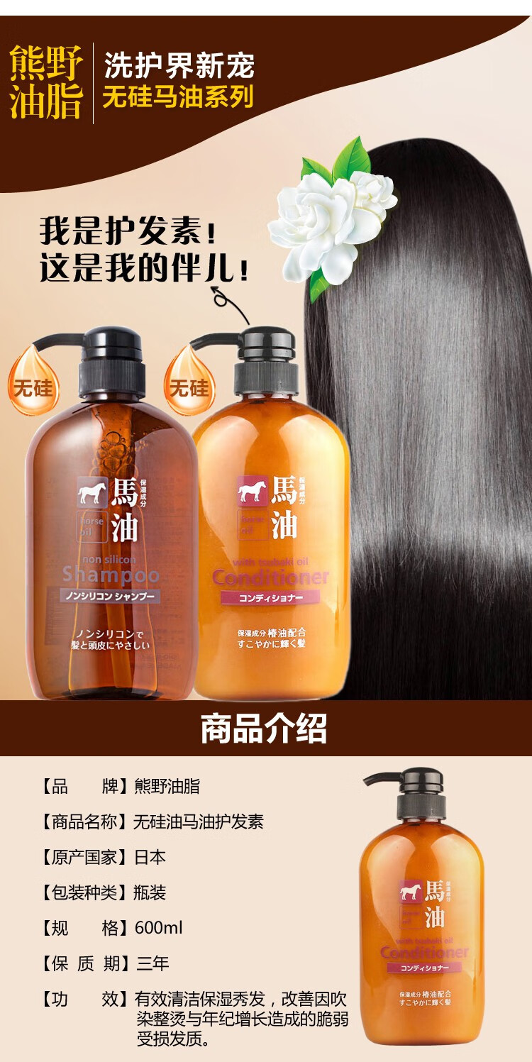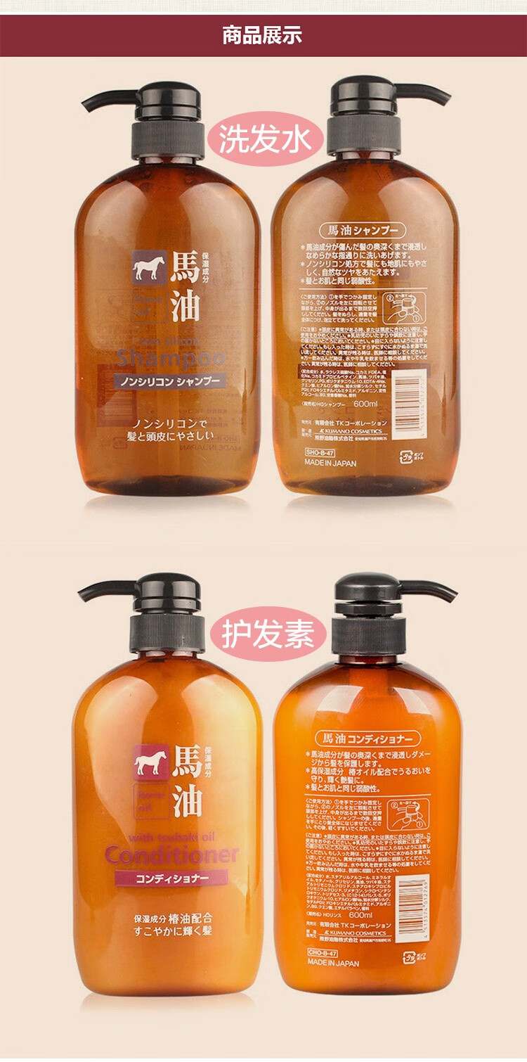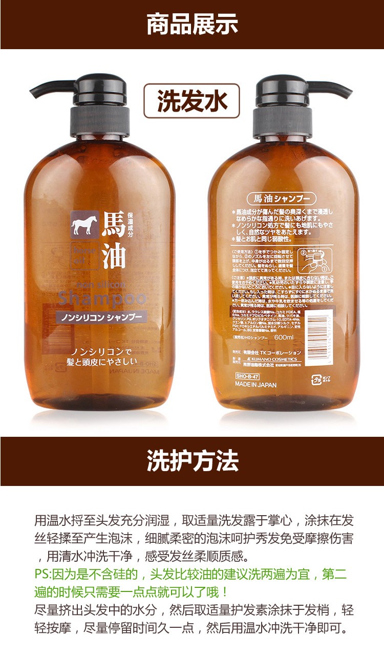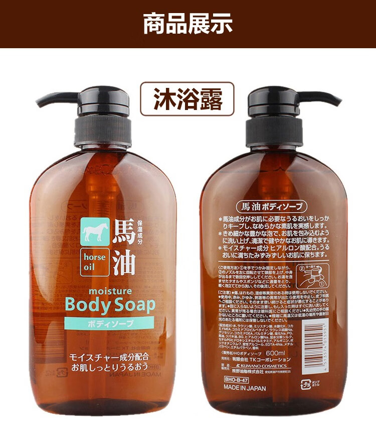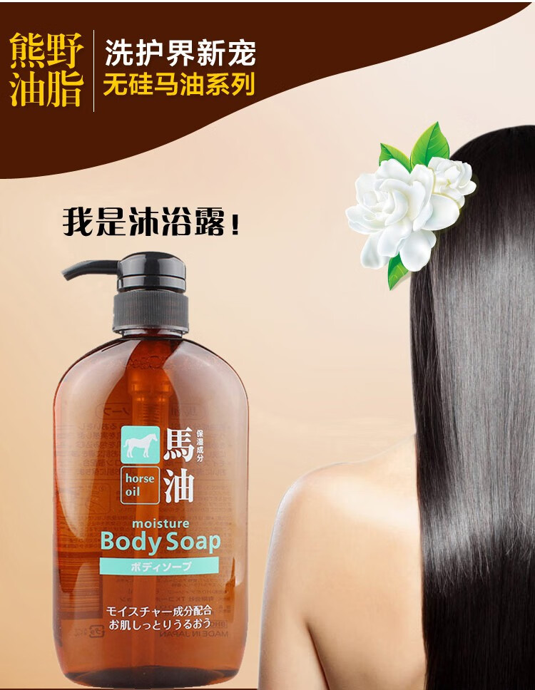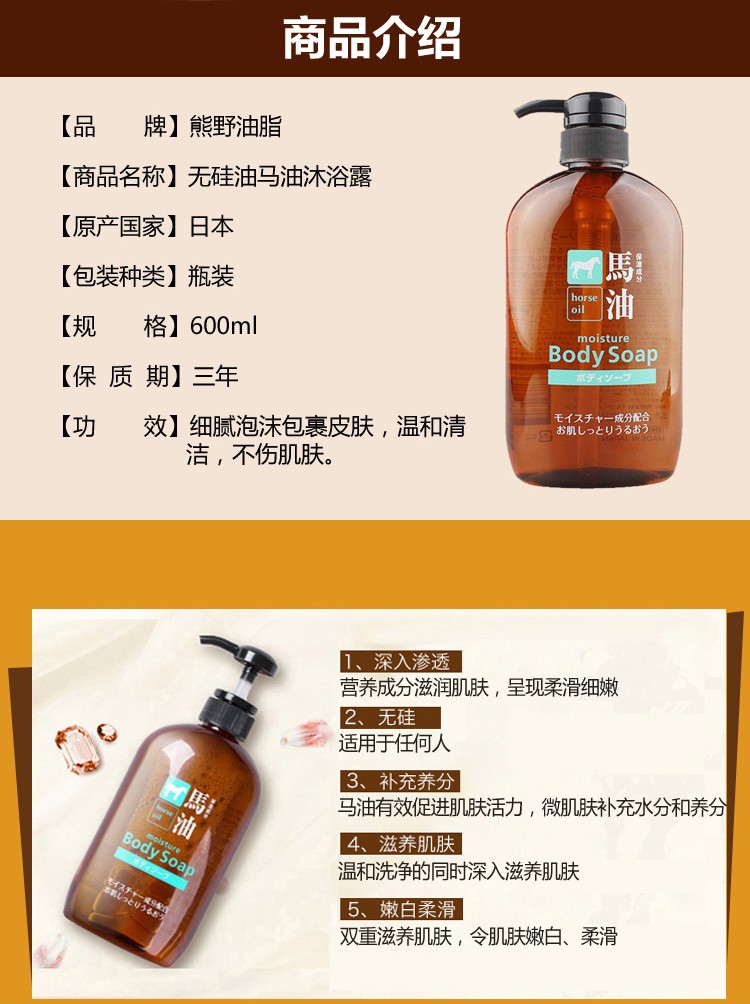 熊野油脂(kumano)日本原装进口 无硅油男女通用滋润天然弱酸马油沐浴护发洗发水 马油沐浴露600ml