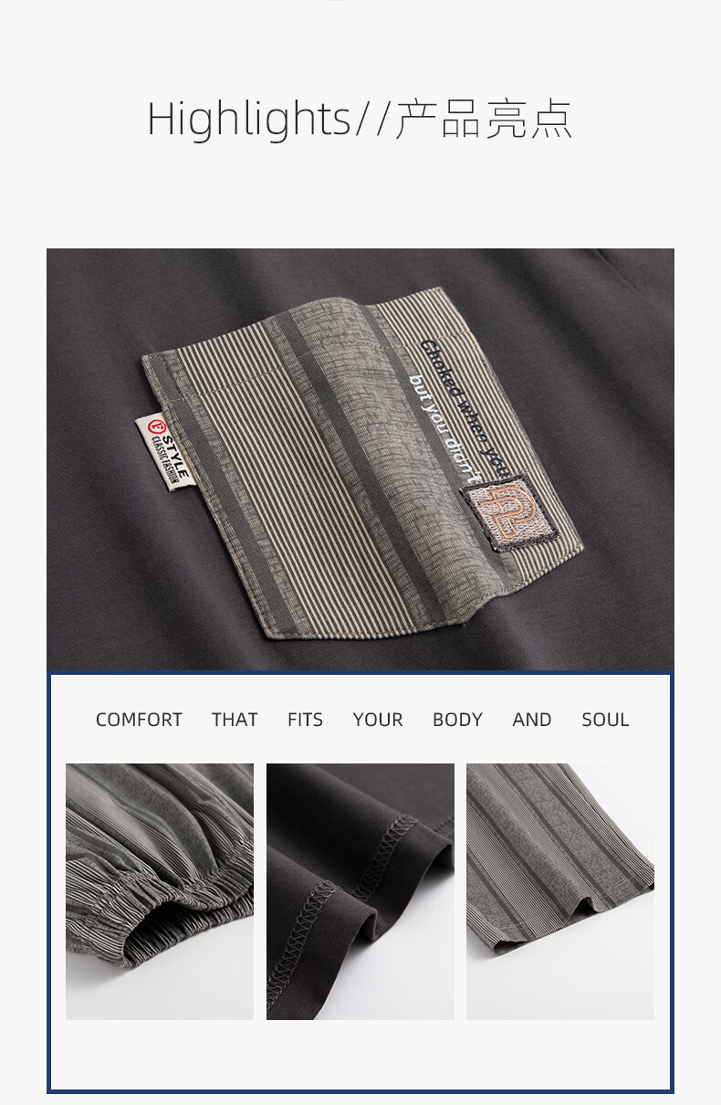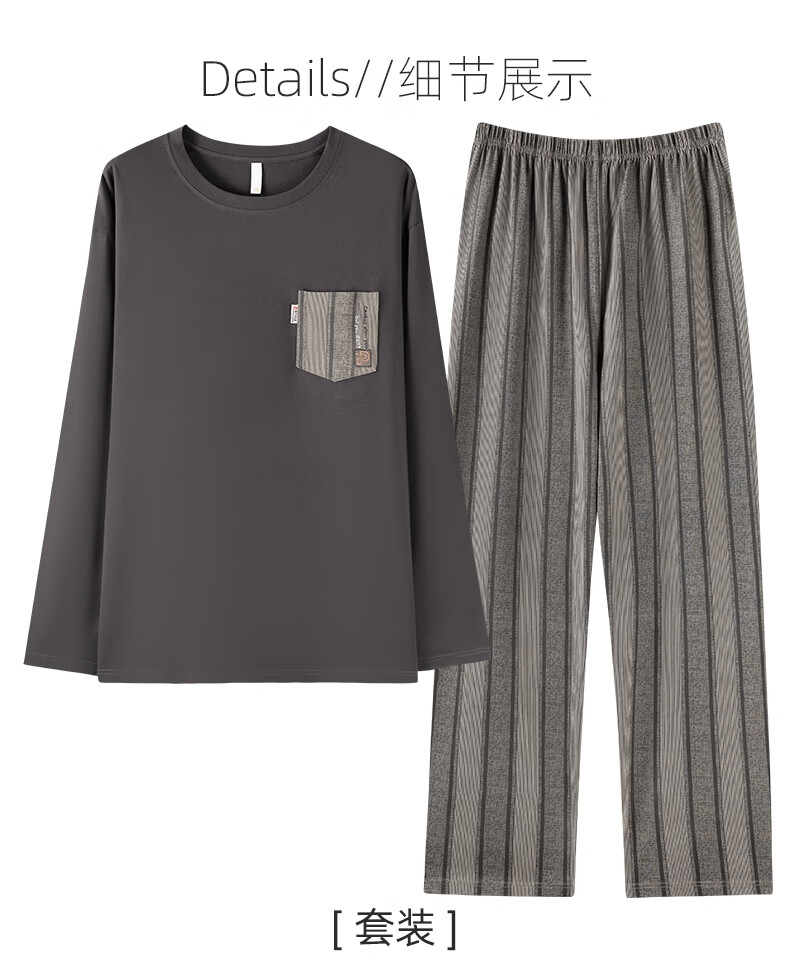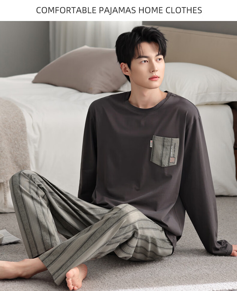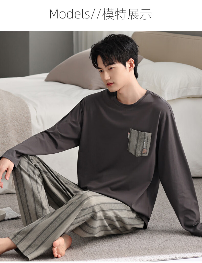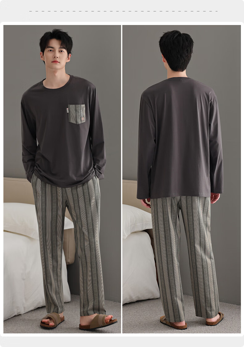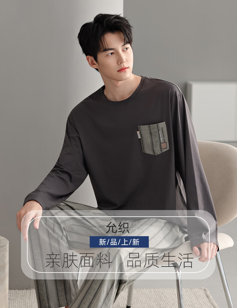 允织睡衣男纯棉春秋季长袖家居服男士睡衣秋冬薄款休闲大码可外穿套装 91092-碳灰 M (165) :建议100-120斤穿着