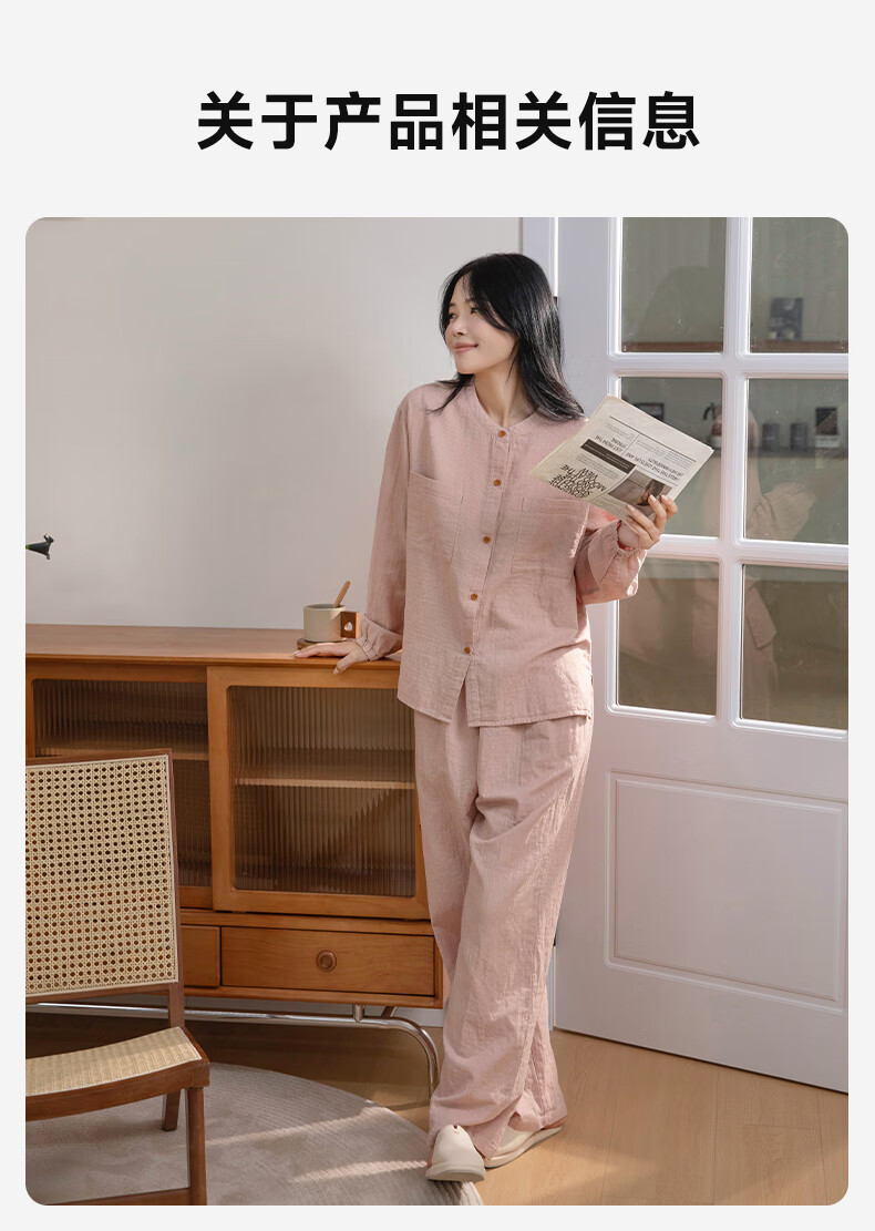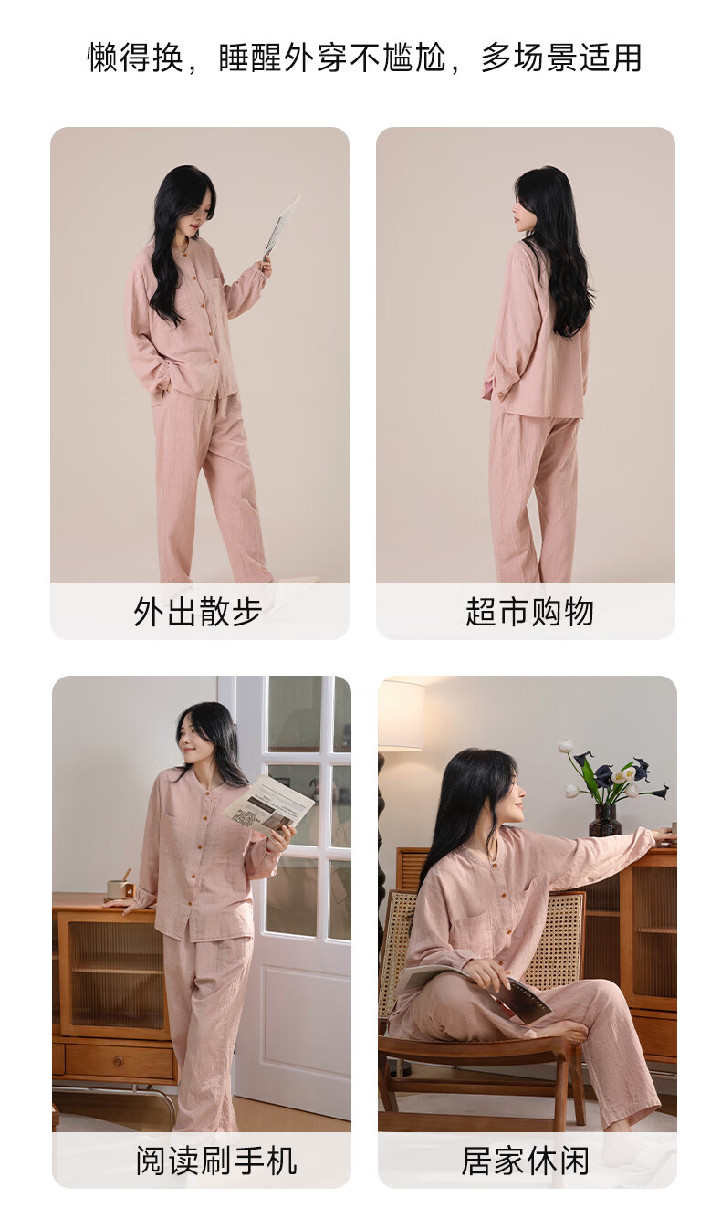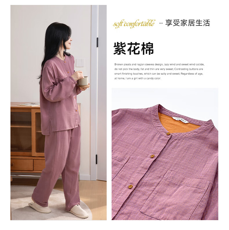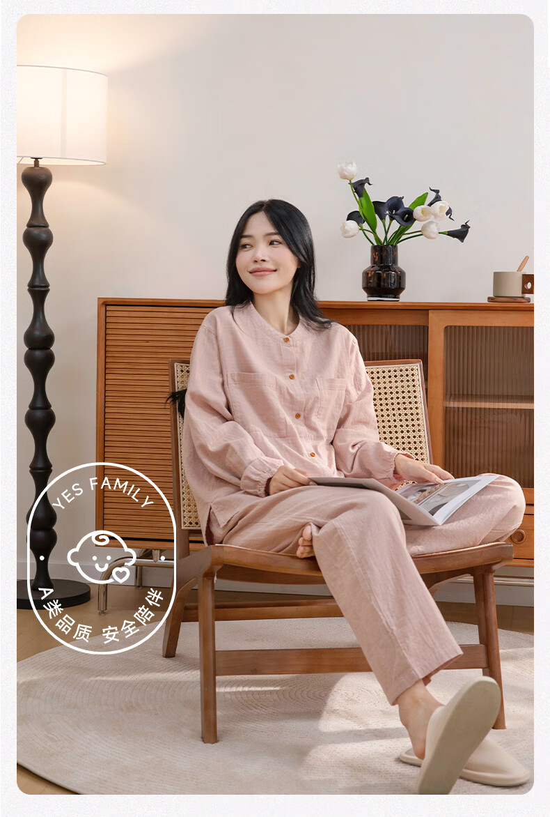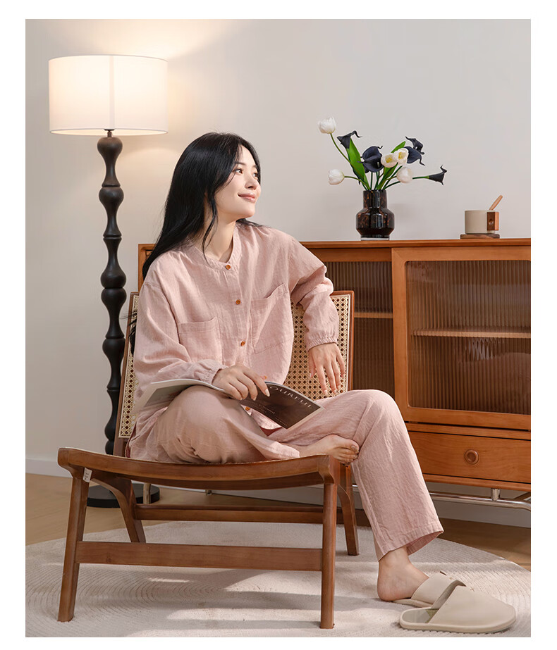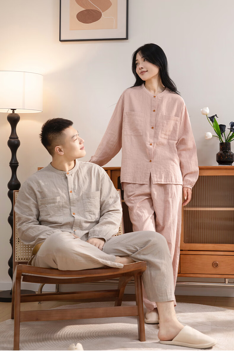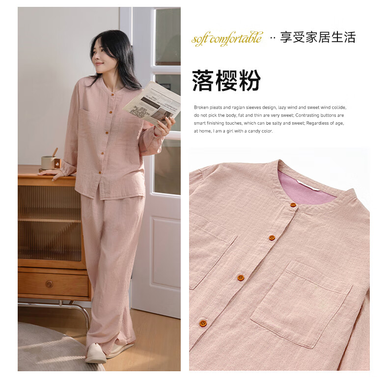 宜色家纯棉睡衣家居服双层纱织情侣家居服国风立领长袖男女士睡衣可外穿 布衣国风系列-落樱粉 女款套装 M 女80-120斤或男110-140斤