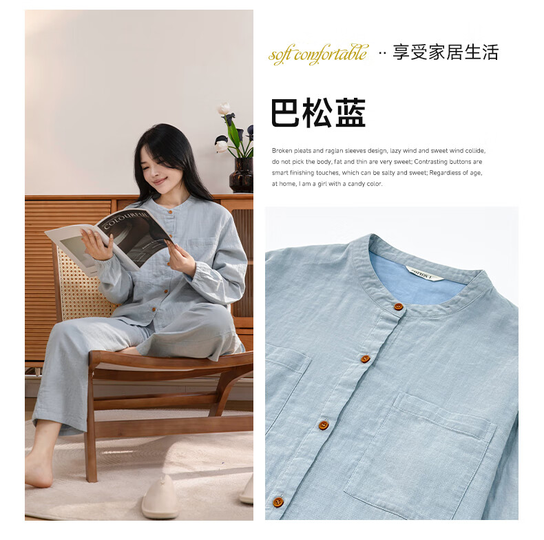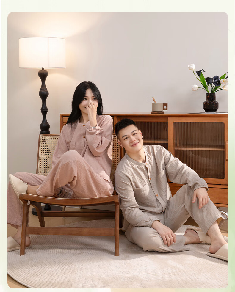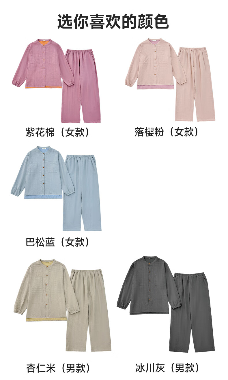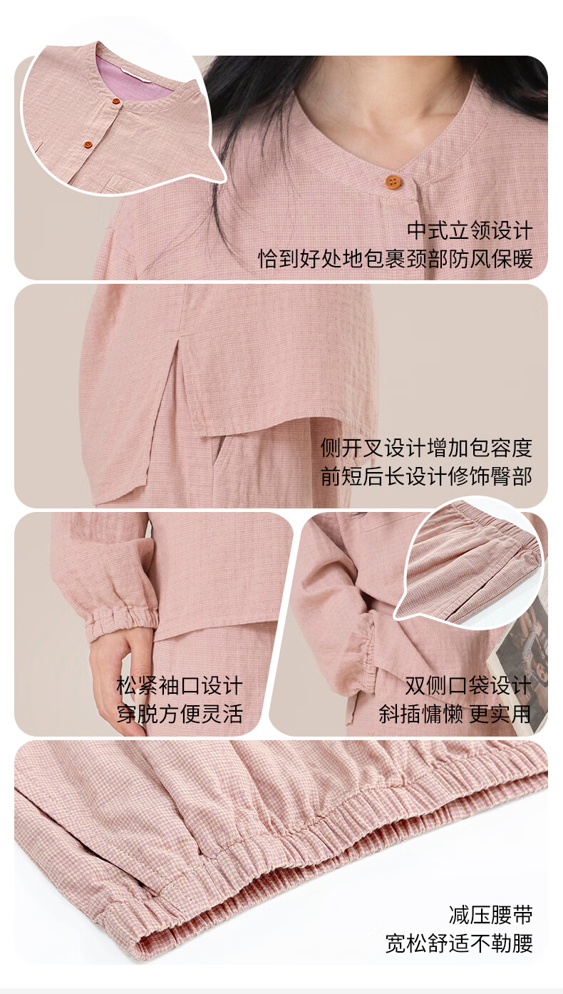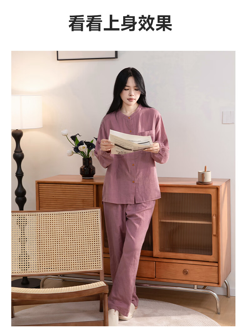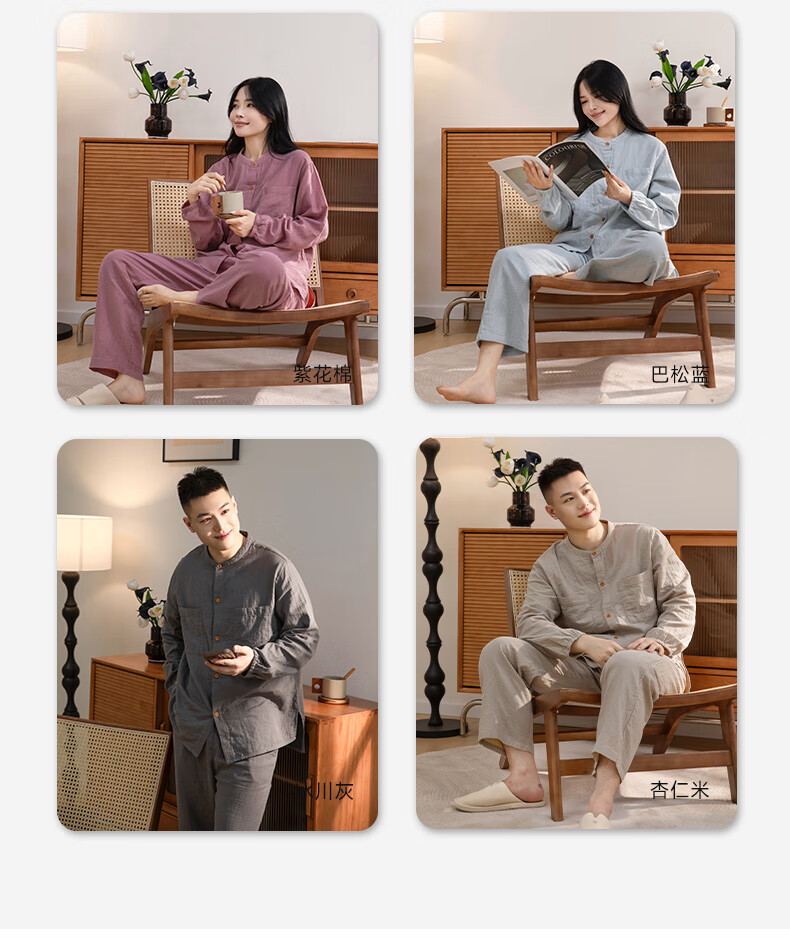 宜色家纯棉睡衣家居服双层纱织情侣家居服国风立领长袖男女士睡衣可外穿 布衣国风系列-落樱粉 女款套装 M 女80-120斤或男110-140斤