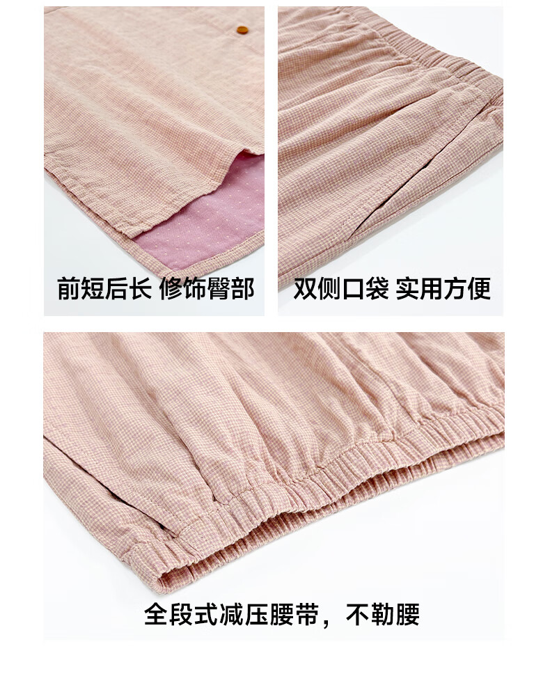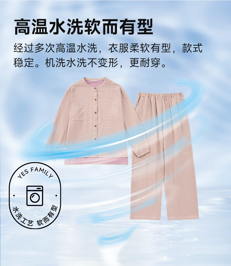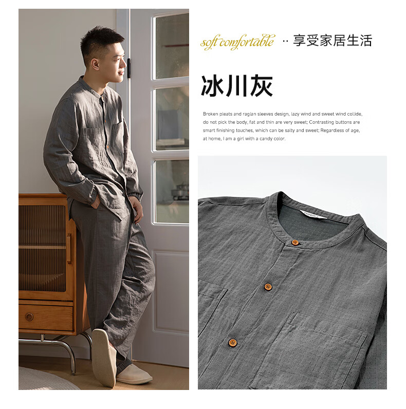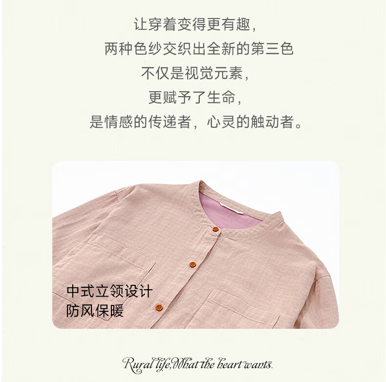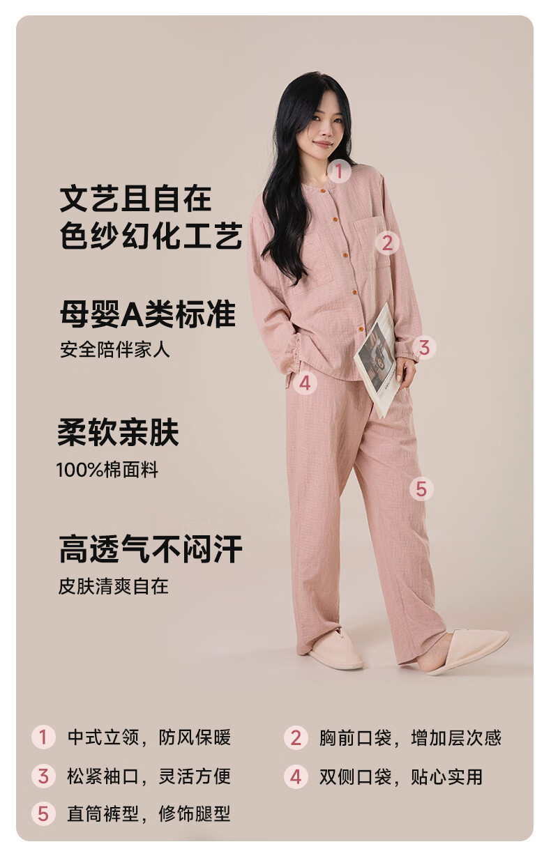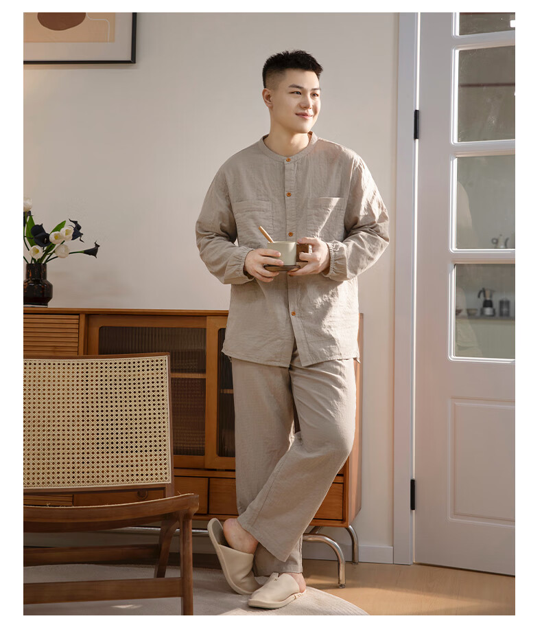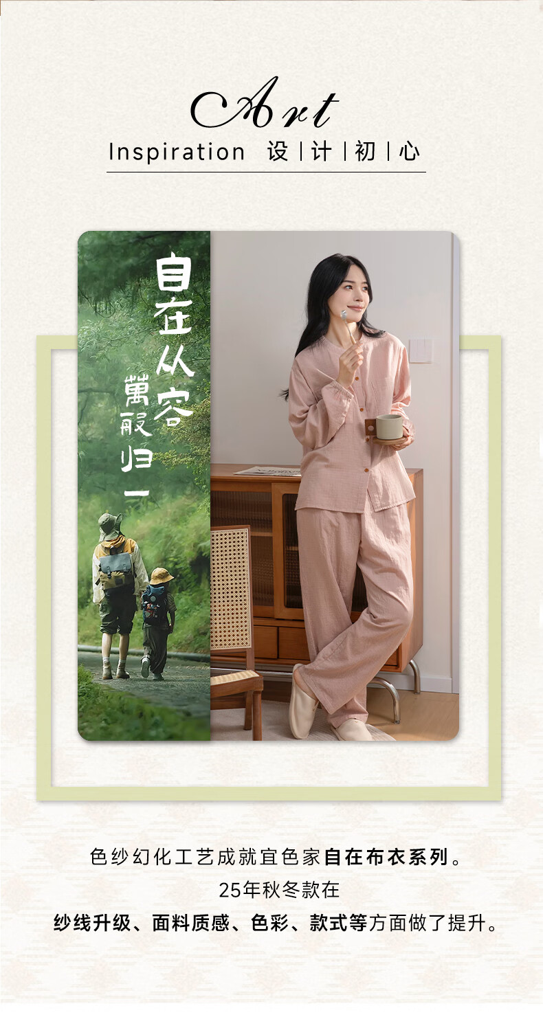 宜色家纯棉睡衣家居服双层纱织情侣家居服国风立领长袖男女士睡衣可外穿 布衣国风系列-落樱粉 女款套装 M 女80-120斤或男110-140斤