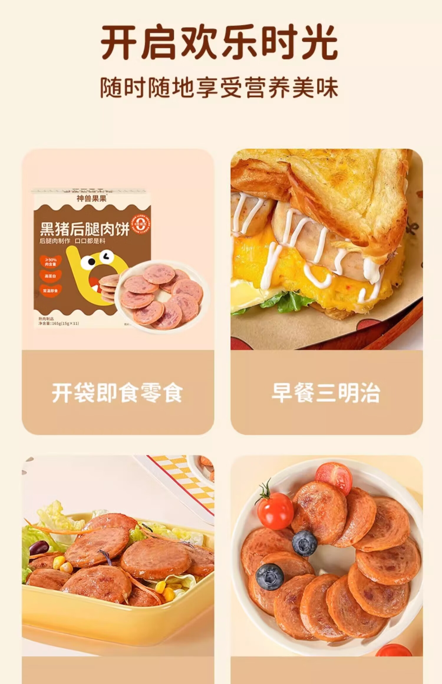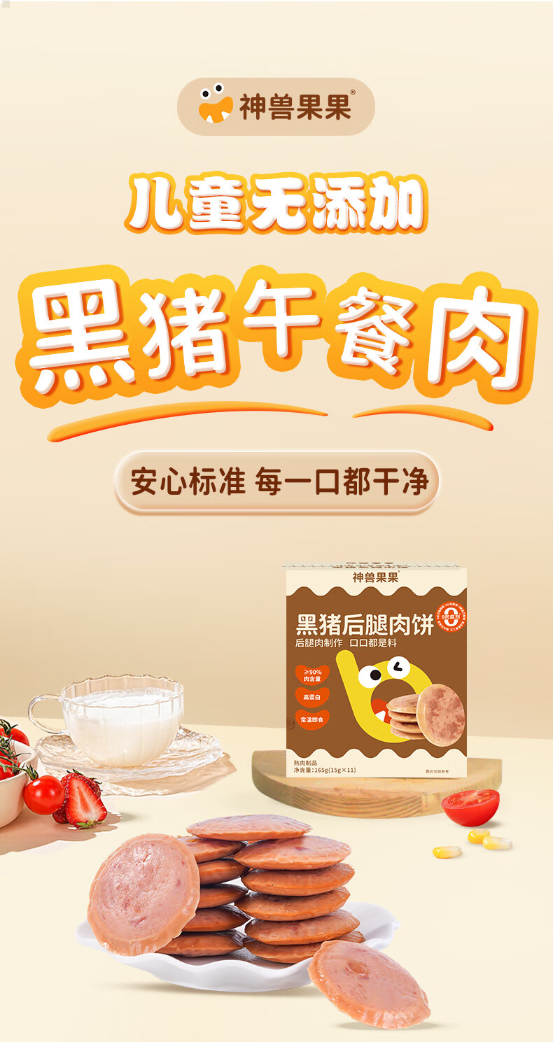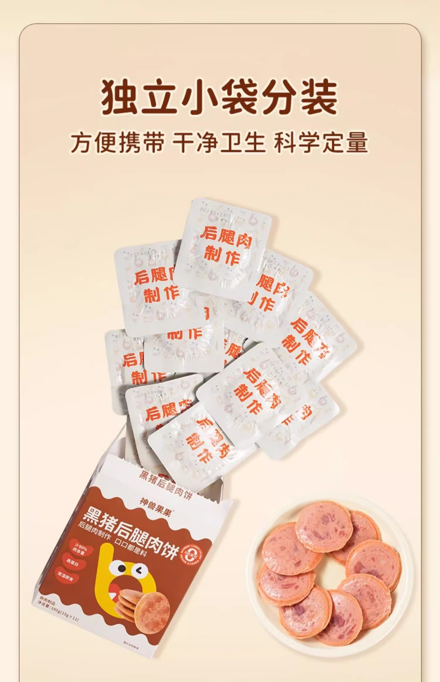 神兽果果黑猪午餐肉儿童零食独立包装即食0添加白砂糖【≥90%后腿肉】 【11袋装】黑猪后腿肉饼-原味