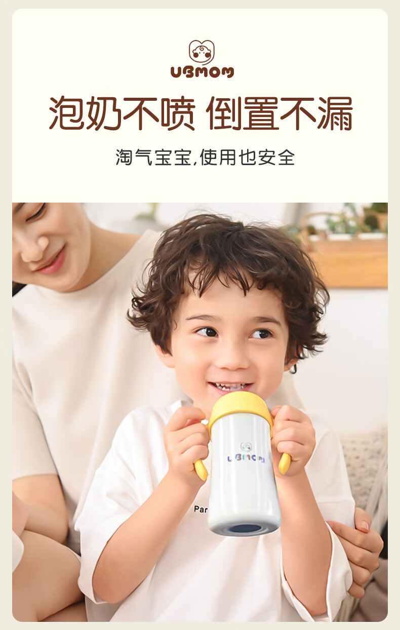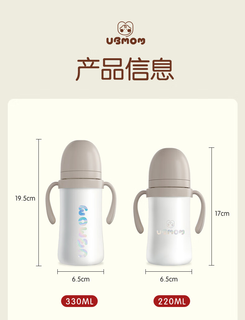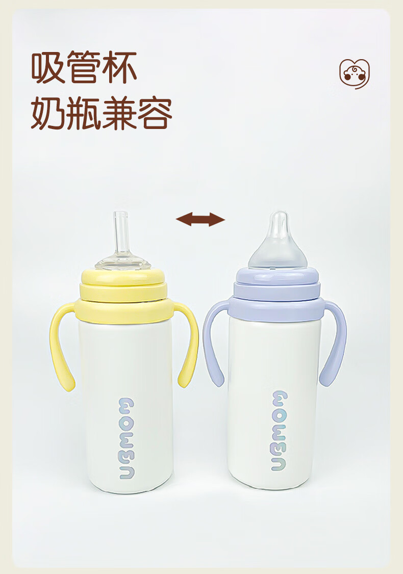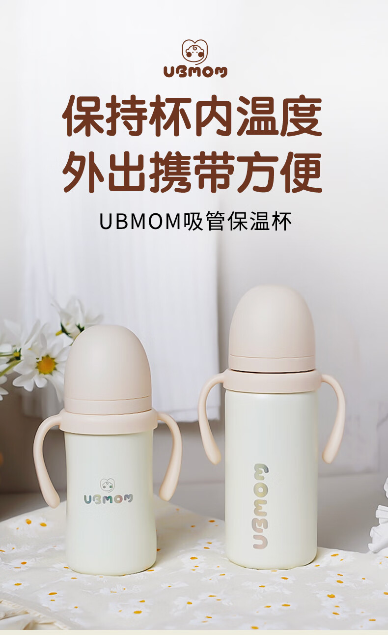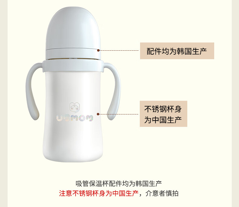 UBMOM韩国婴儿保温杯小月龄6月以上宝宝儿童冲奶不锈钢学饮杯吸管杯 白色 220ml