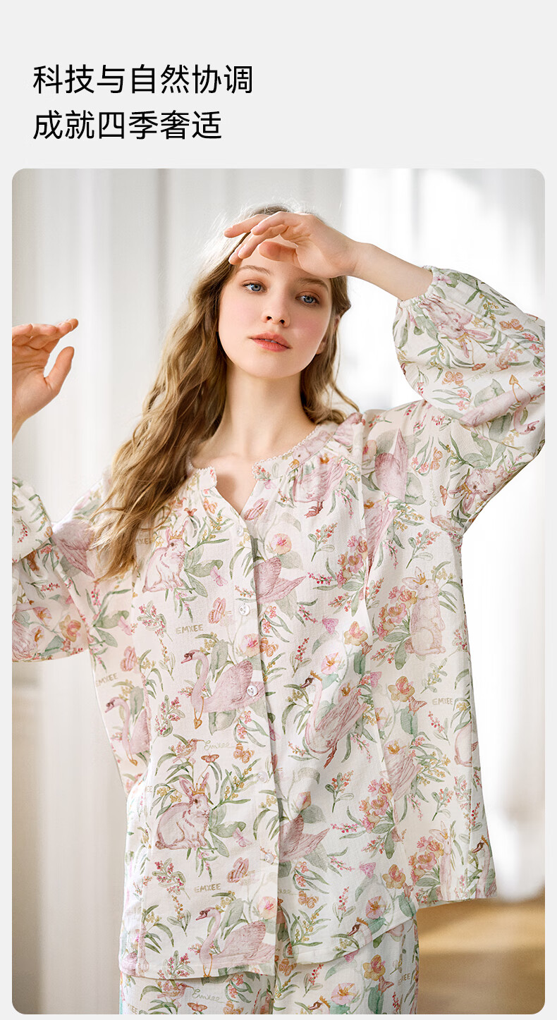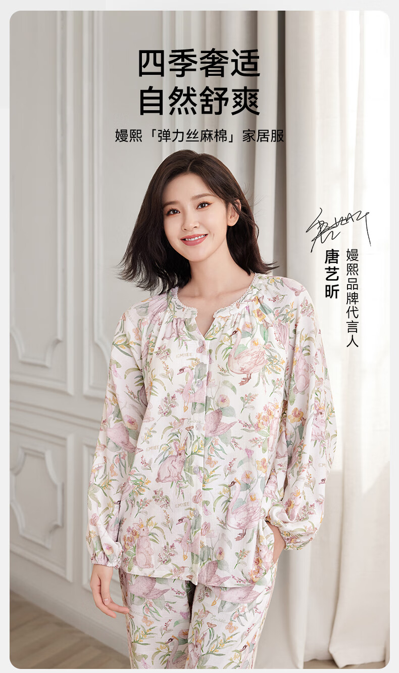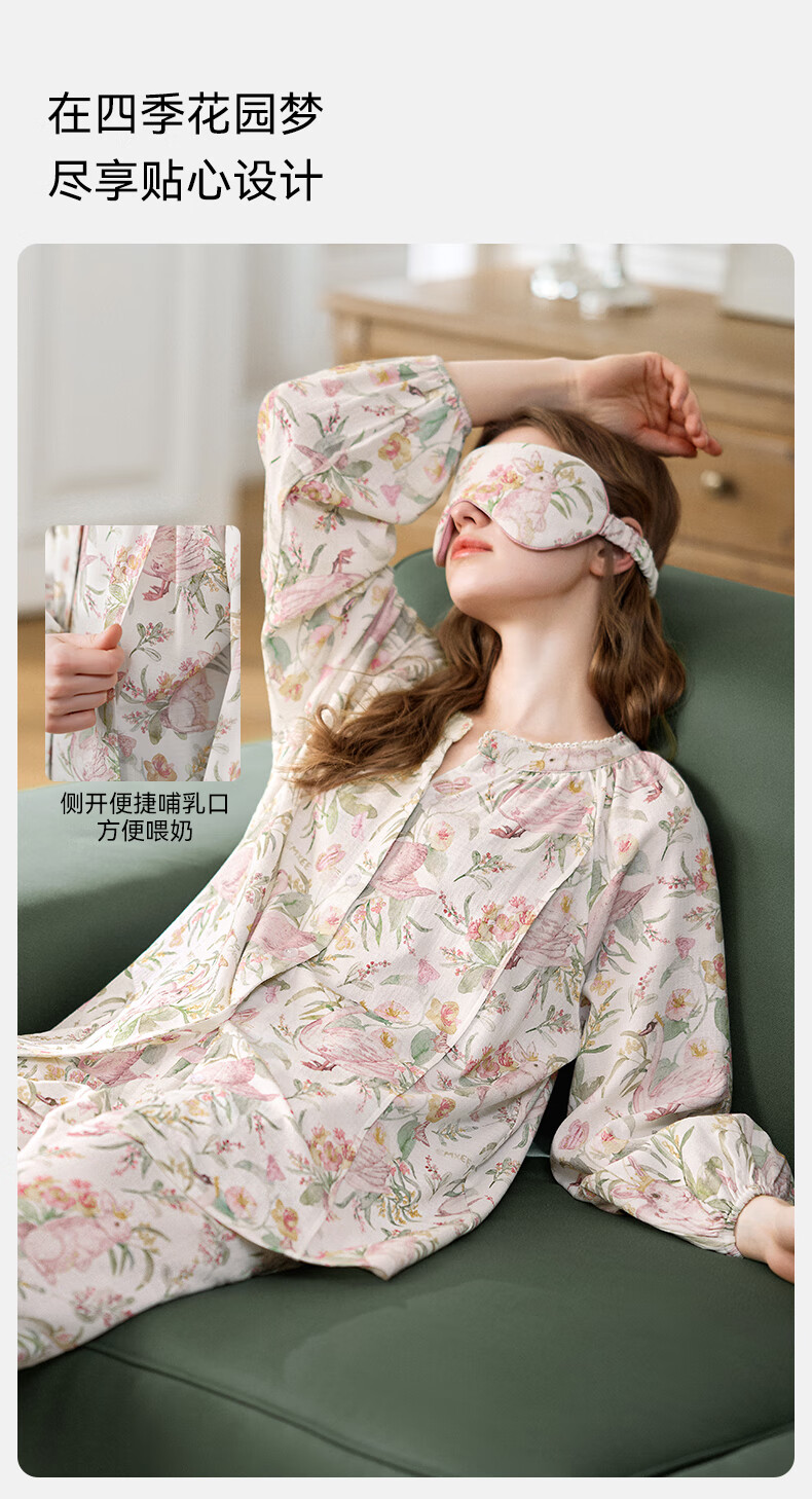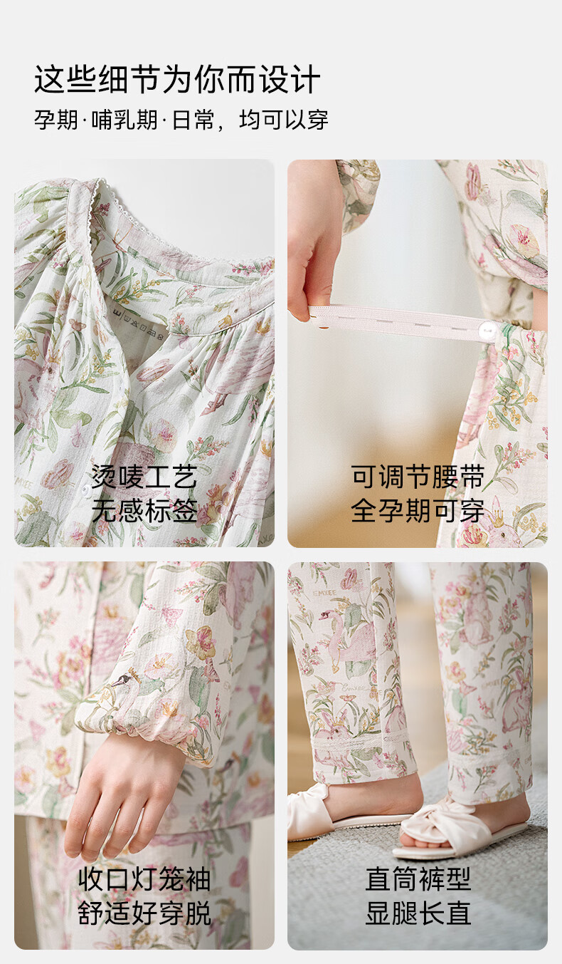 嫚熙(EMXEE)【唐艺昕同款】春夏孕妇丝麻棉哺乳睡衣产妇胸垫月子服家居服L码