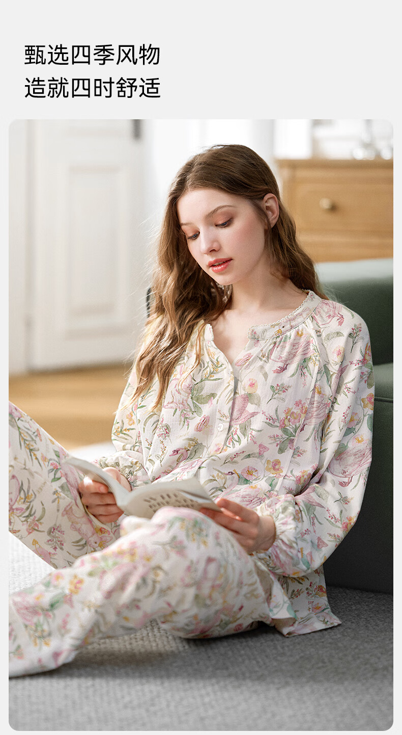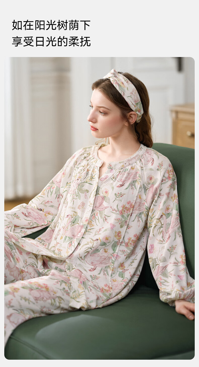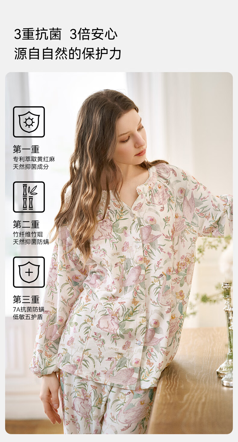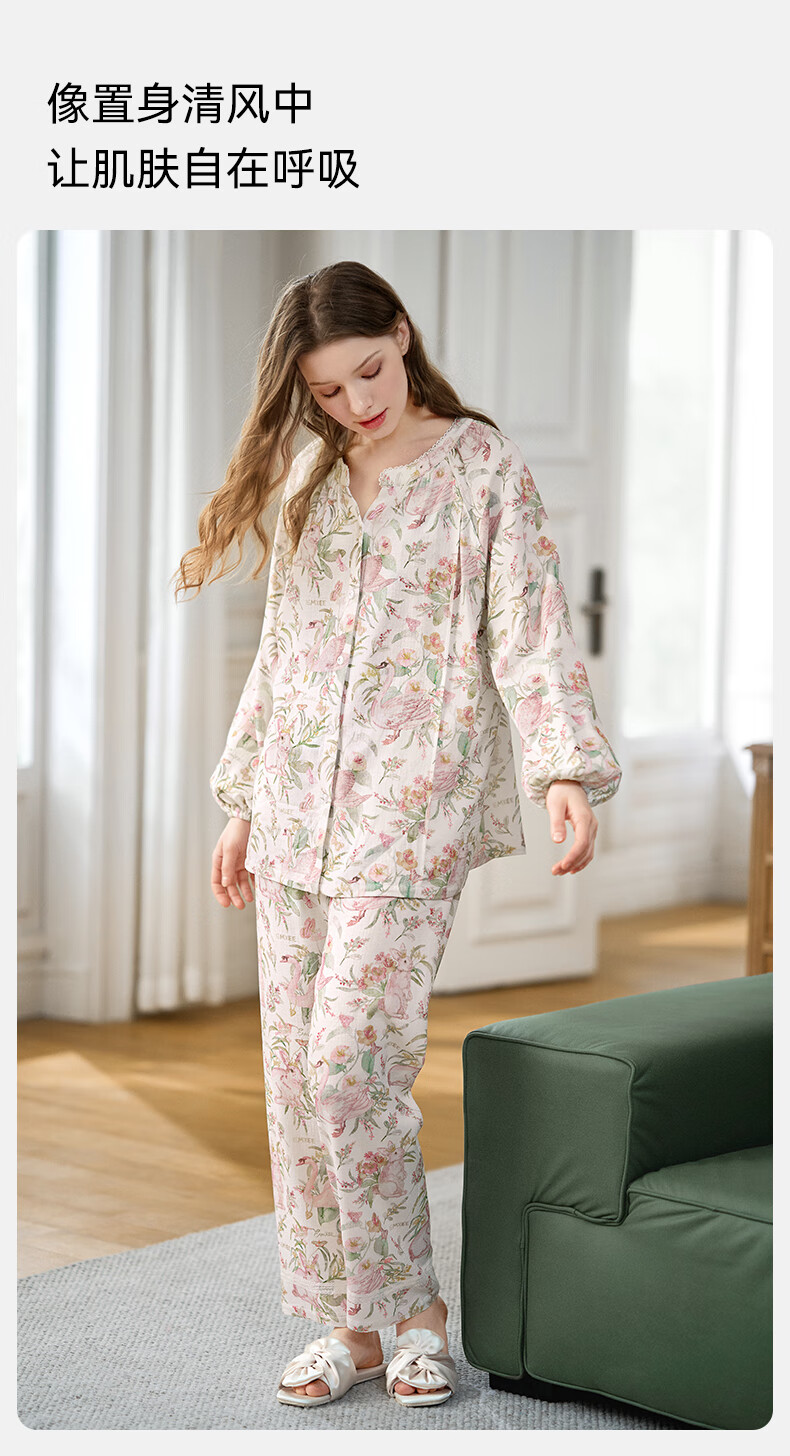 嫚熙(EMXEE)【唐艺昕同款】春夏孕妇丝麻棉哺乳睡衣产妇胸垫月子服家居服L码
