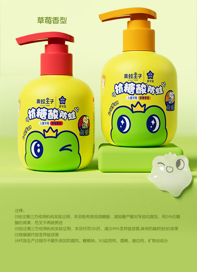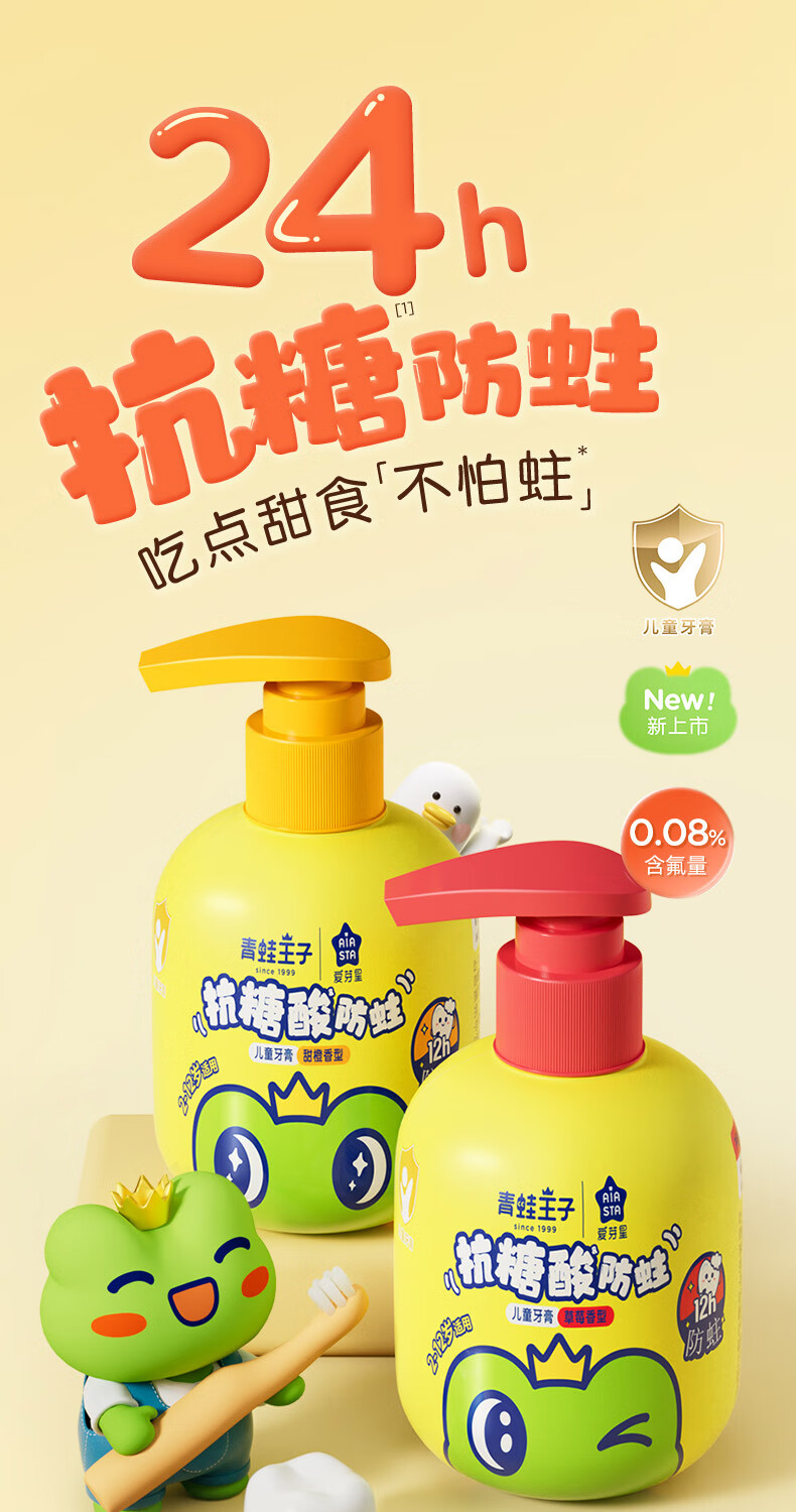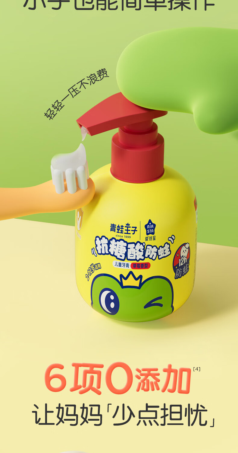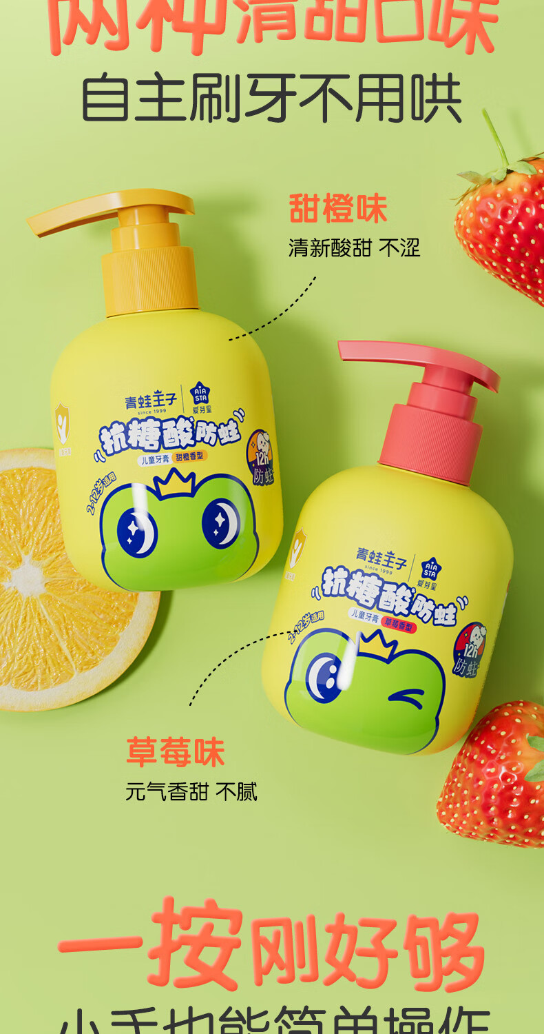 青蛙王子儿童牙膏按压式3-6-12岁 含氟防蛀抗糖酸 宝宝牙膏 草莓+香橙300g