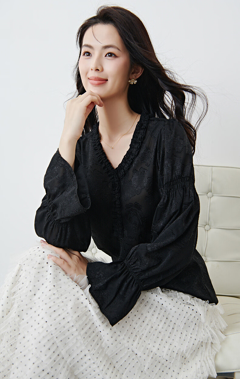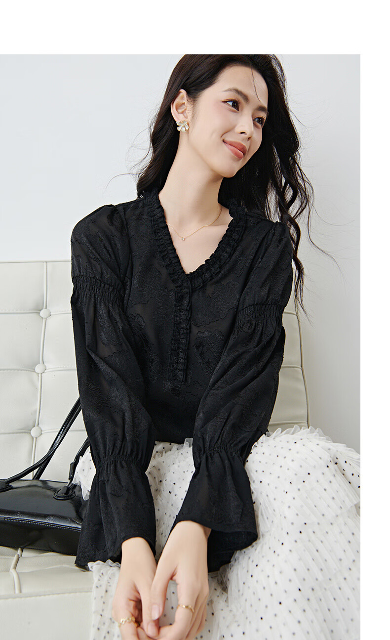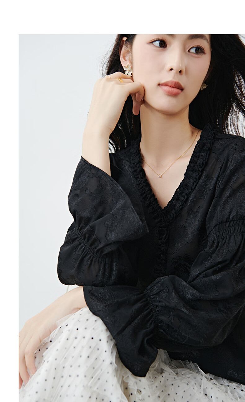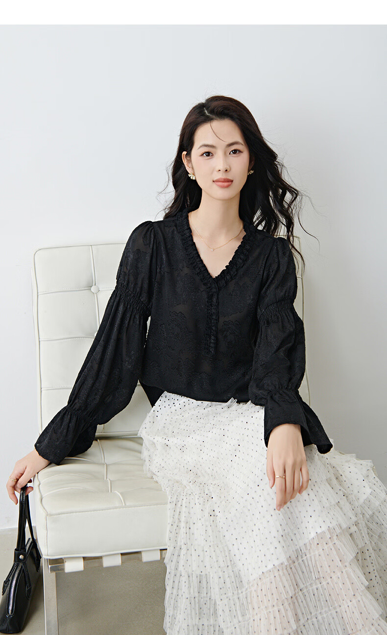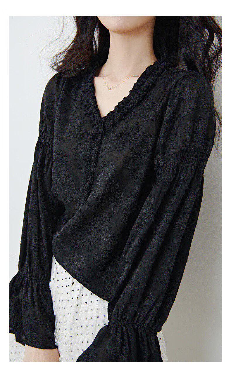 晚白2026年春款法式花边灯笼袖上衣暗纹提花轻奢肌理感复古宫廷风衬衫 黑色 L