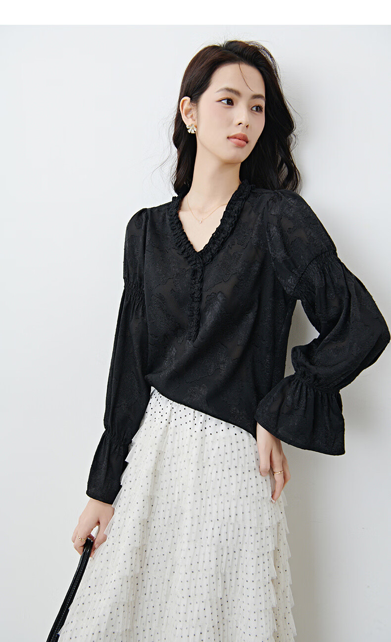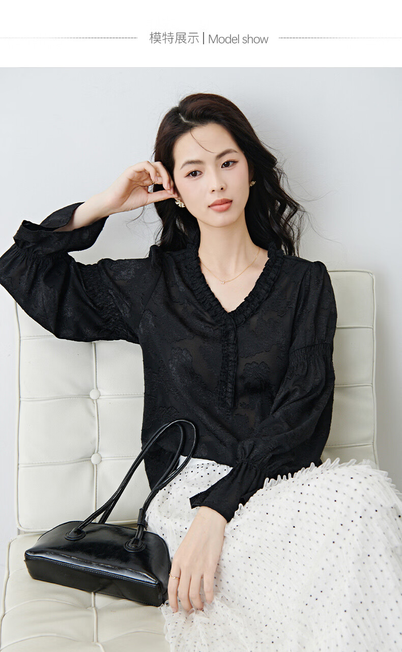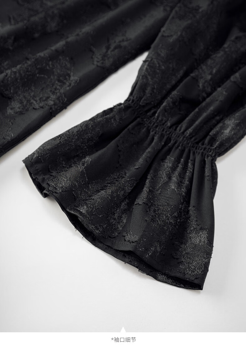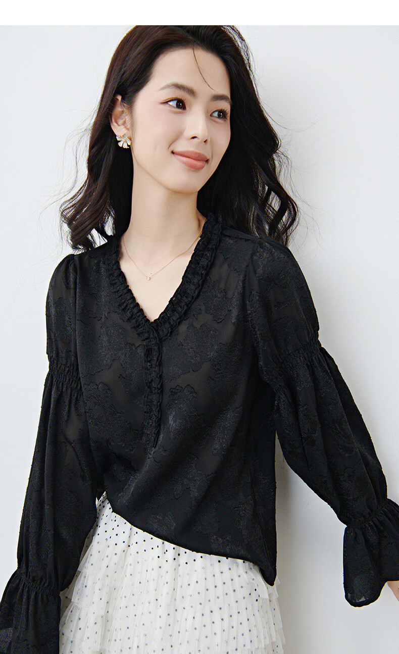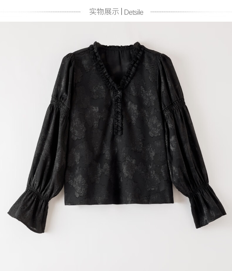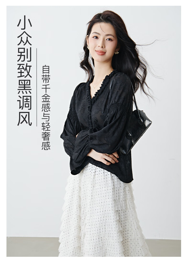 晚白2026年春款法式花边灯笼袖上衣暗纹提花轻奢肌理感复古宫廷风衬衫 黑色 L