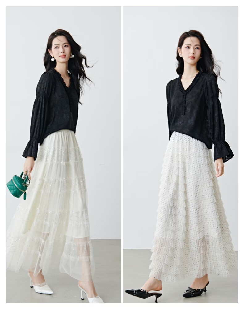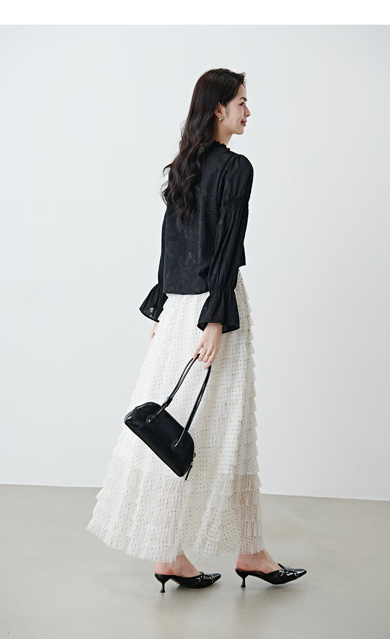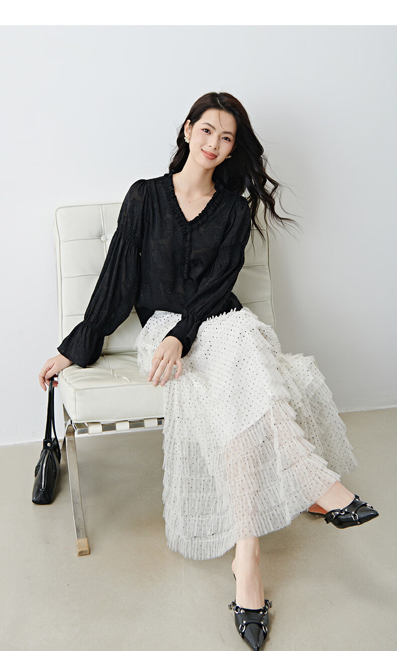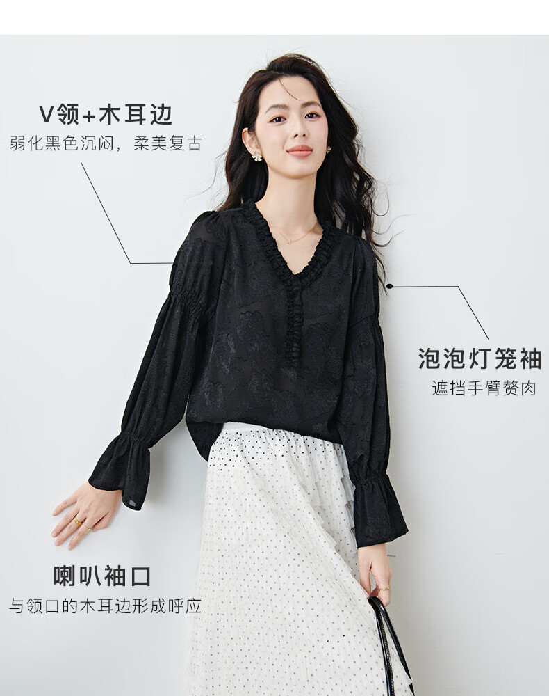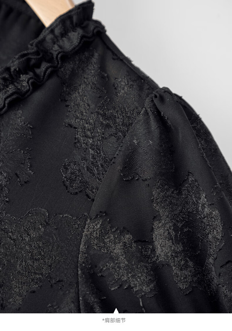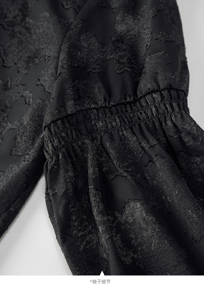 晚白2026年春款法式花边灯笼袖上衣暗纹提花轻奢肌理感复古宫廷风衬衫 黑色 L