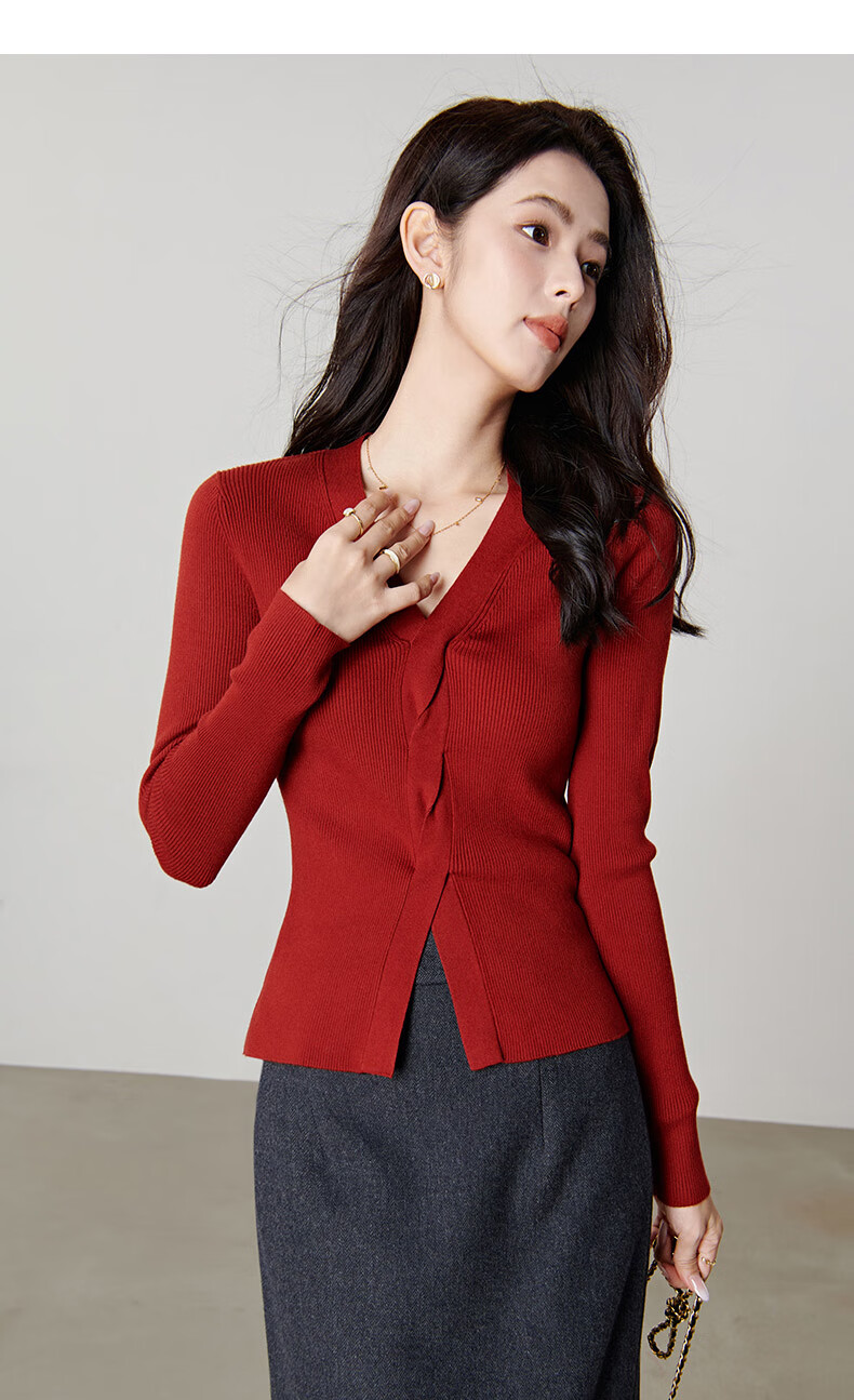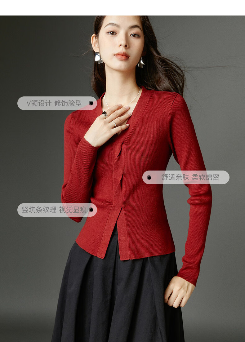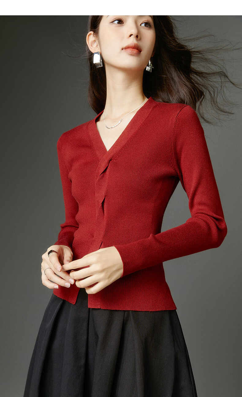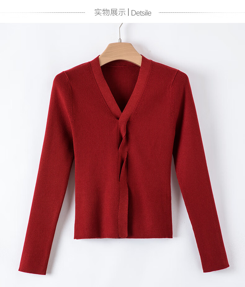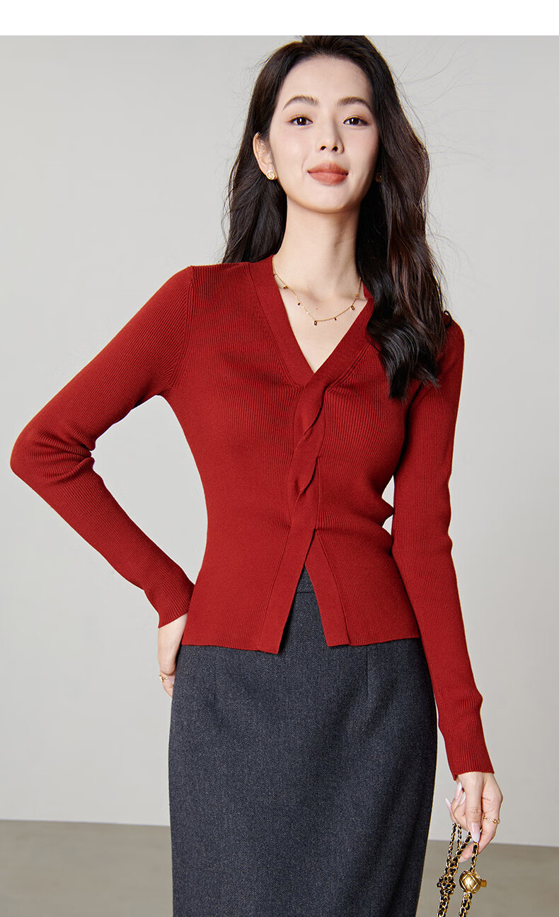 晚白【新品】2026春款时尚设计感骐骥红毛衣V领显瘦套头针织衫 红色 L