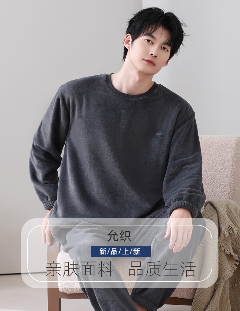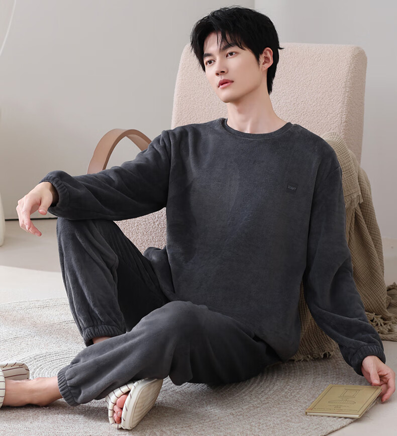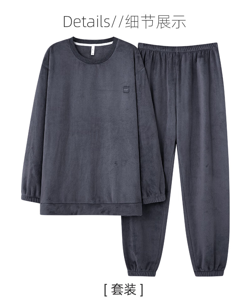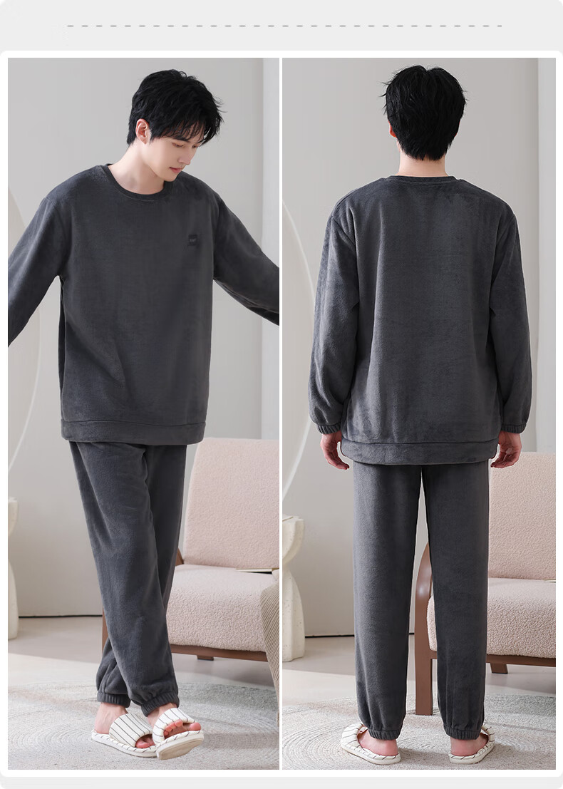 允织法兰绒睡衣男士冬季加厚加绒珊瑚绒秋冬款天男款可外穿家居服套装 4905-黑灰 L (170) :建议100-135斤穿着