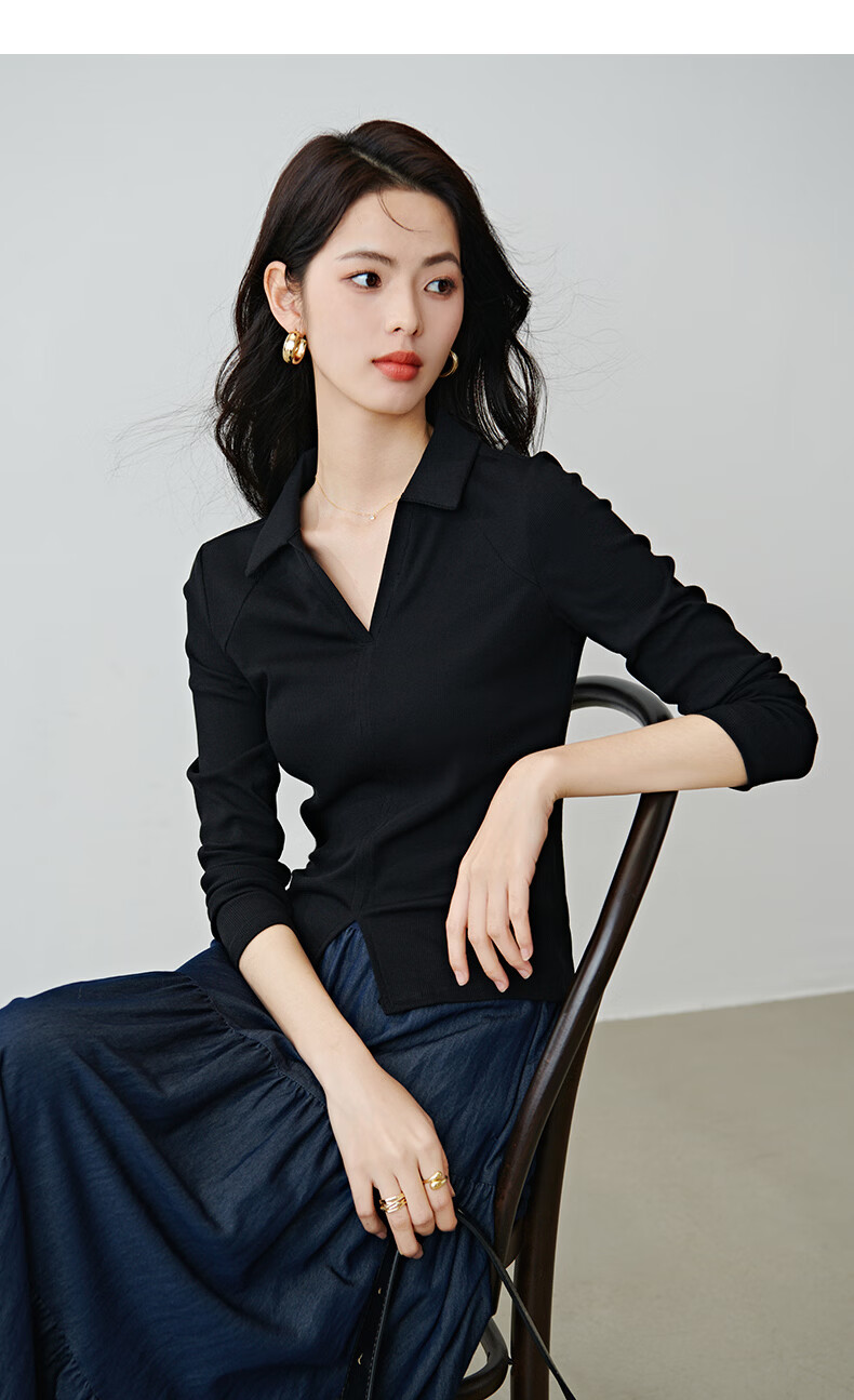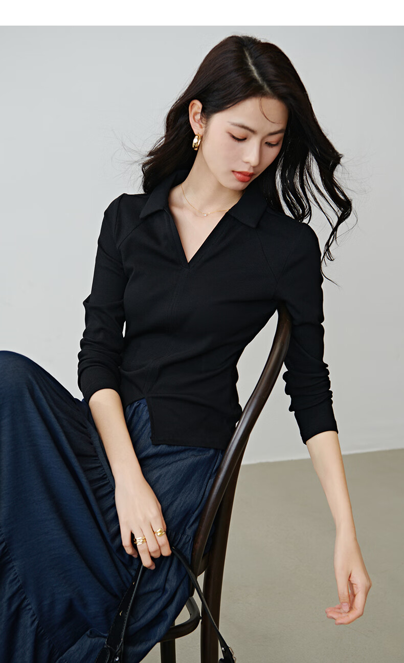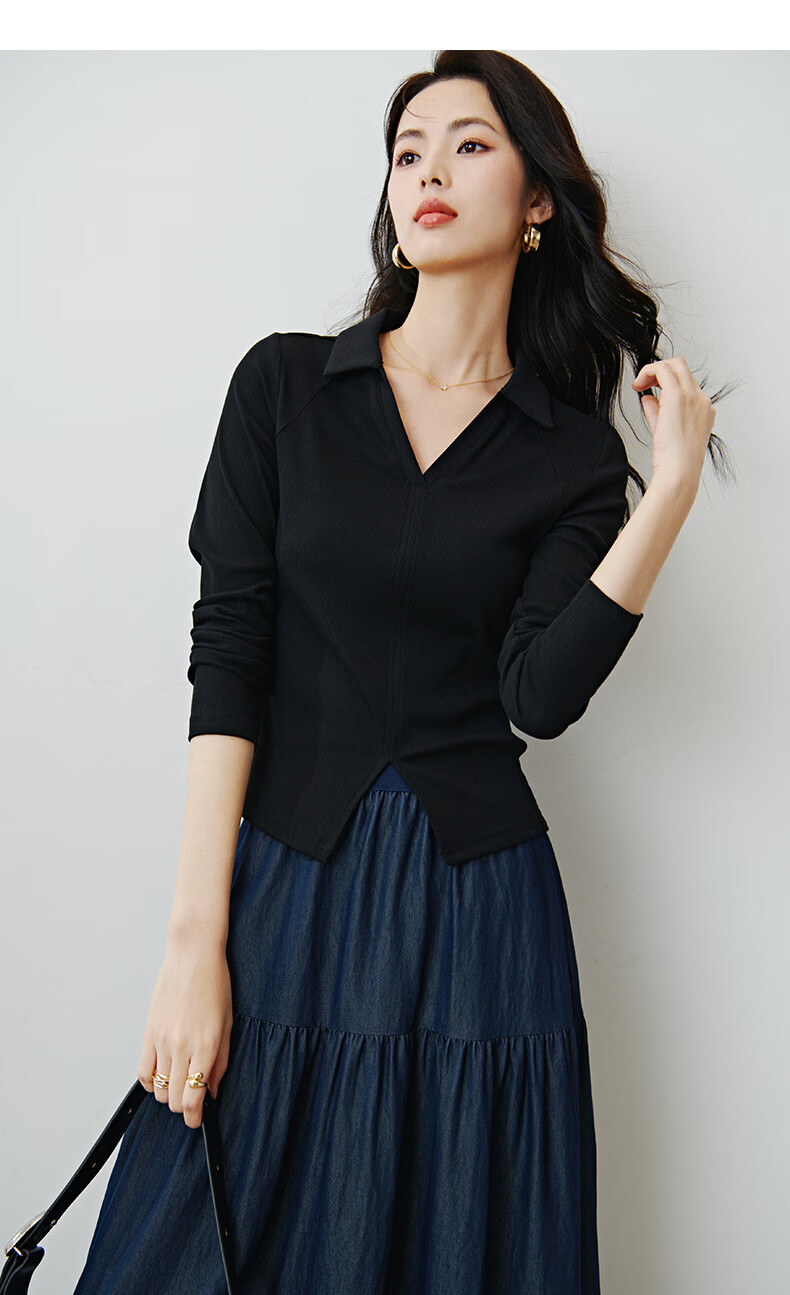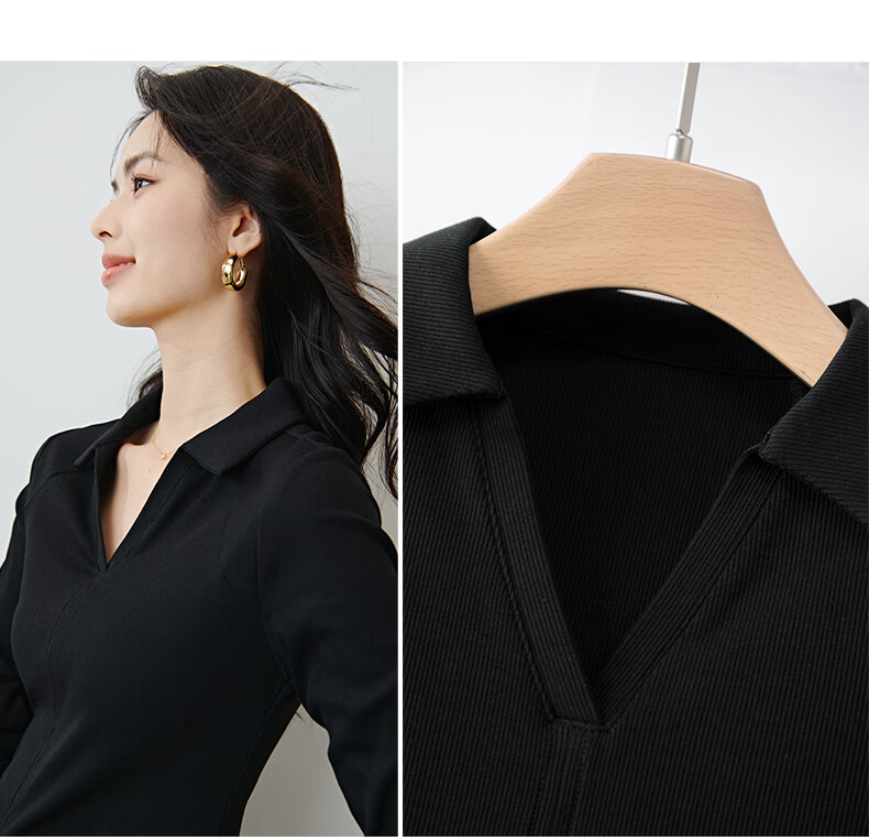 晚白【新品】2026年春款极简风显瘦V领棉感上衣收腰遮肉弹力T恤衫女 黑色 M
