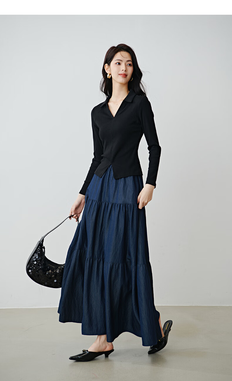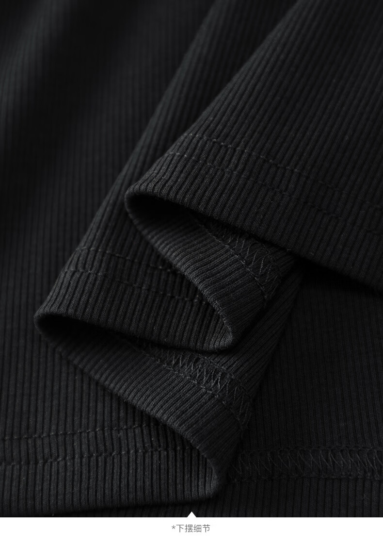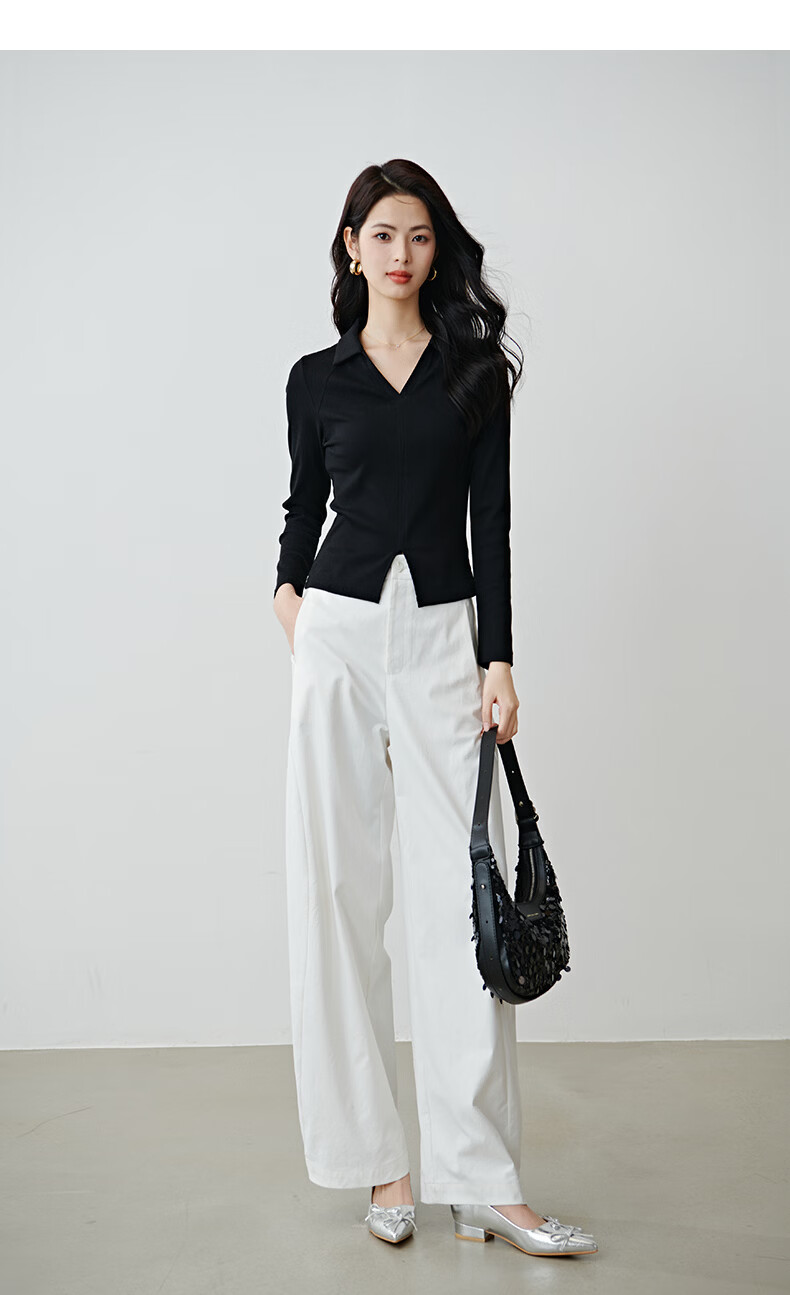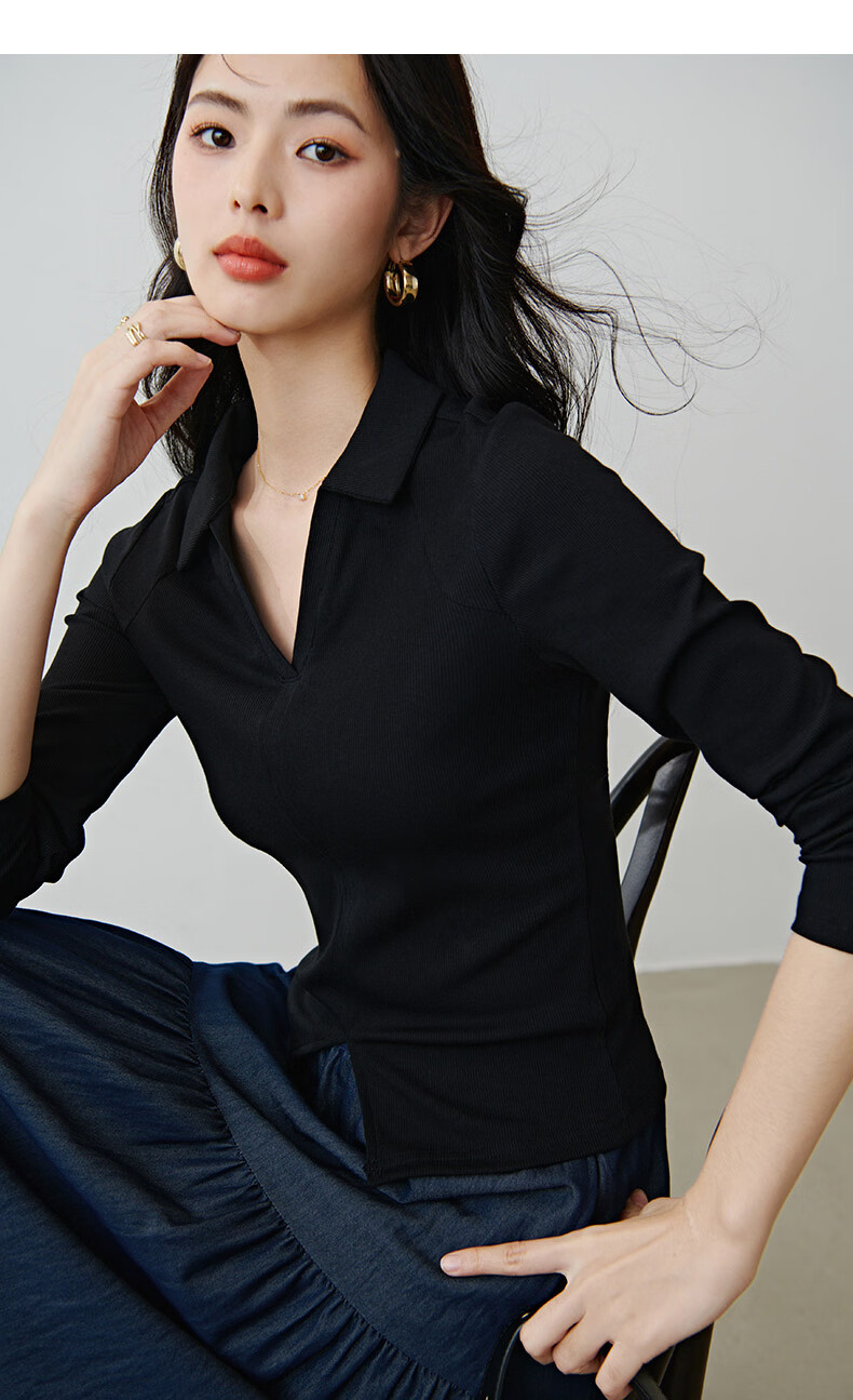 晚白【新品】2026年春款极简风显瘦V领棉感上衣收腰遮肉弹力T恤衫女 黑色 M