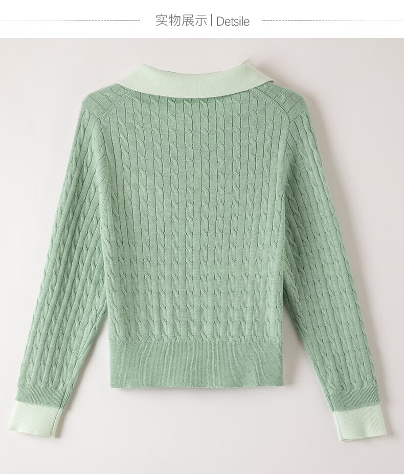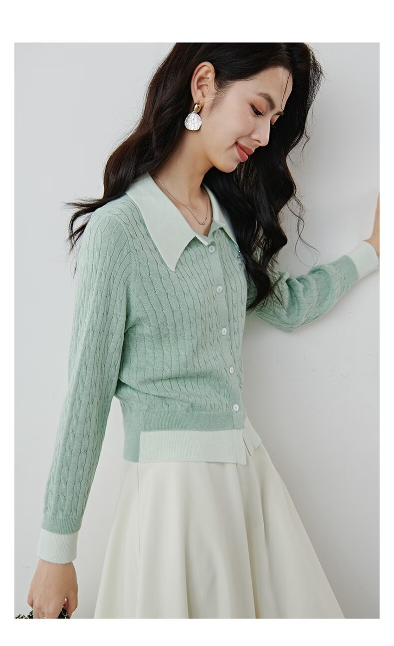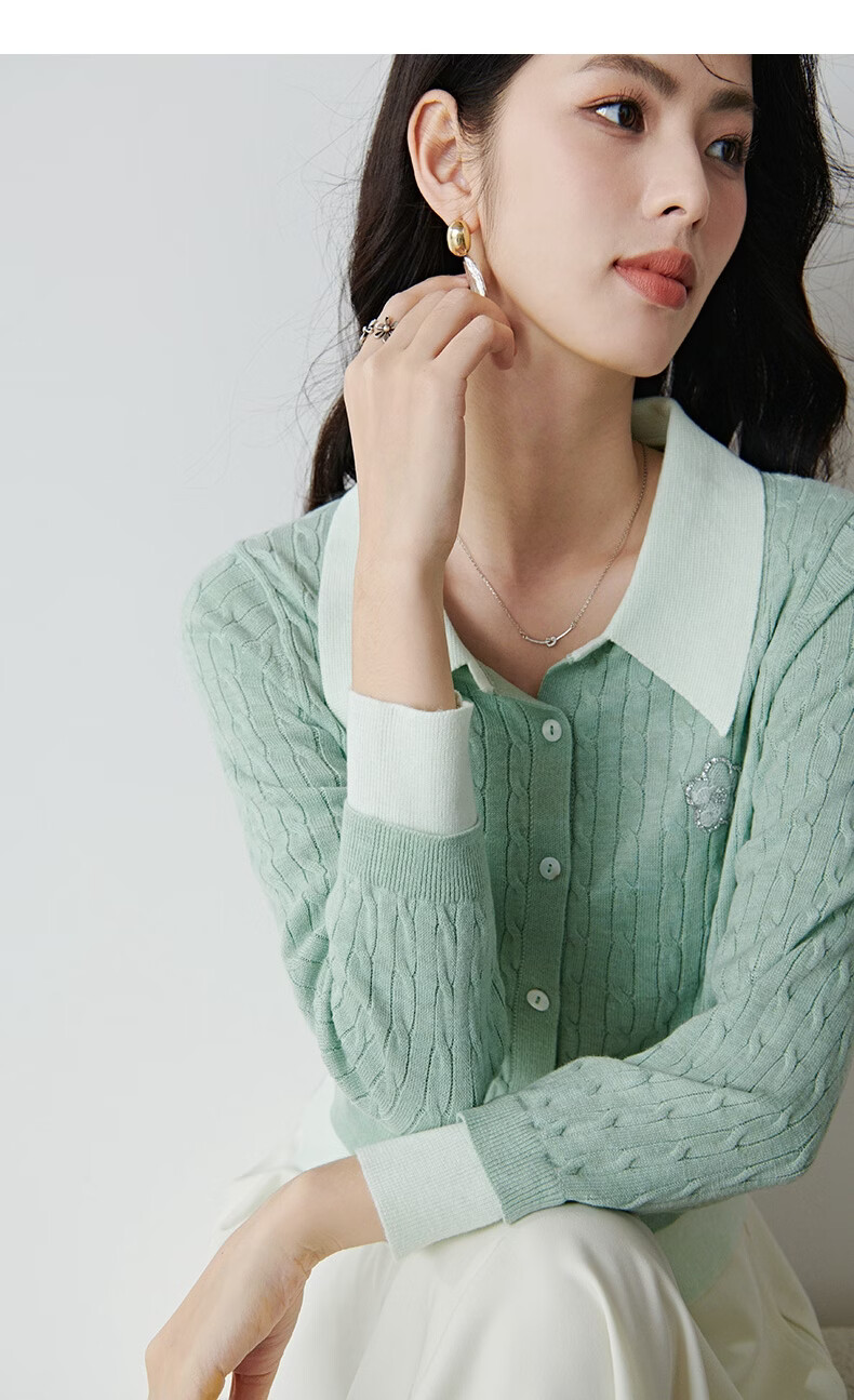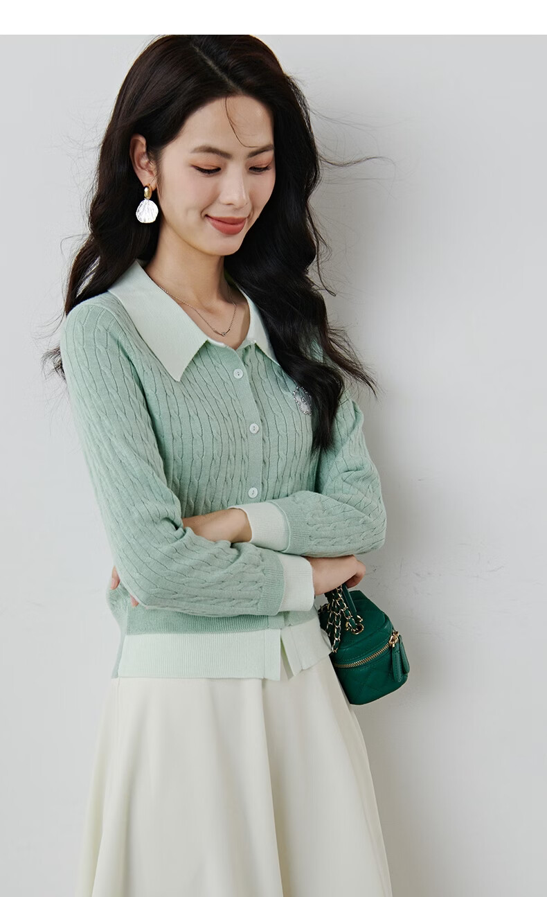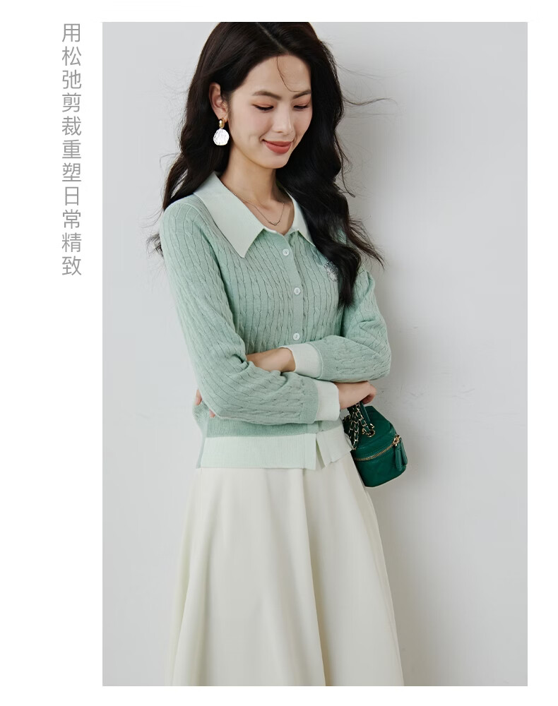 晚白2026年春款薄荷绿显白翻领假两件上衣亲肤舒适撞色绞花针织衫女 浅绿色 M