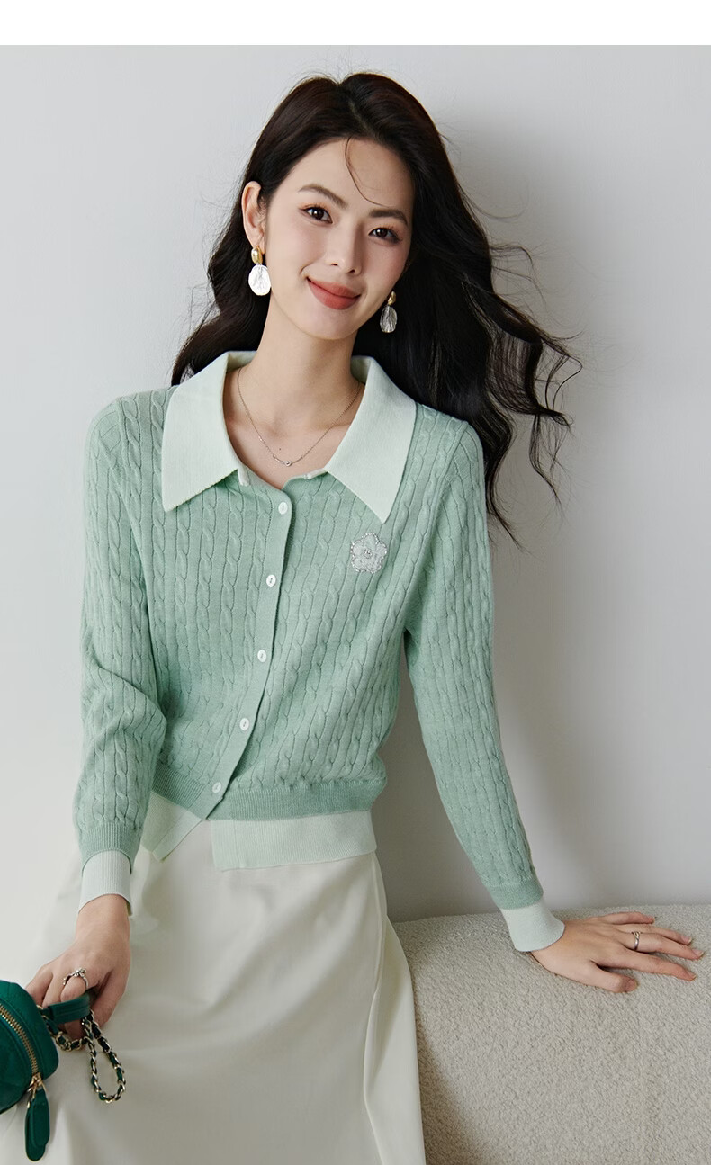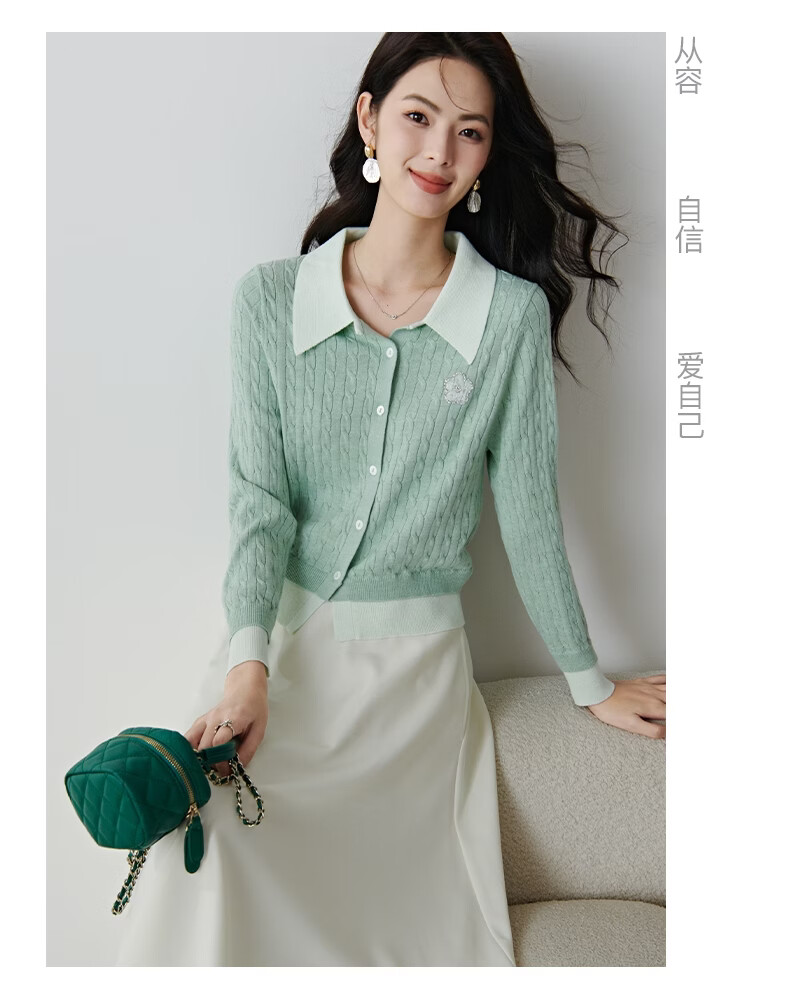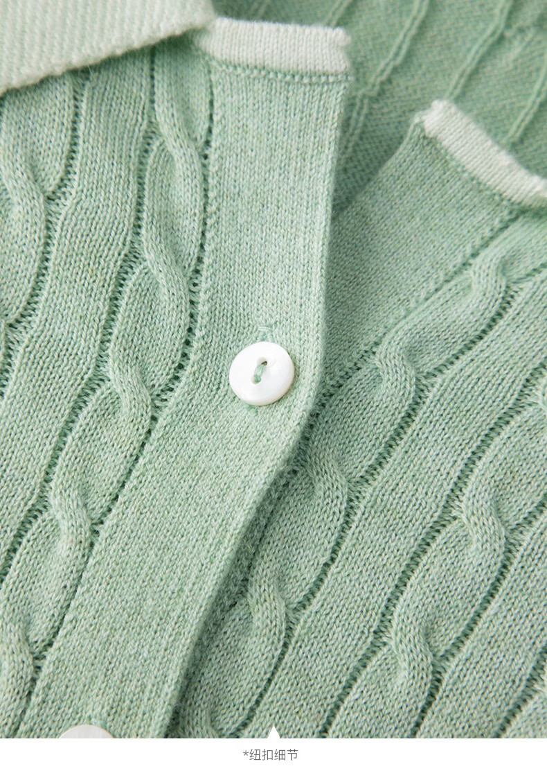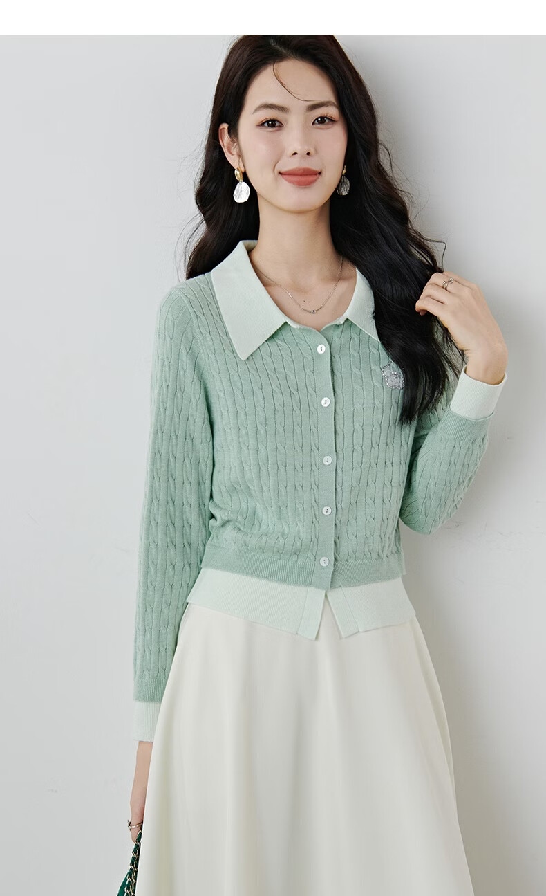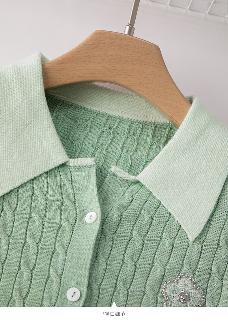 晚白2026年春款薄荷绿显白翻领假两件上衣亲肤舒适撞色绞花针织衫女 浅绿色 M