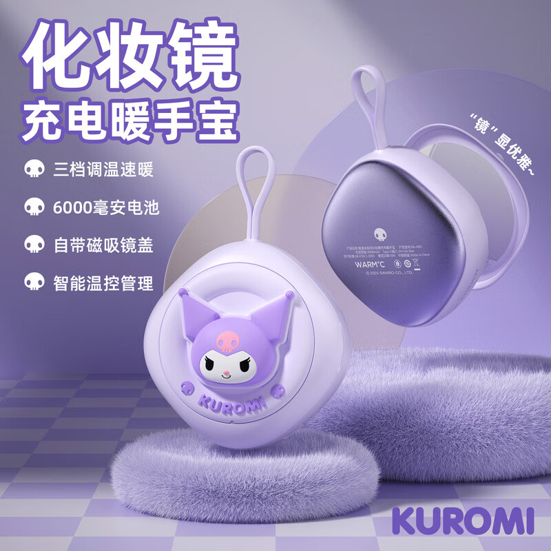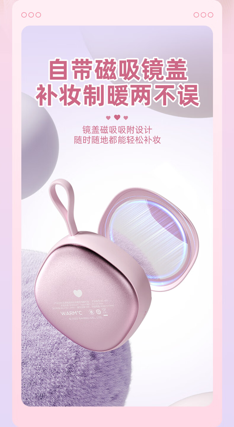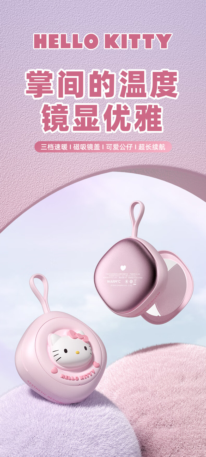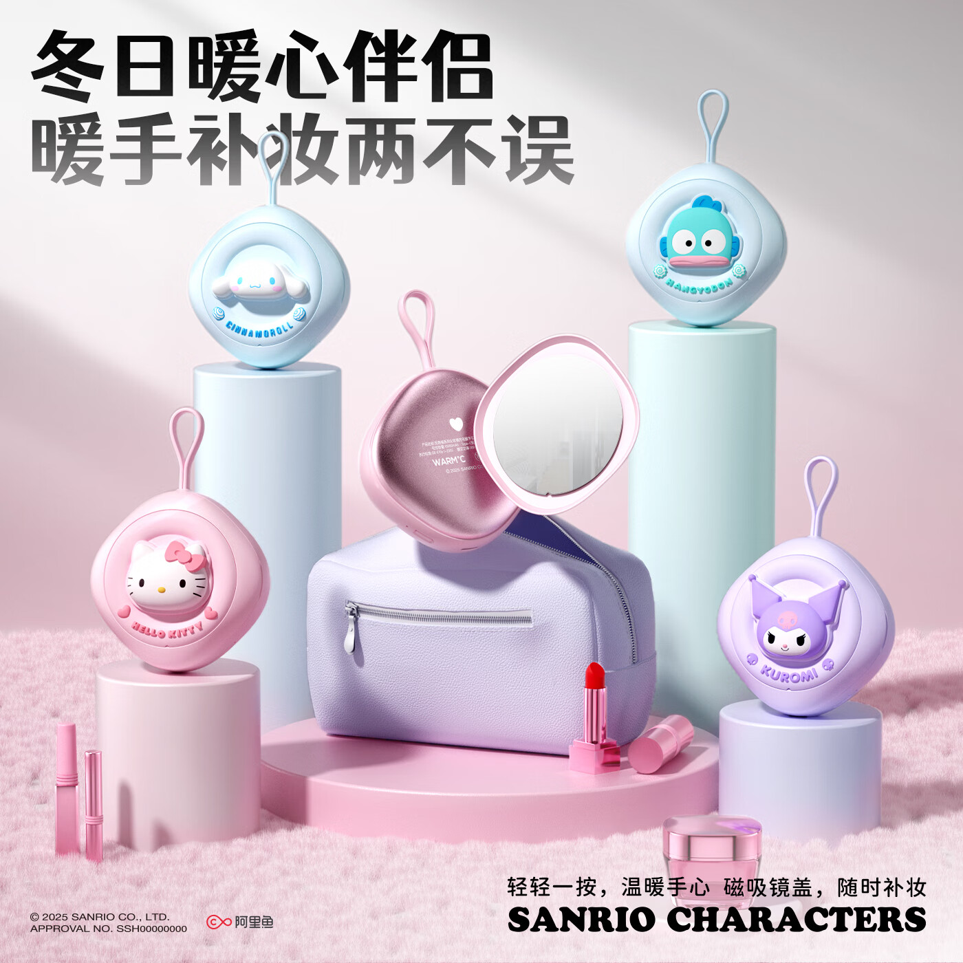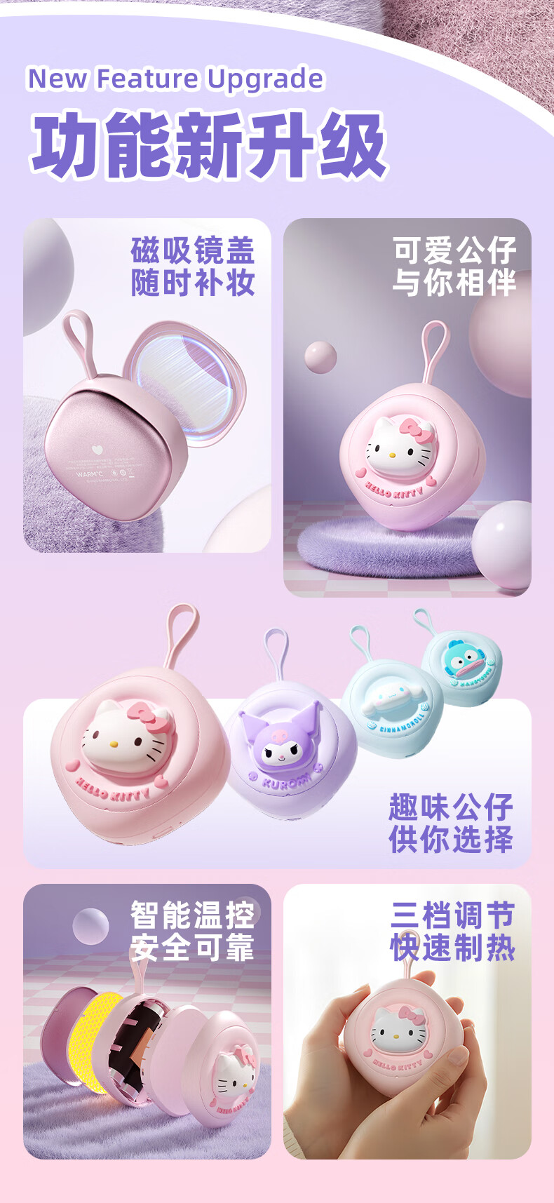Hello Kitty充电暖手宝化妆镜二合一 女生可爱学生党生日礼物情人节礼物库洛米暖手宝容量便携三档速暖充电式 粉色 凯蒂猫暖手宝 大容量6000mAh+磁吸化妆镜+礼袋套装