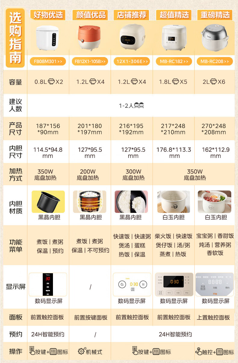 美的(Midea)电饭煲电饭锅小型迷你家用1-2人小容量智能预约多功能微压煲汤小米粥1.8L小饭煲品牌官方RC182