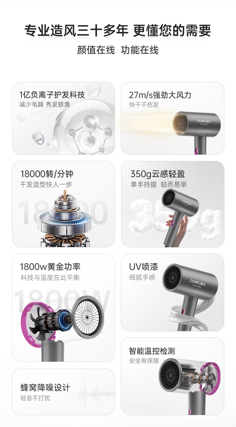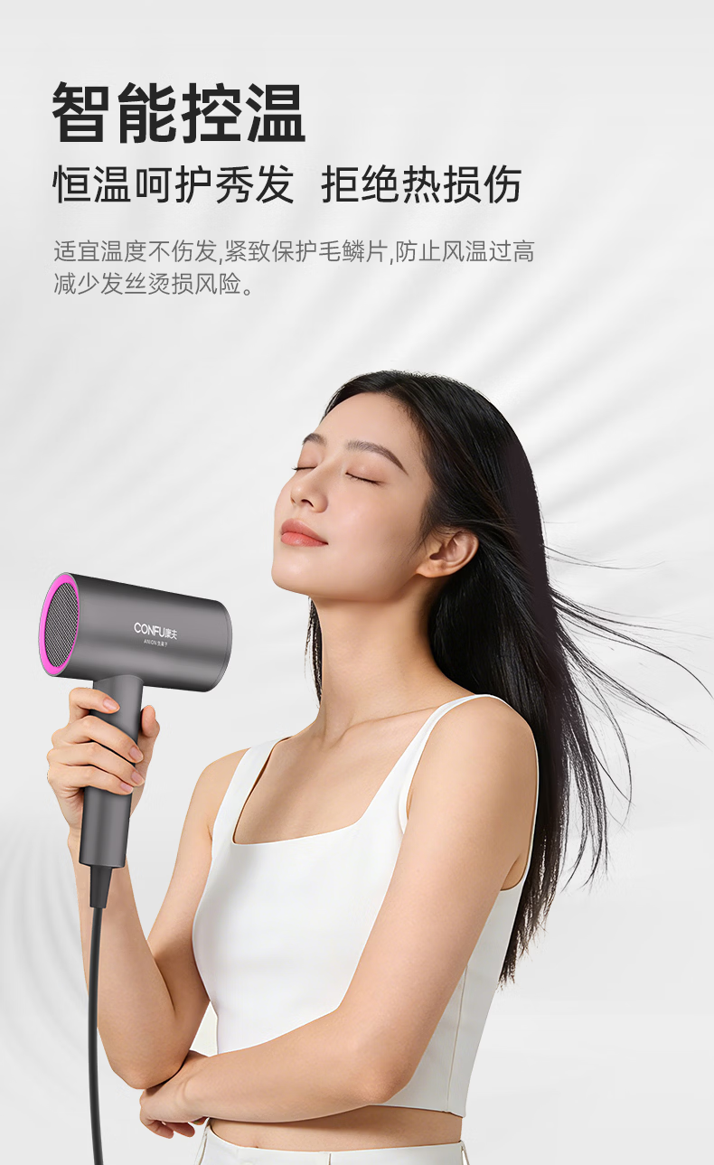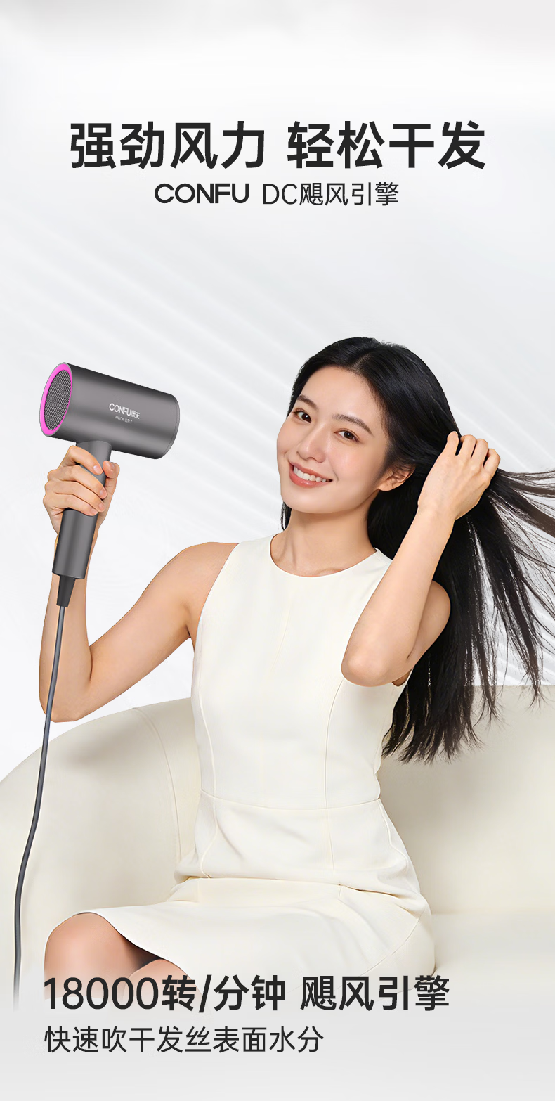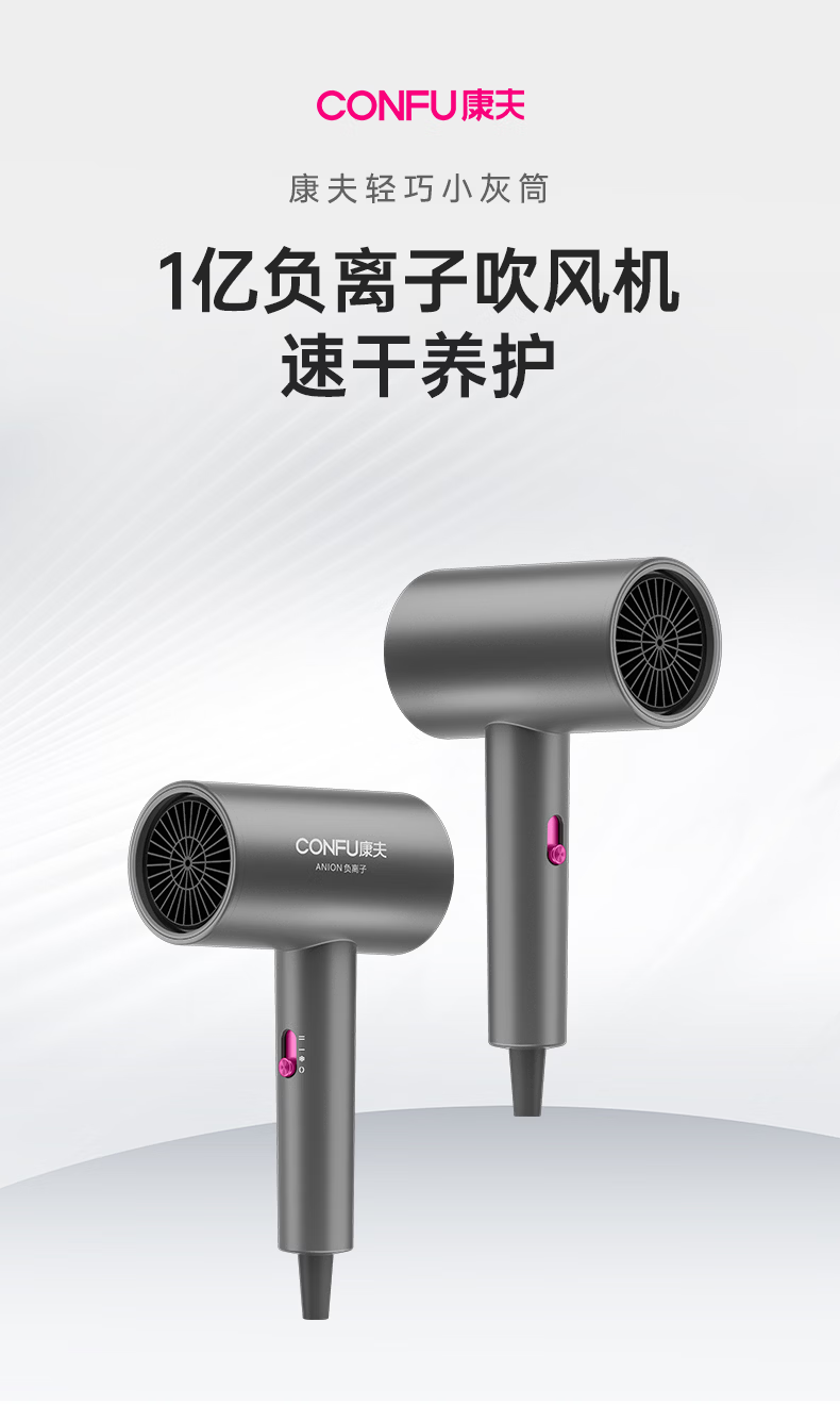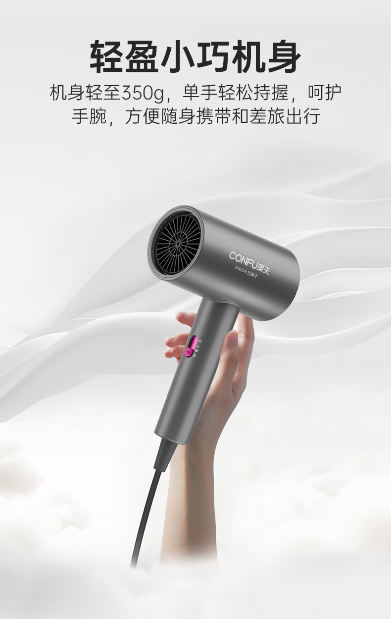 康夫(CONFU)负离子护发电吹风机家用等离子吹风筒不伤发大风速1800W大功率快干吹风机生日礼物3143 3143【1亿负离子升级款】1800W 轻奢灰