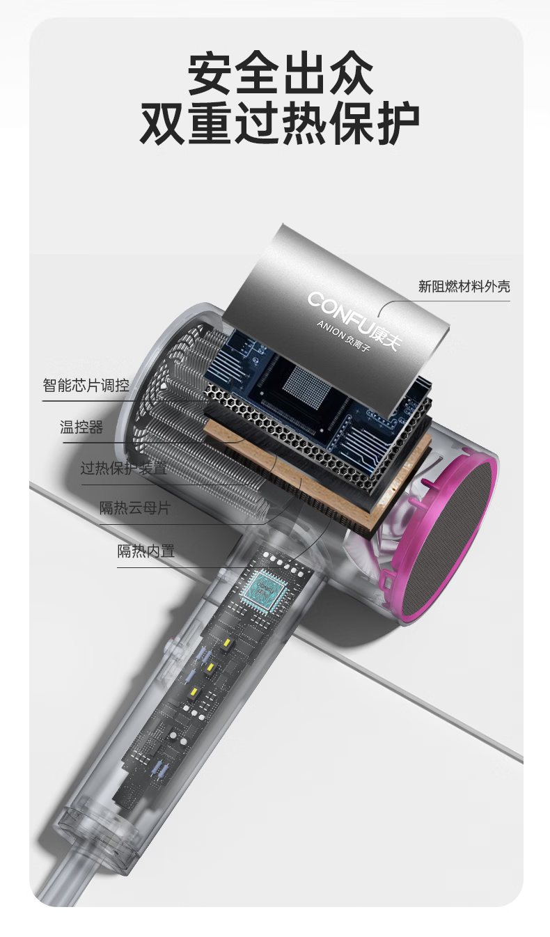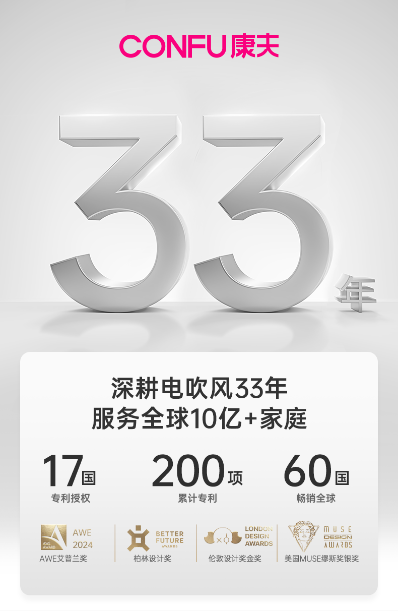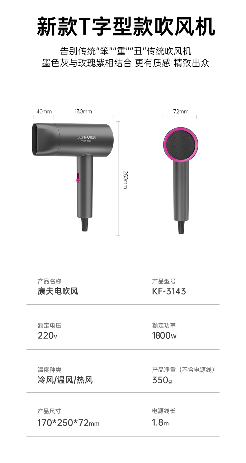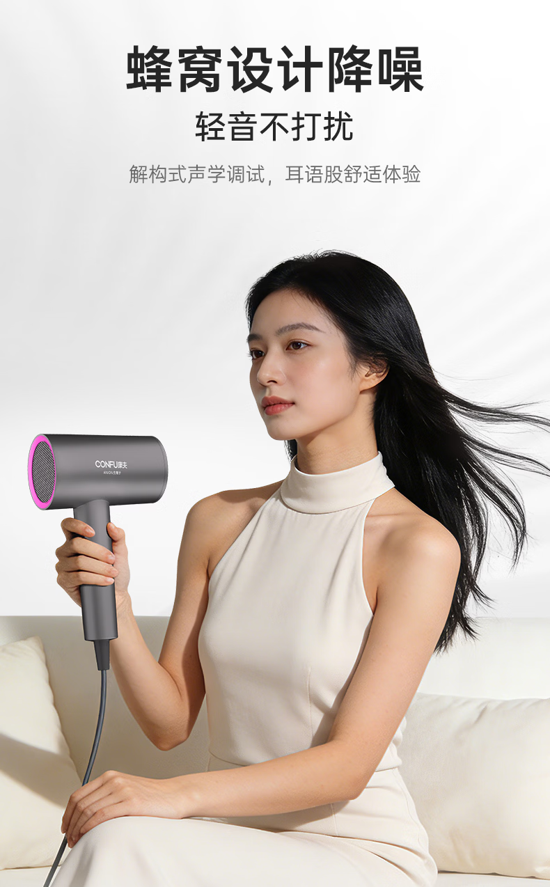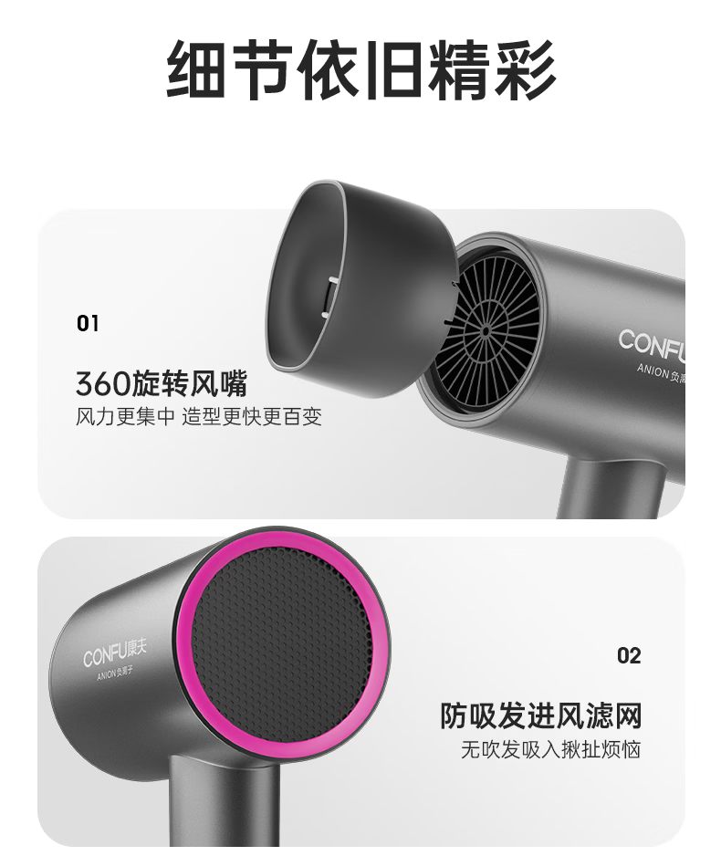 康夫(CONFU)负离子护发电吹风机家用等离子吹风筒不伤发大风速1800W大功率快干吹风机生日礼物3143 3143【1亿负离子升级款】1800W 轻奢灰