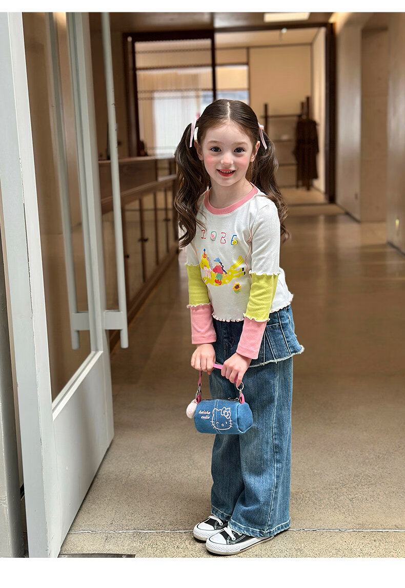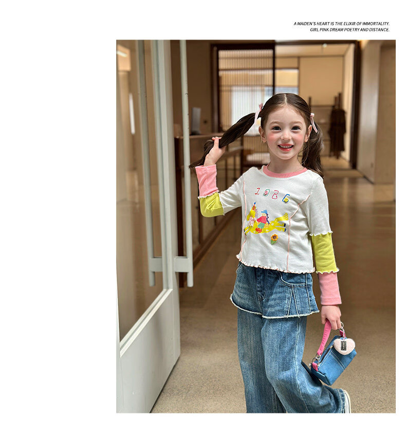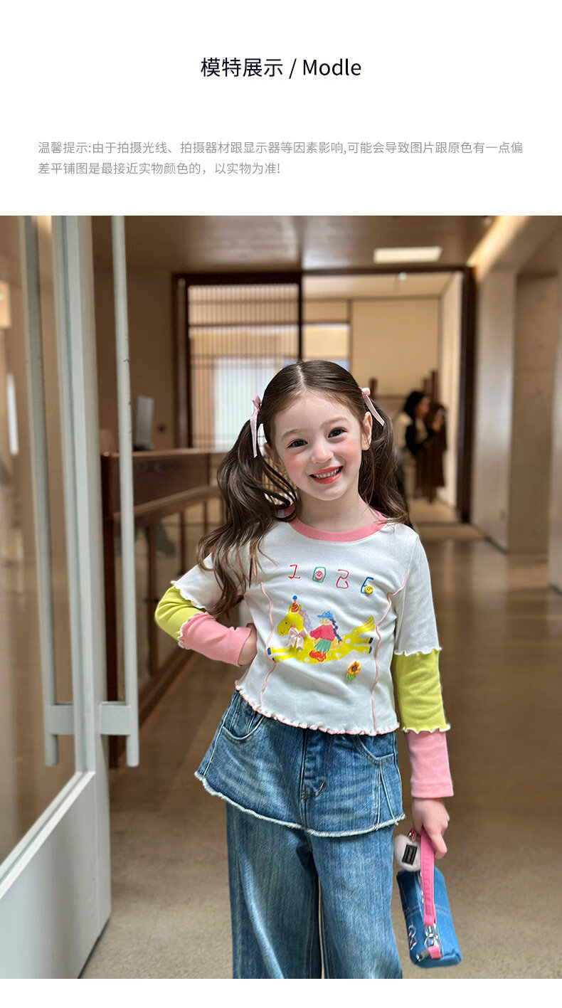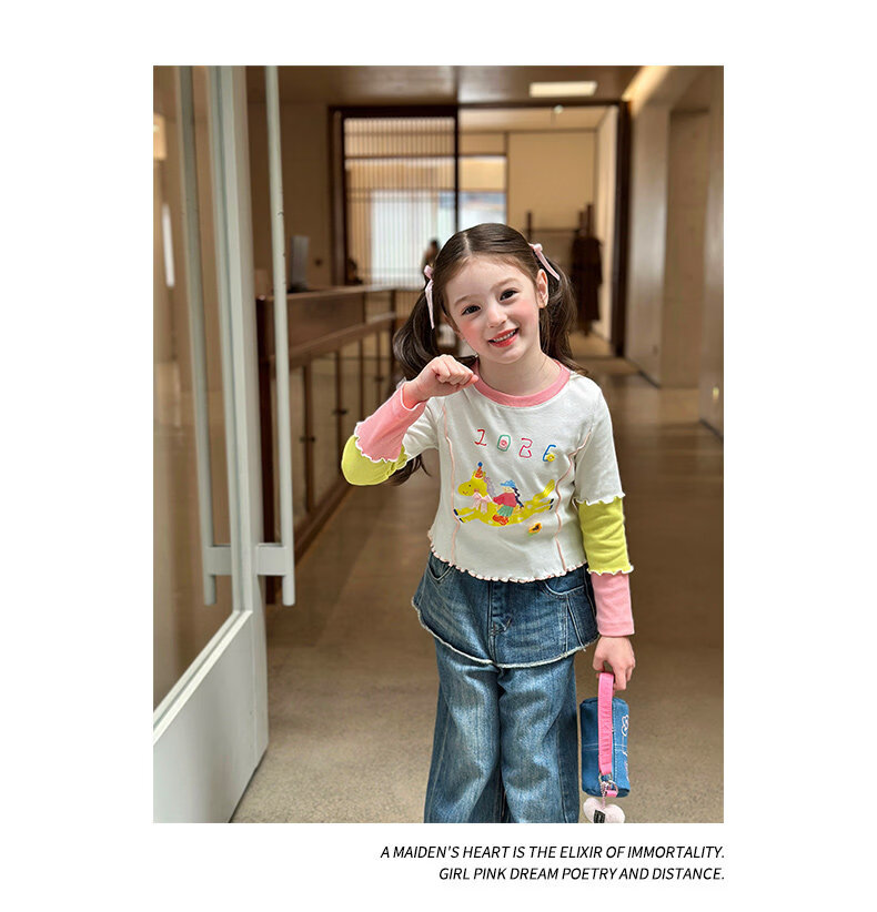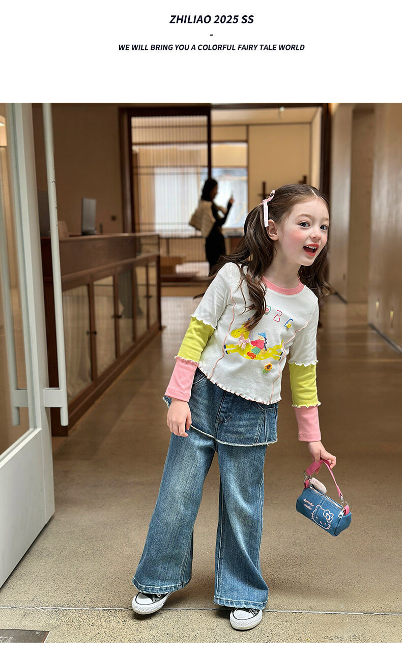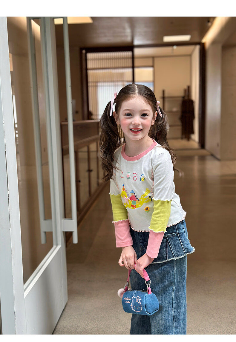 栀了成长记女童装撞色拼接长袖上衣2026春季儿童卡通可爱印花T恤 蓝色 牛仔裤 110 cm