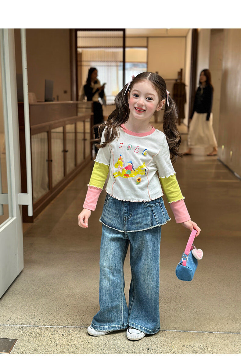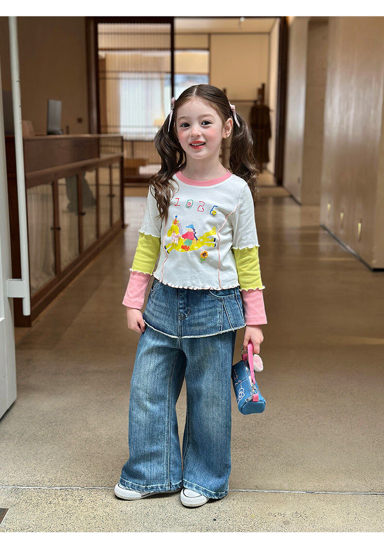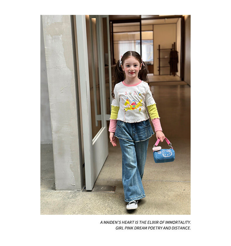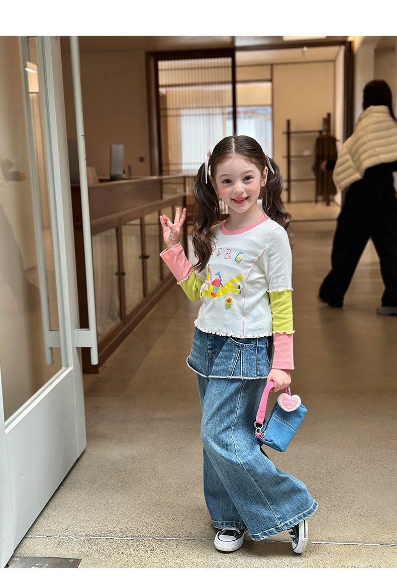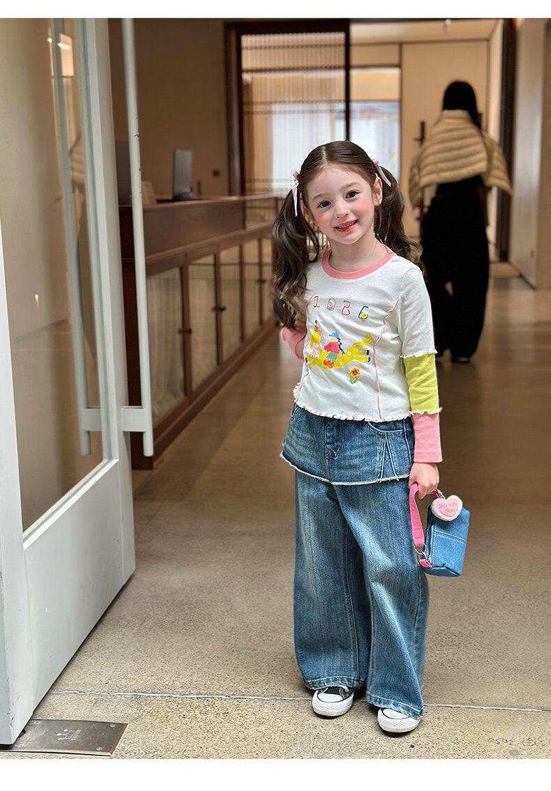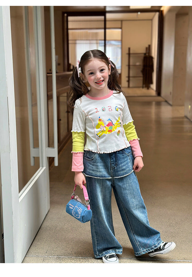 栀了成长记女童装撞色拼接长袖上衣2026春季儿童卡通可爱印花T恤 蓝色 牛仔裤 110 cm