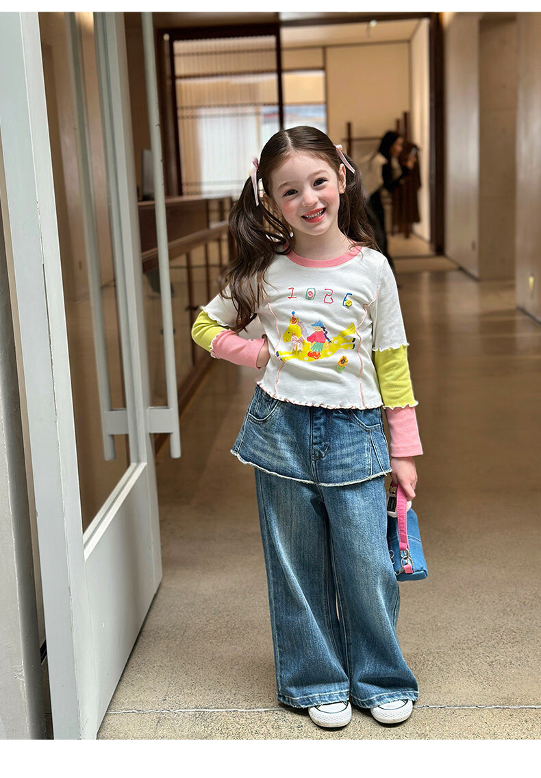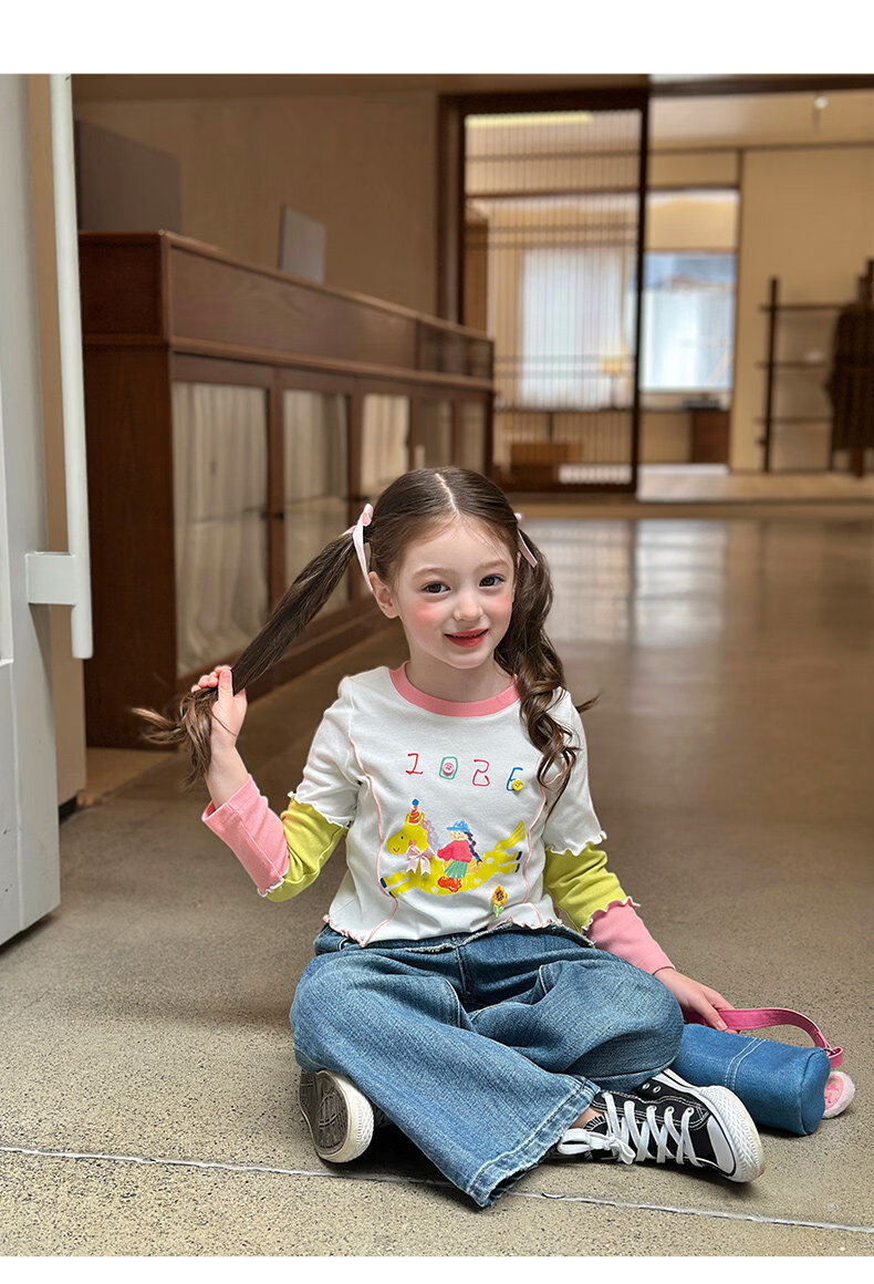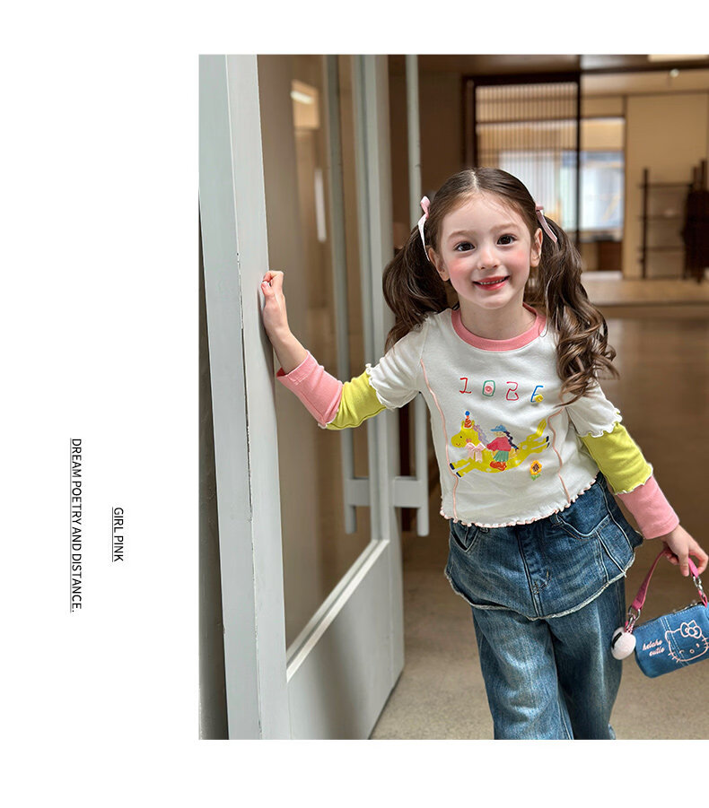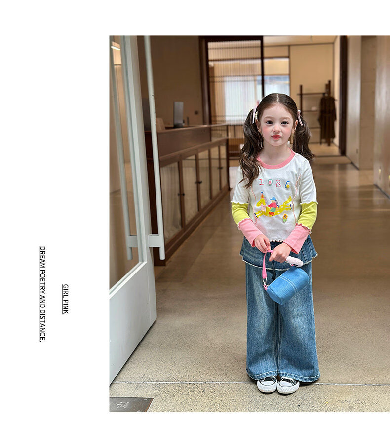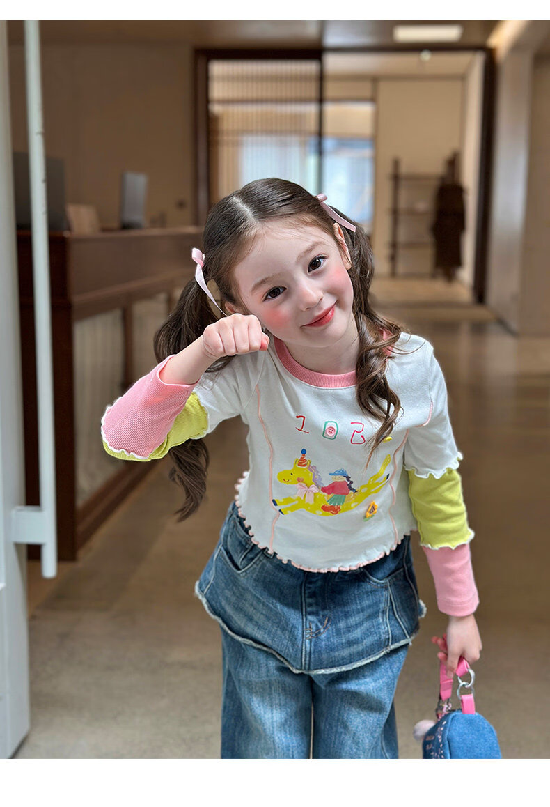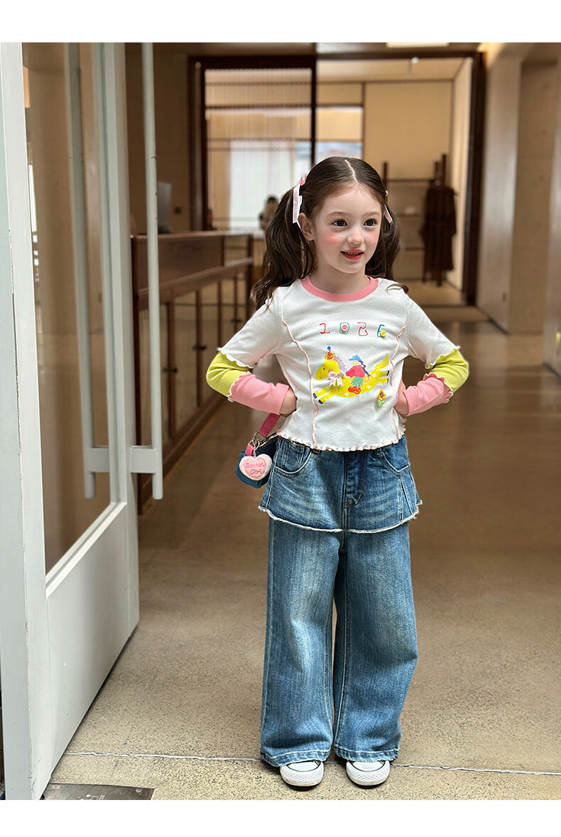 栀了成长记女童装撞色拼接长袖上衣2026春季儿童卡通可爱印花T恤 蓝色 牛仔裤 110 cm