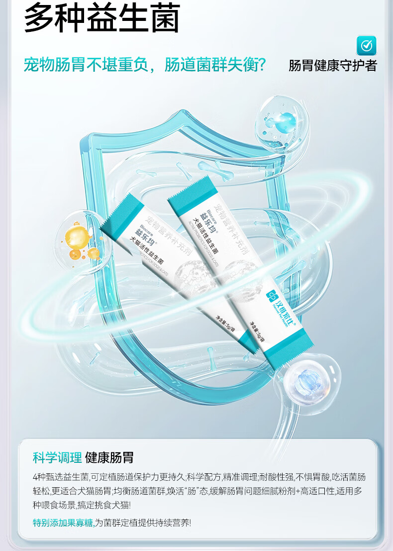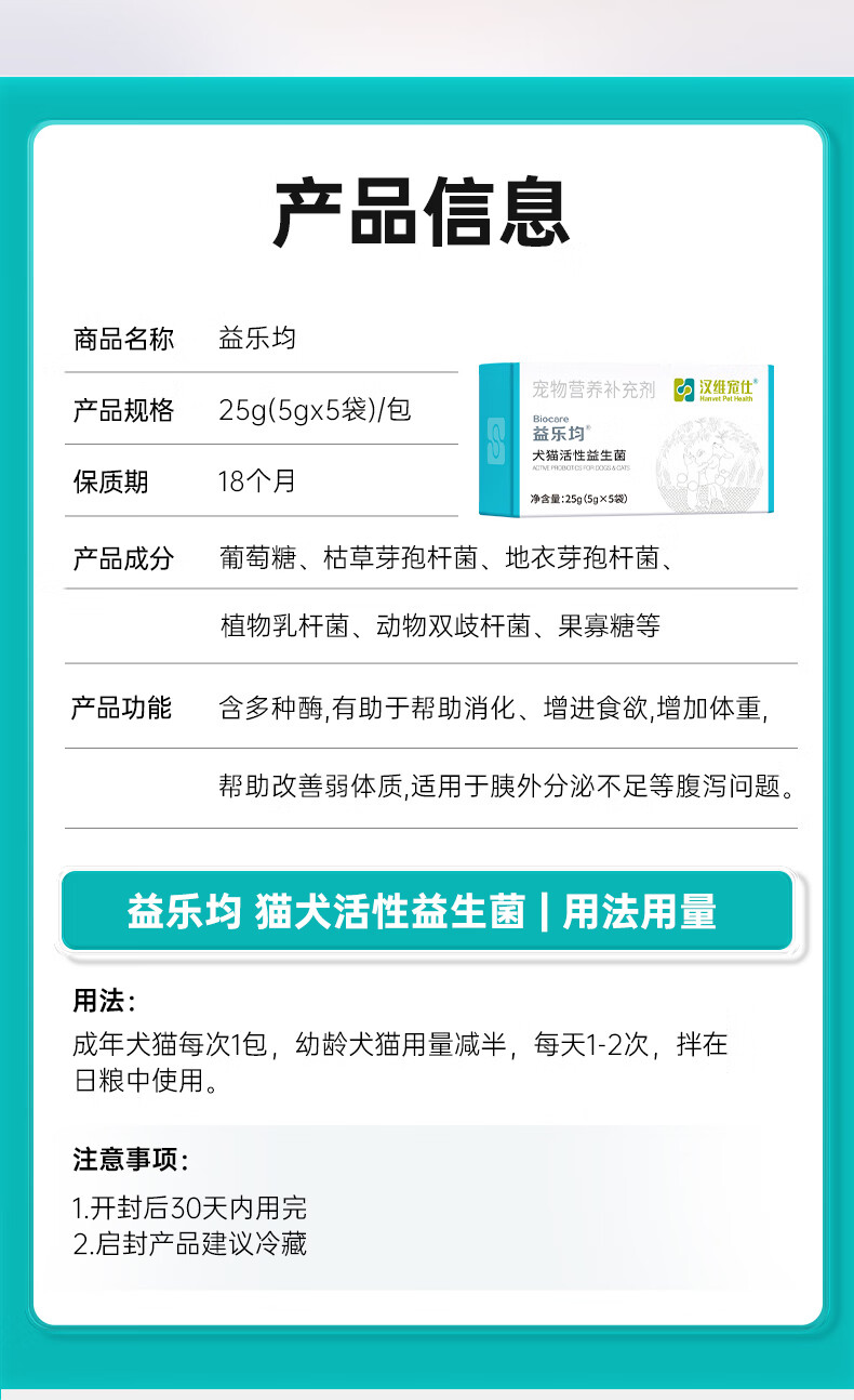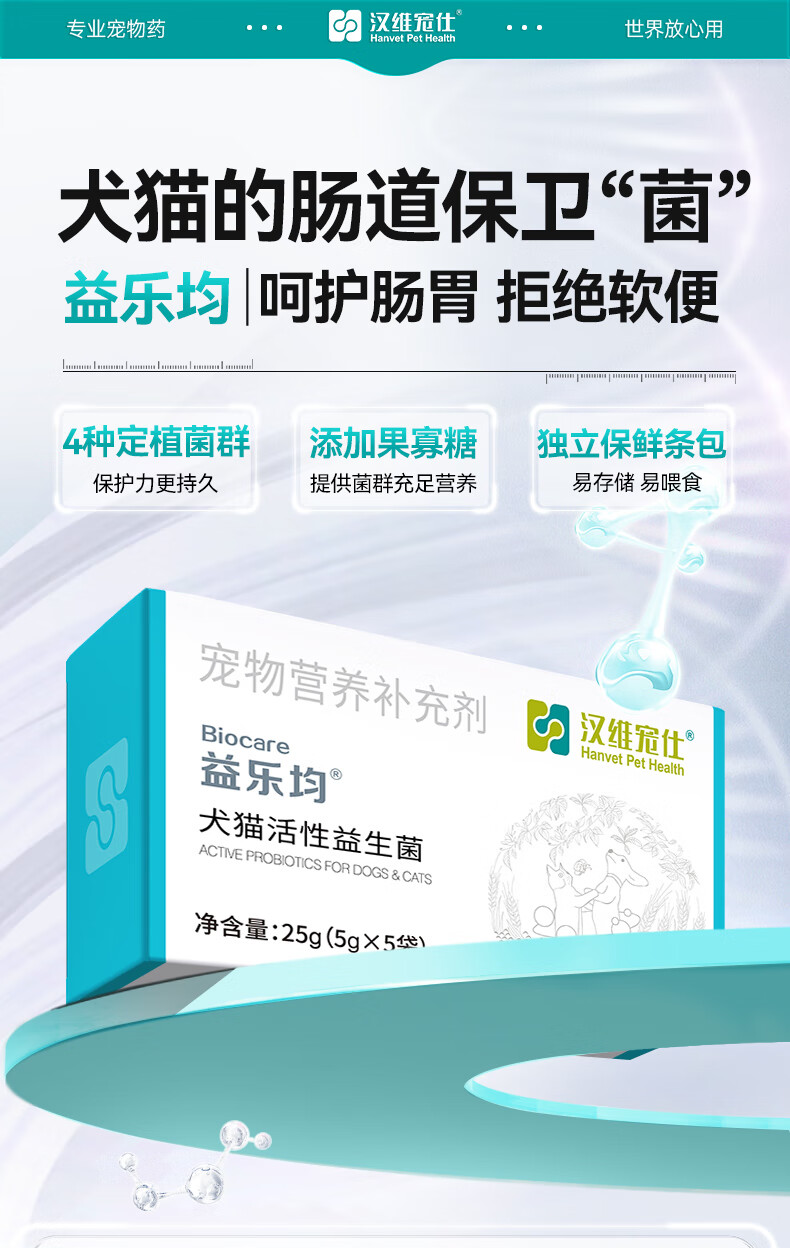 汉维宠仕益乐均犬猫活性益生菌5g*5袋猫咪狗狗肠胃宝营养补充剂