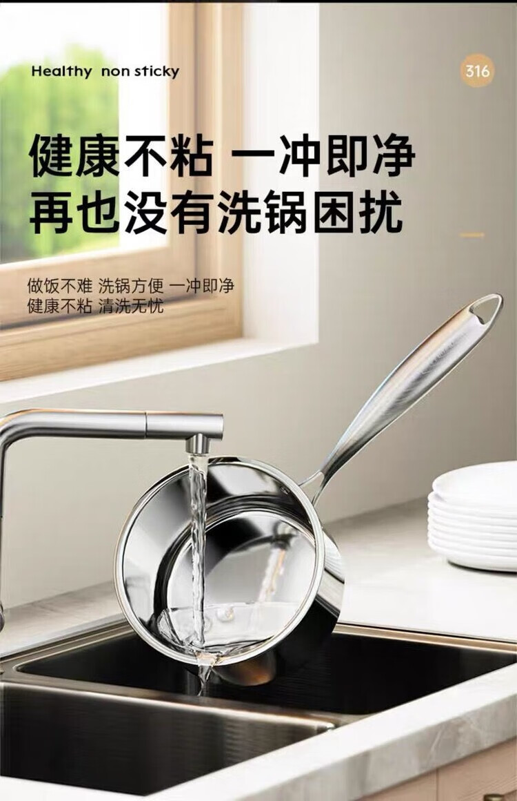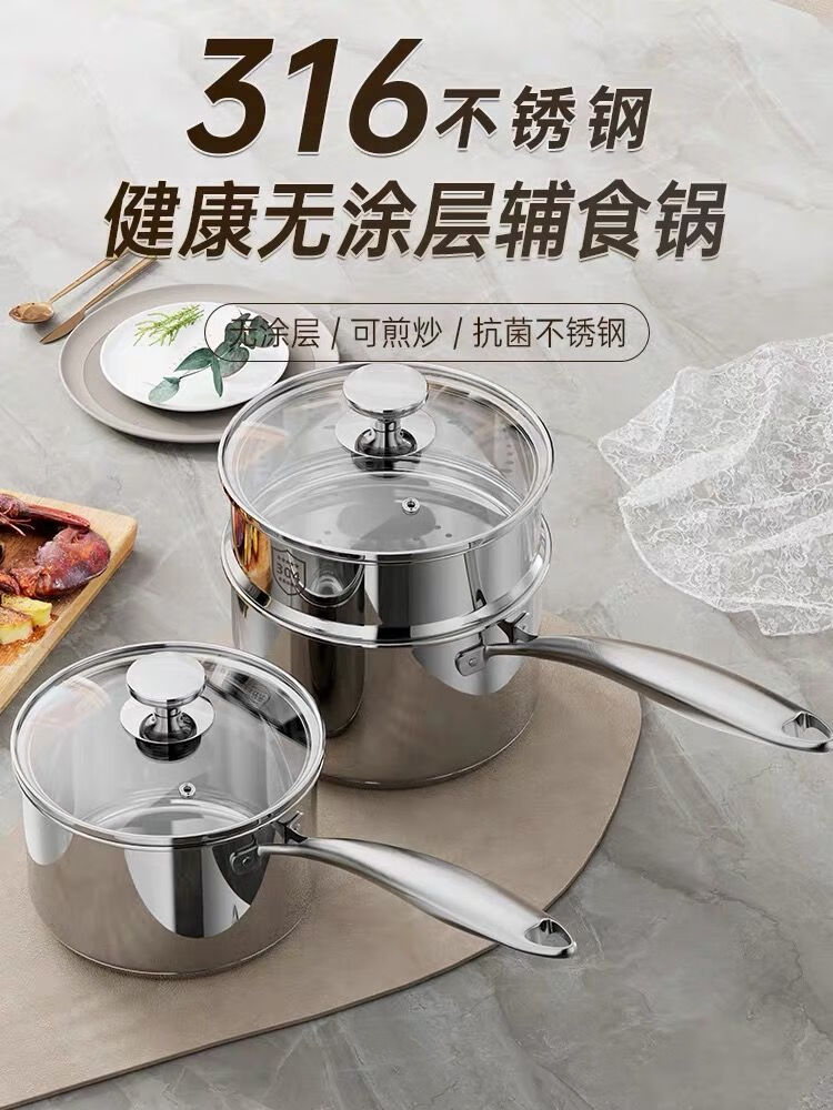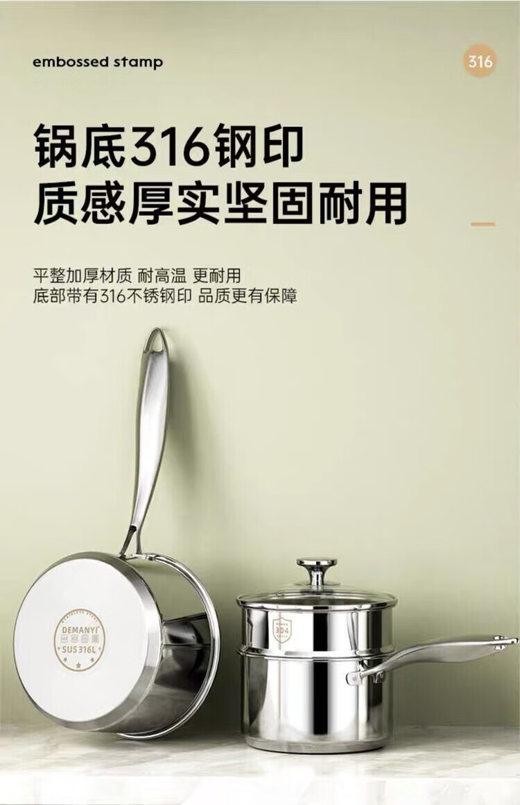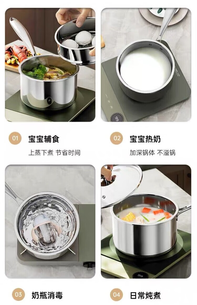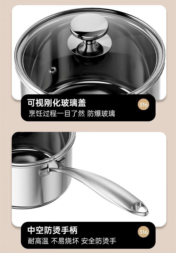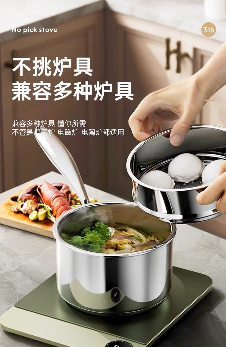 简漾特厚316不锈钢奶锅婴儿宝宝专用辅食锅煮牛奶煮面锅家用蒸煮汤锅 316不锈钢 1寸 内径16cm