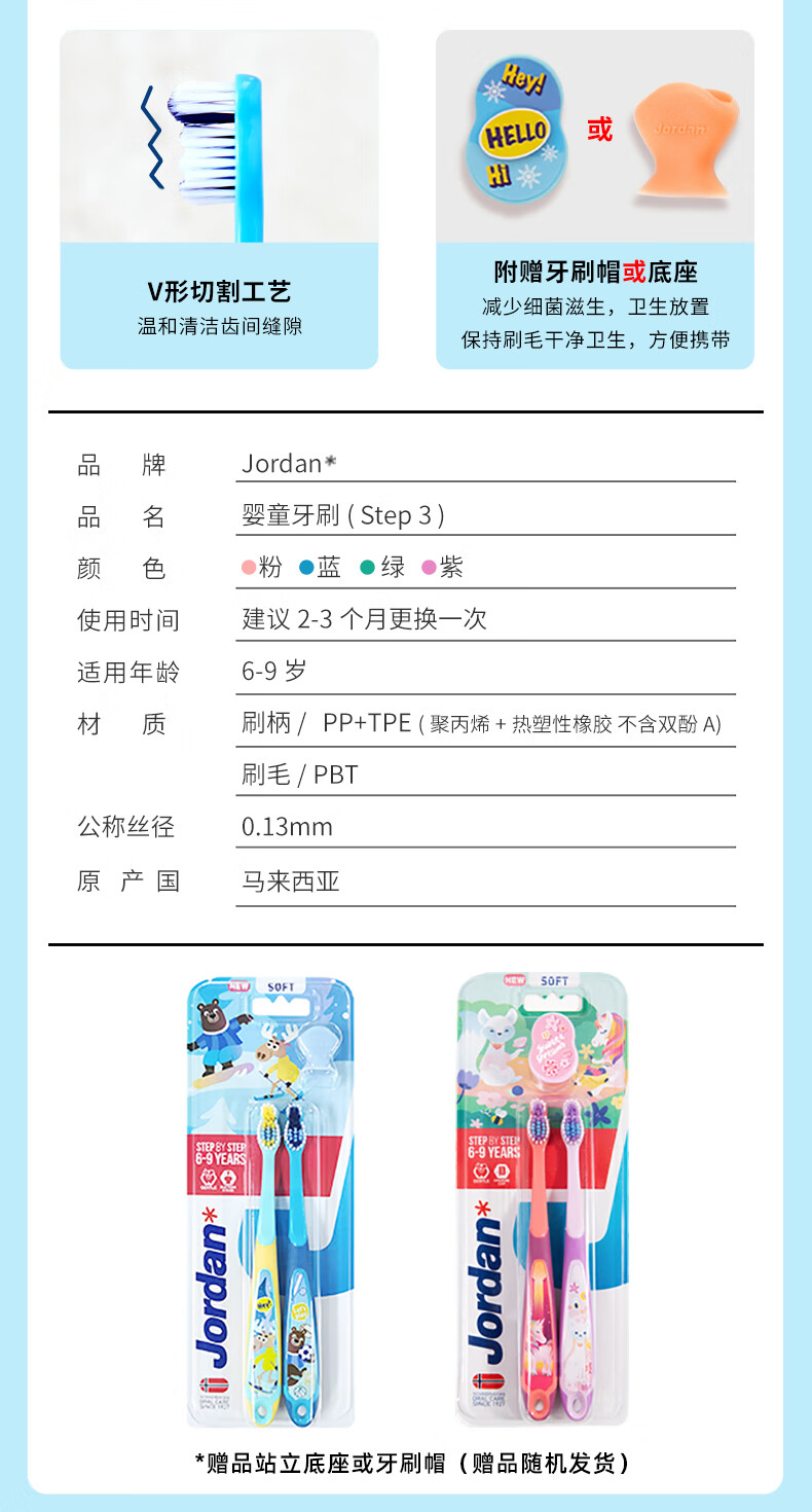 Jordan【山姆同款】中大童宝宝细软毛牙刷6-9岁A款2支装