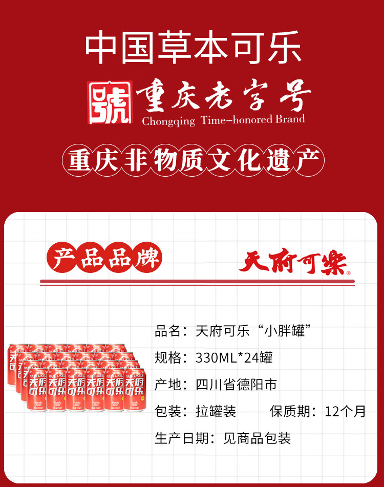 天府可樂(易拉罐)无糖可乐 草本植物精制汽水国产经典童年怀旧碳酸饮料 330ml*12罐(无糖)
