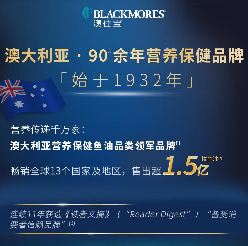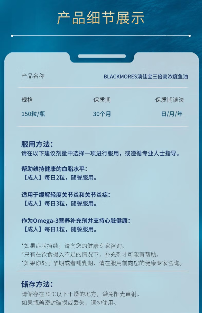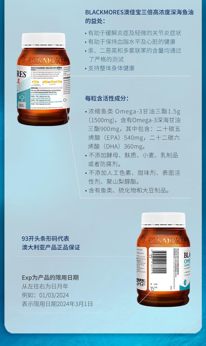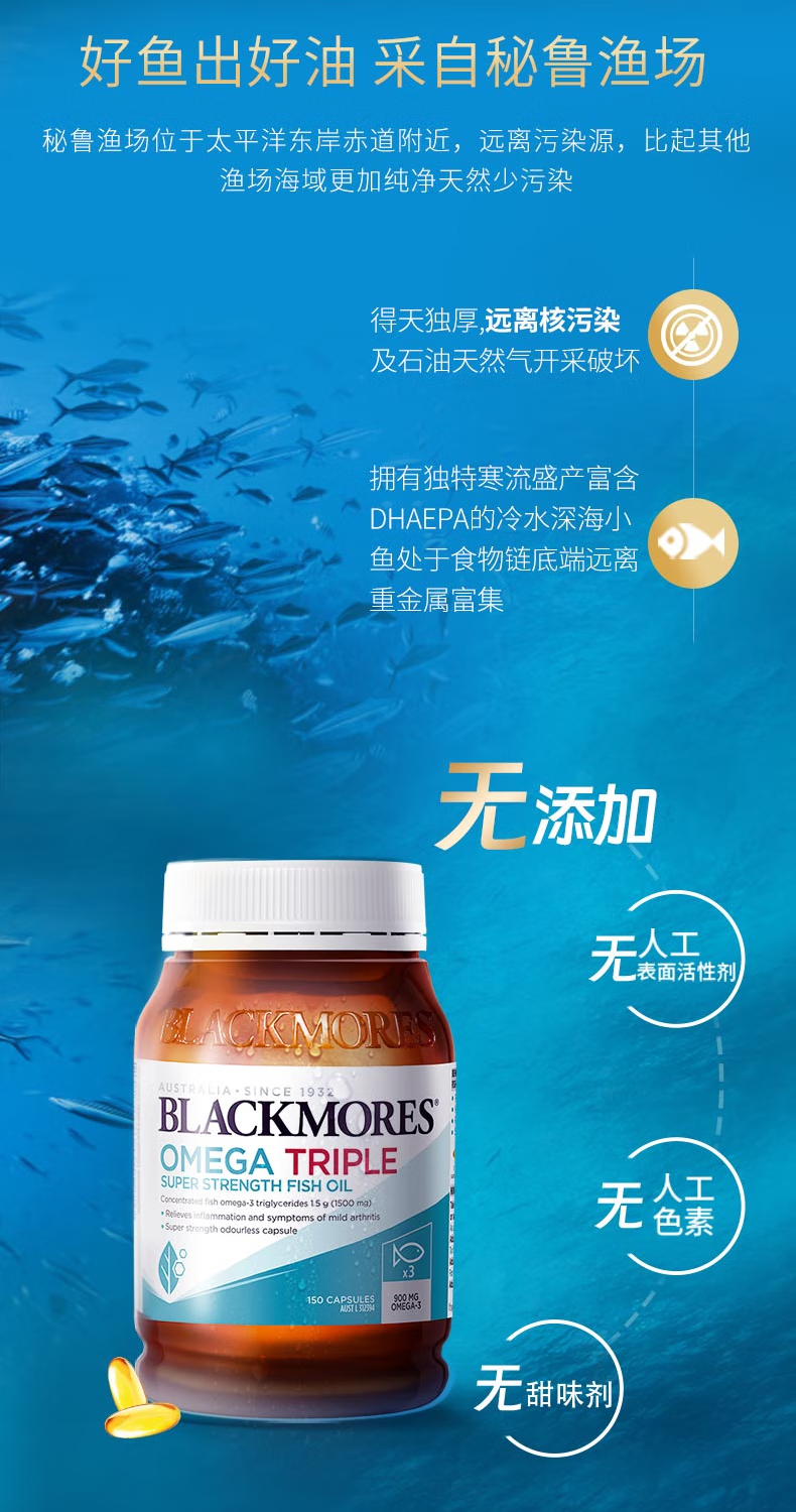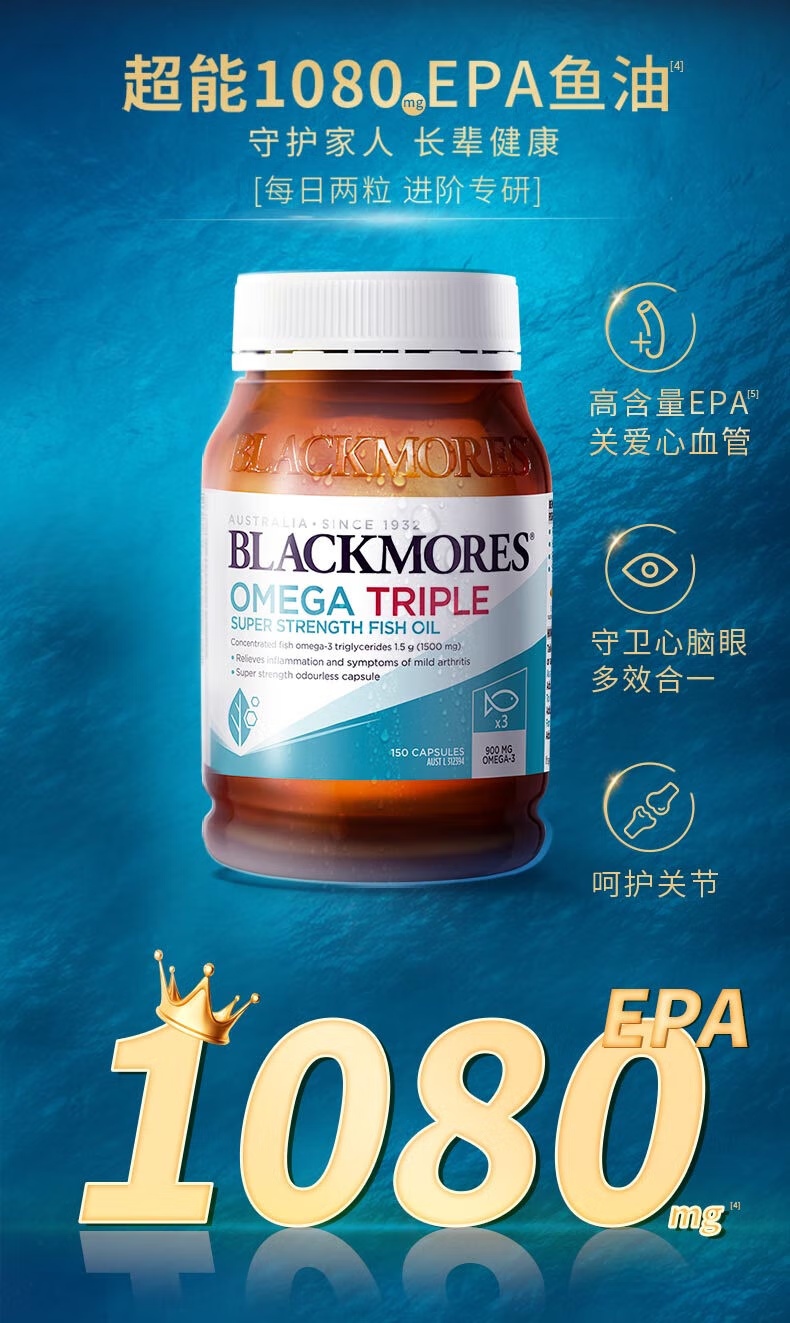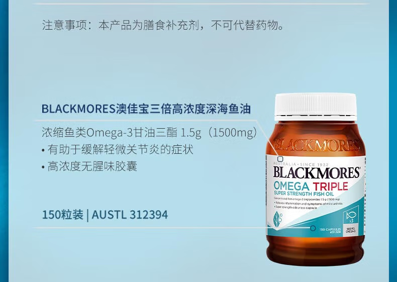 澳佳宝Blackmores3倍鱼油软胶囊1500mg深海Omega3含有效期27年初 三倍鱼油150粒*1瓶