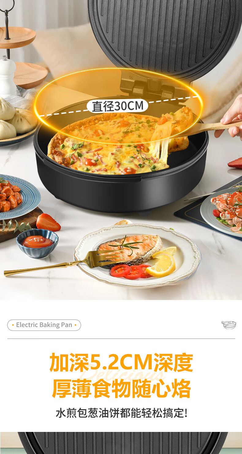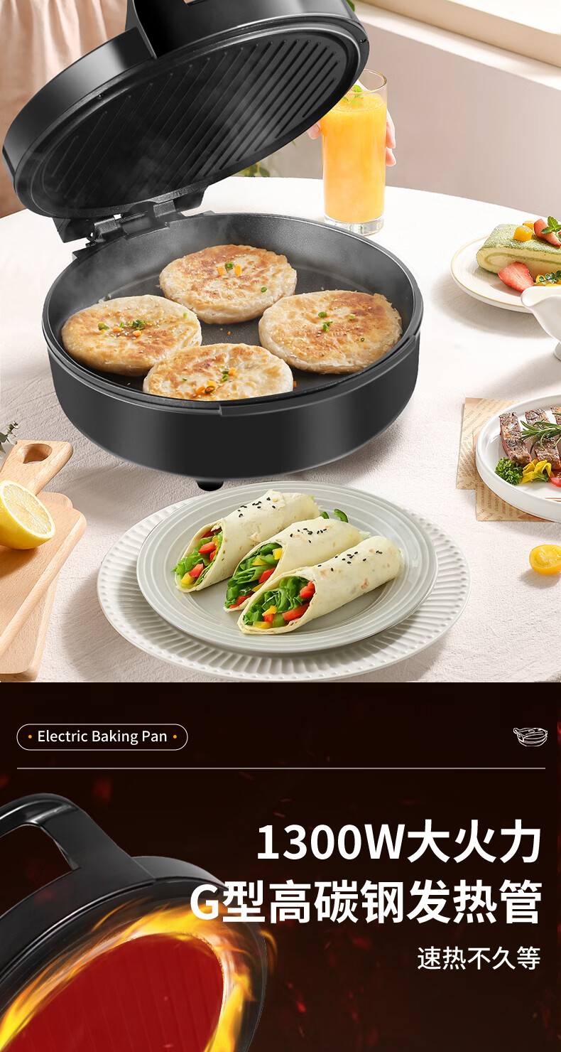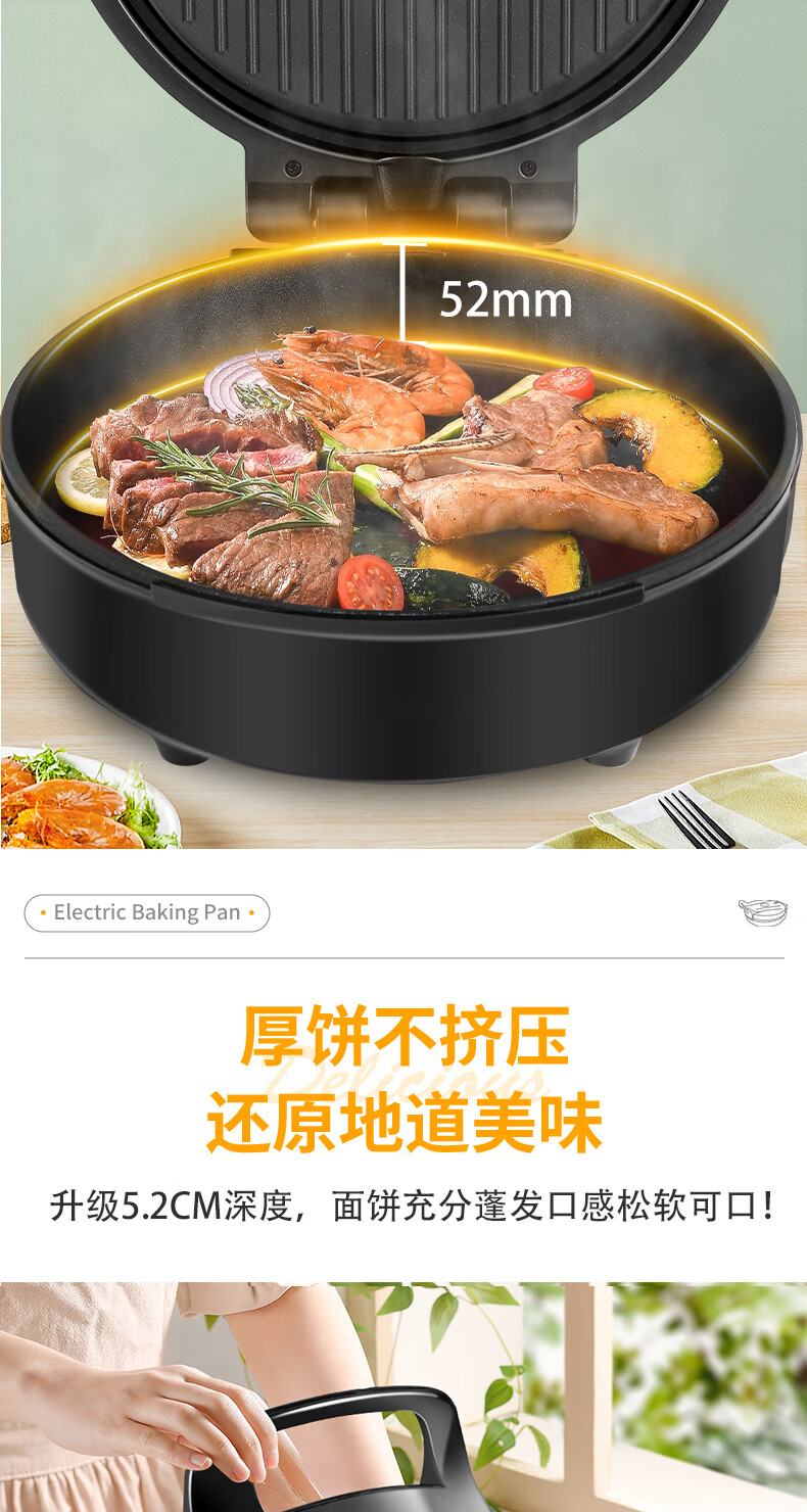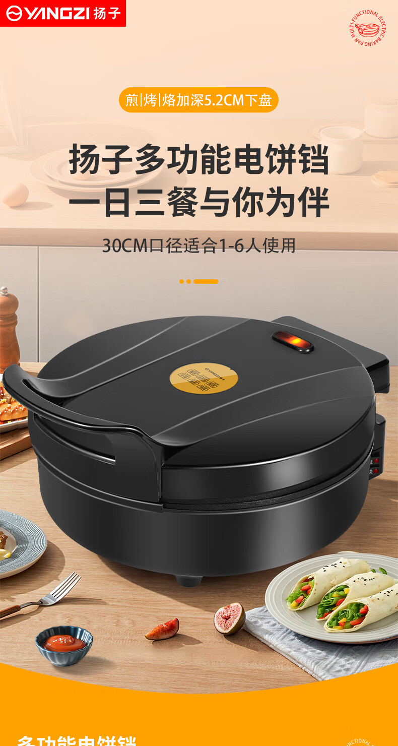 扬子 电饼铛家用电饼档双面加热煎饼烙饼锅煎烤机早餐机三明治 30CM大尺寸加大加深烤肉锅TB13V-S 黑色