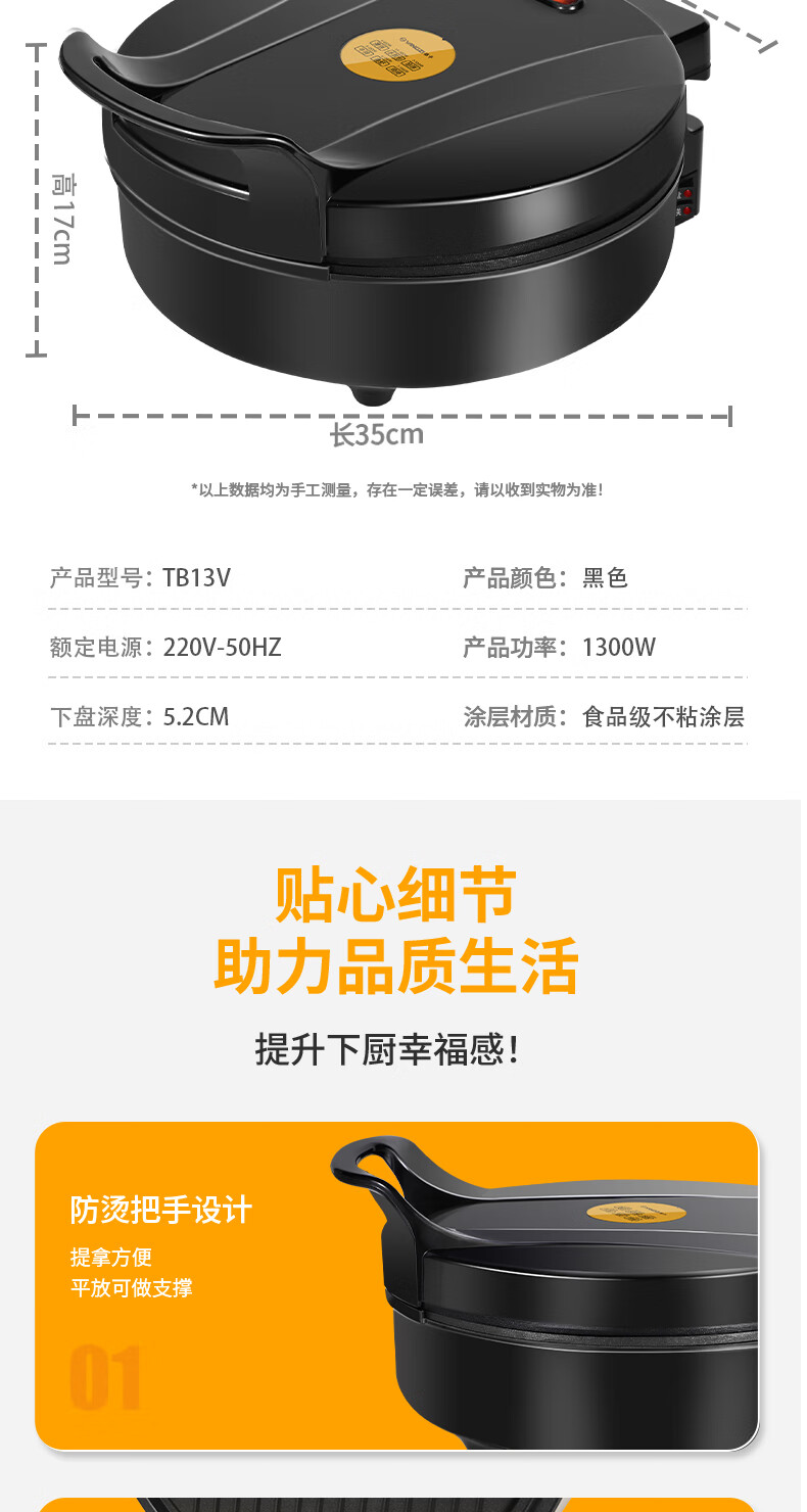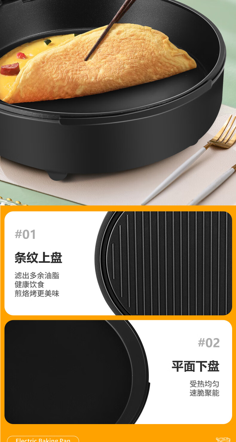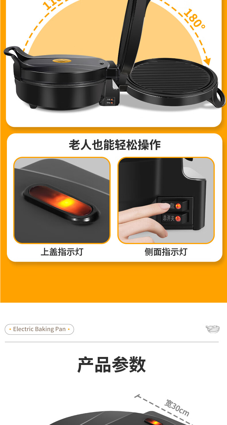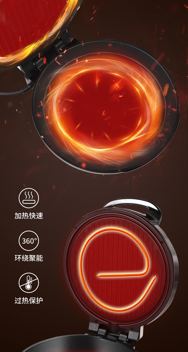 扬子 电饼铛家用电饼档双面加热煎饼烙饼锅煎烤机早餐机三明治 30CM大尺寸加大加深烤肉锅TB13V-S 黑色