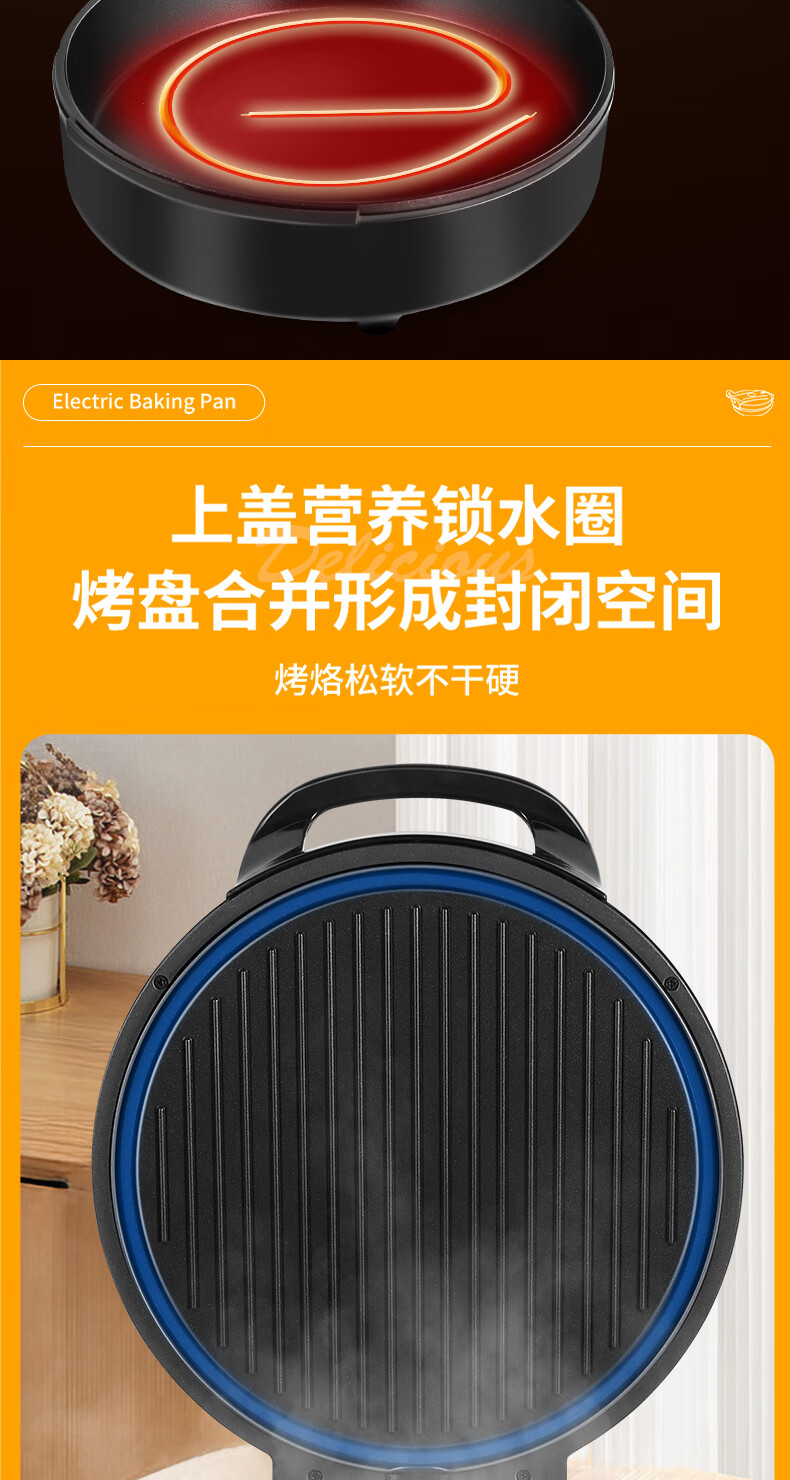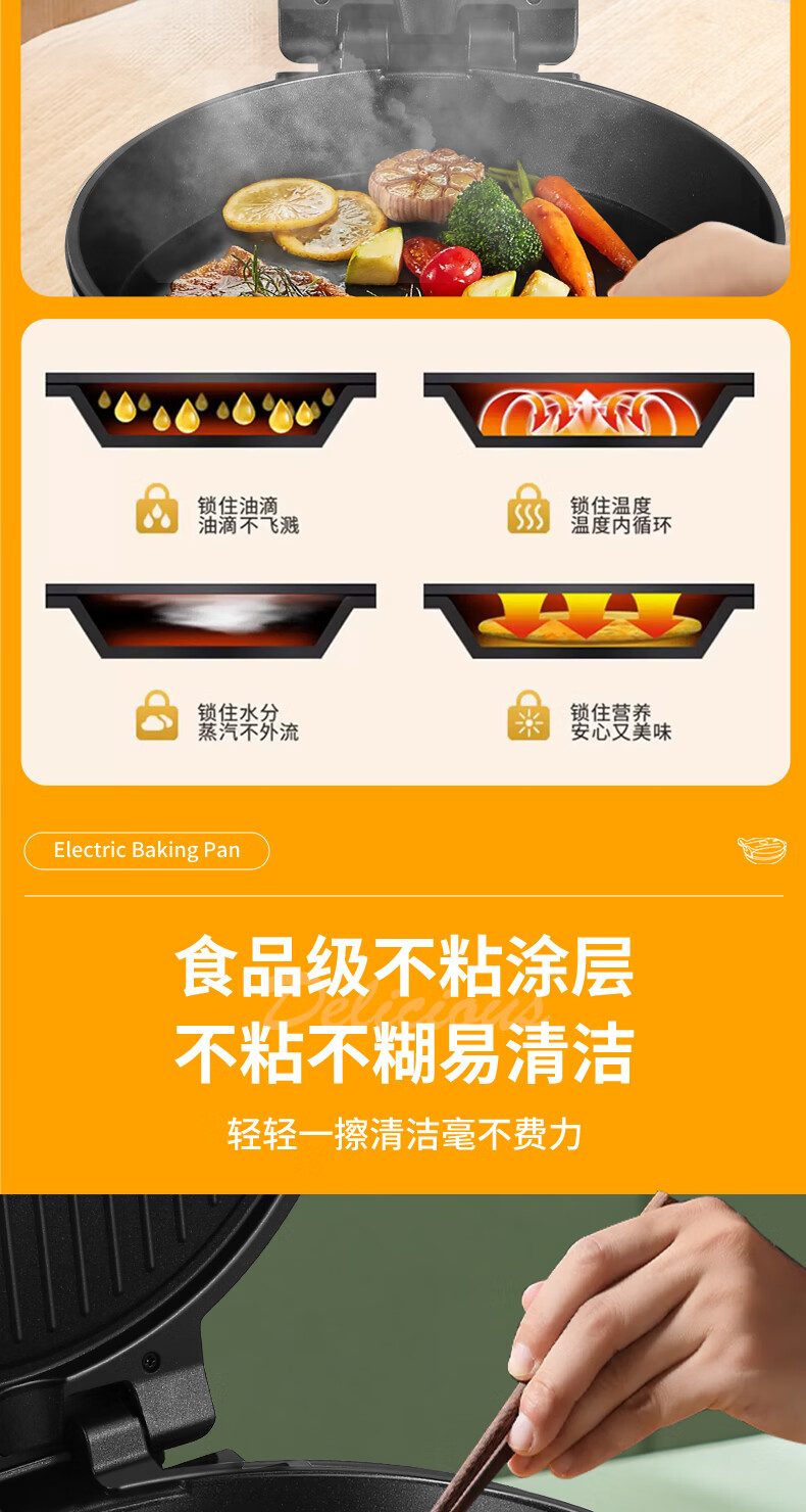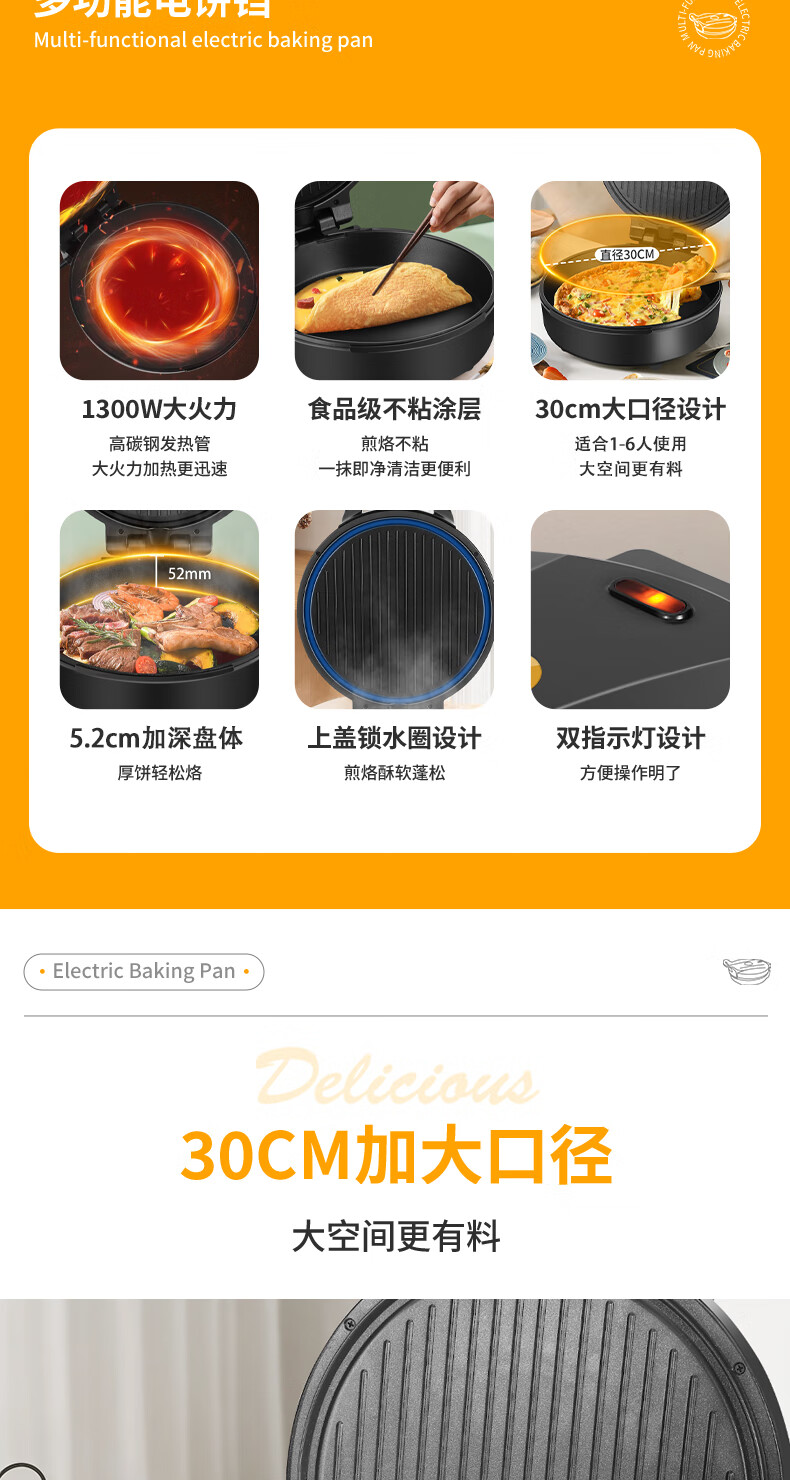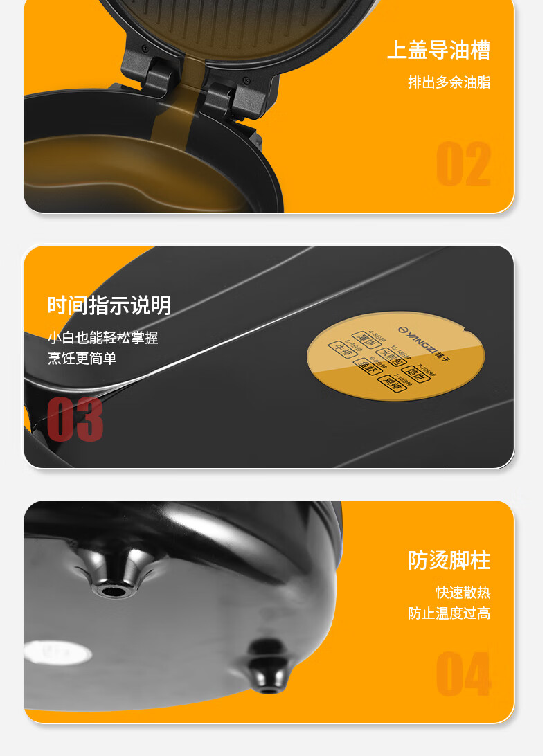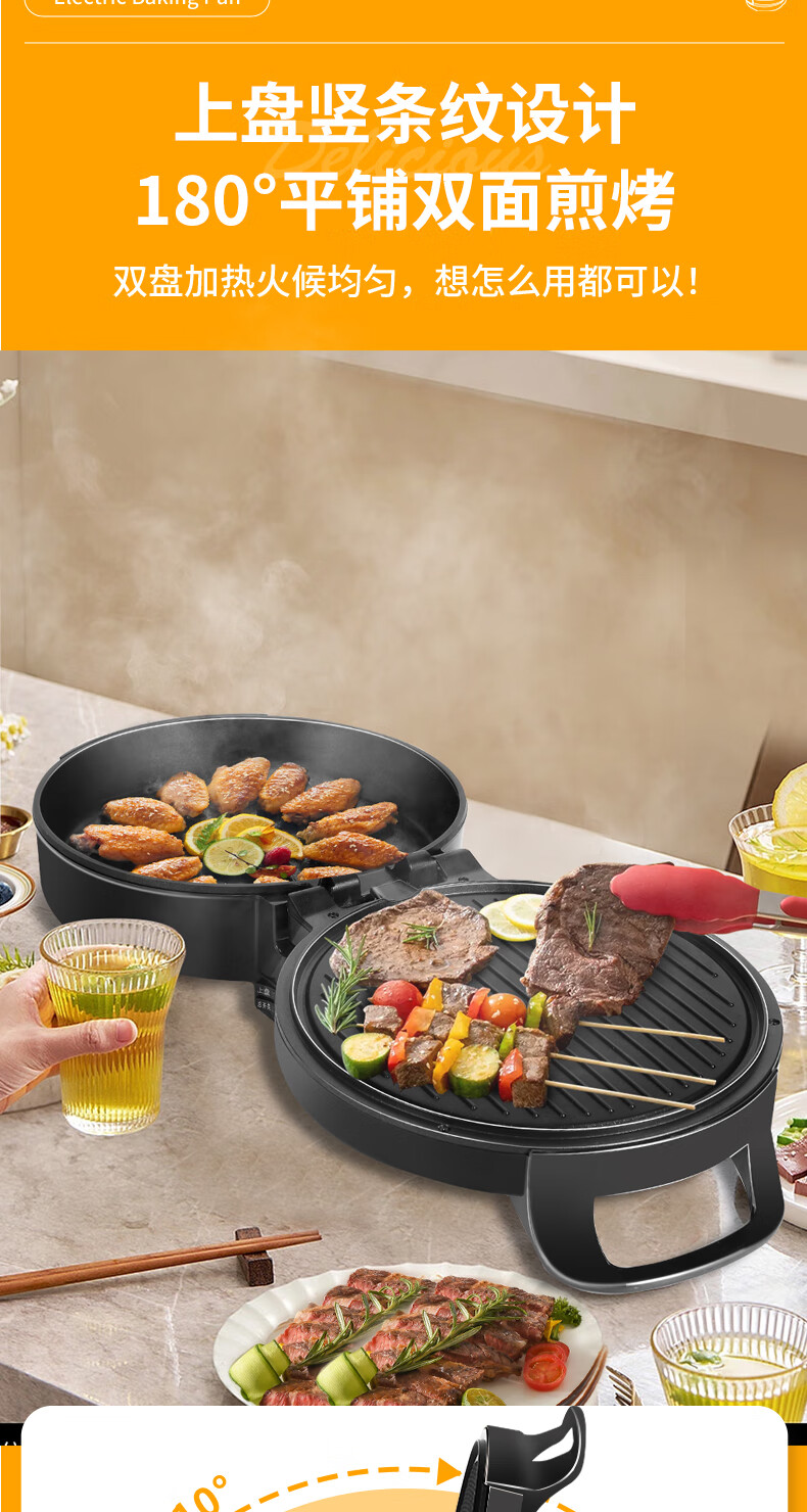 扬子 电饼铛家用电饼档双面加热煎饼烙饼锅煎烤机早餐机三明治 30CM大尺寸加大加深烤肉锅TB13V-S 黑色