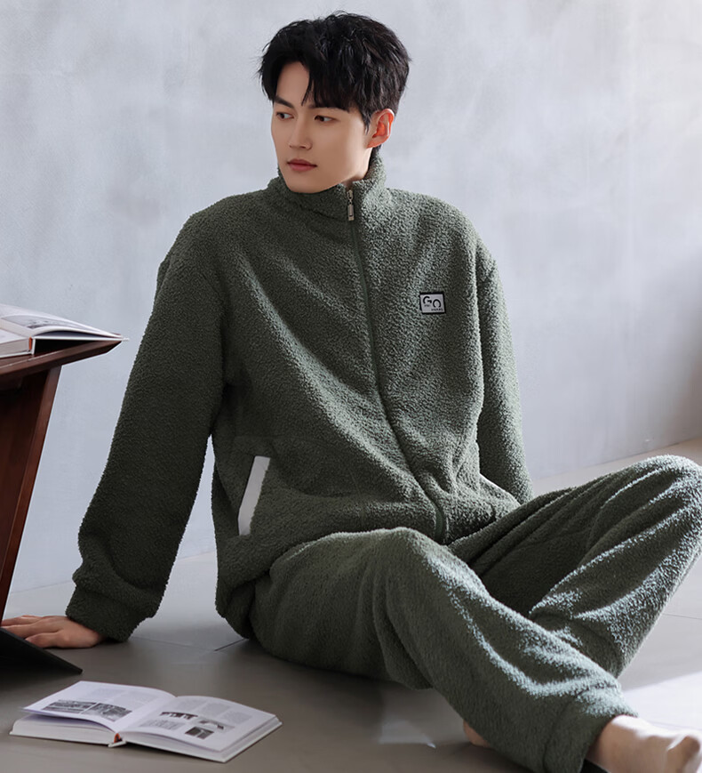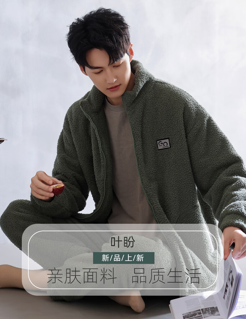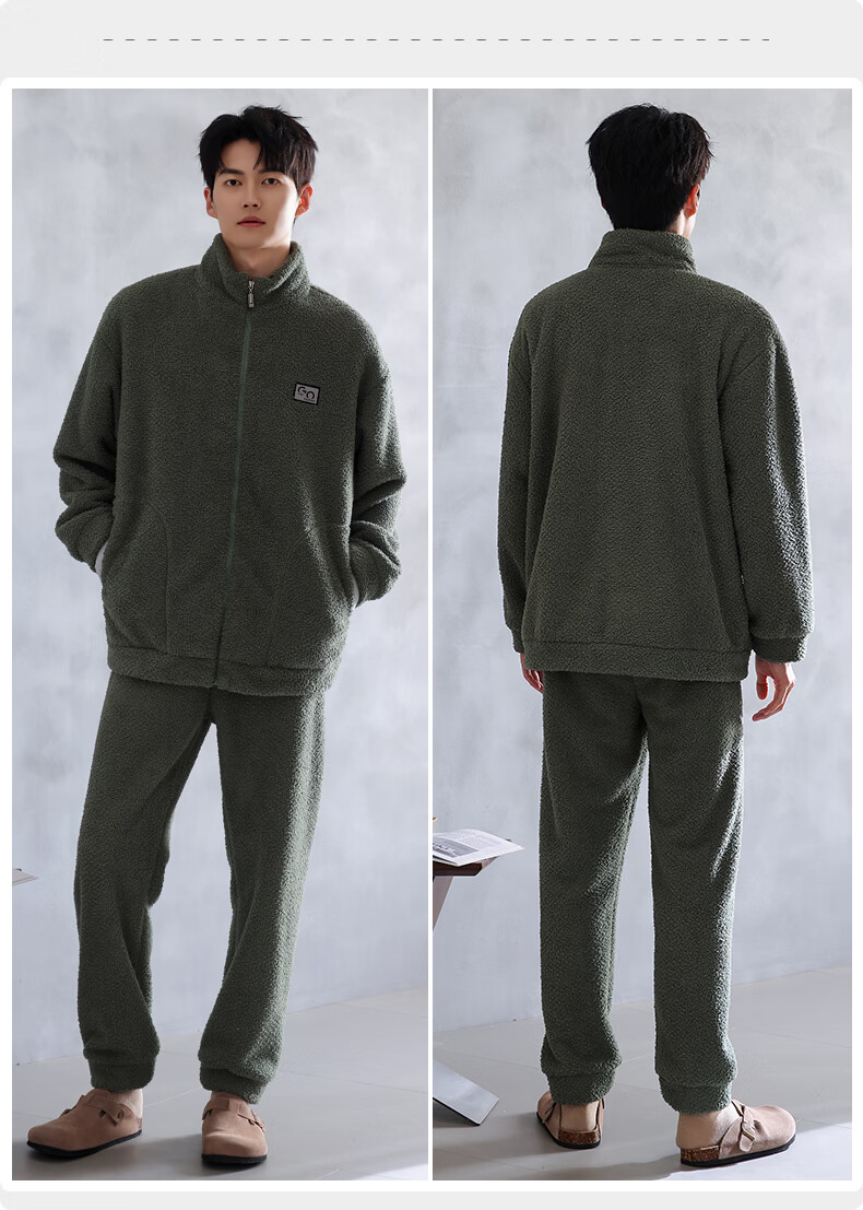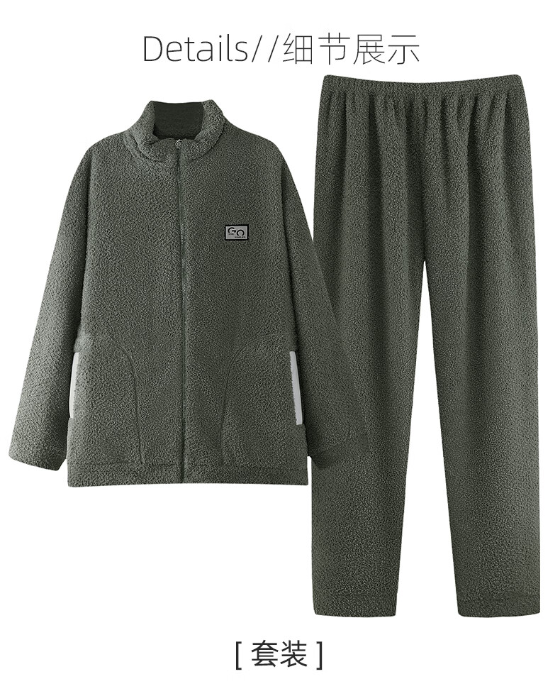叶盼(yepan)【保暖】羊羔绒睡衣男冬季宽松大码高级感冬天加绒加厚家居服套装 9061-锰绿 M (165) :建议100-120斤穿着