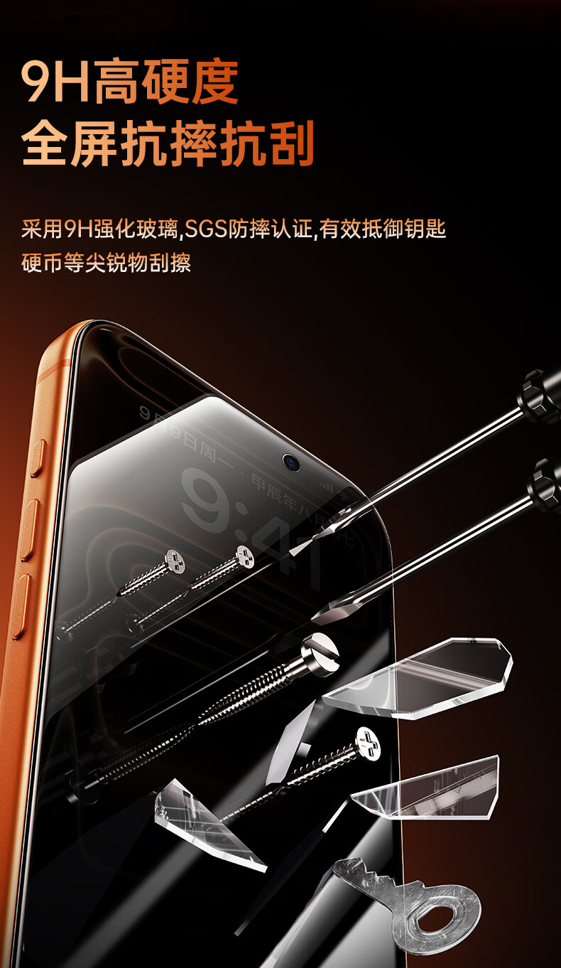 绿联【无黑边不挡屏】适用苹果17/16Pro钢化膜iPhone17/16Pro手机膜无边高清防摔防爆保护膜 2片装