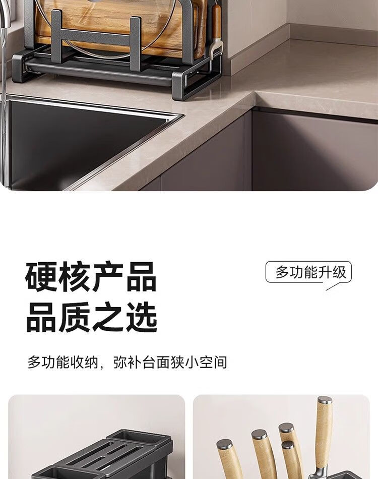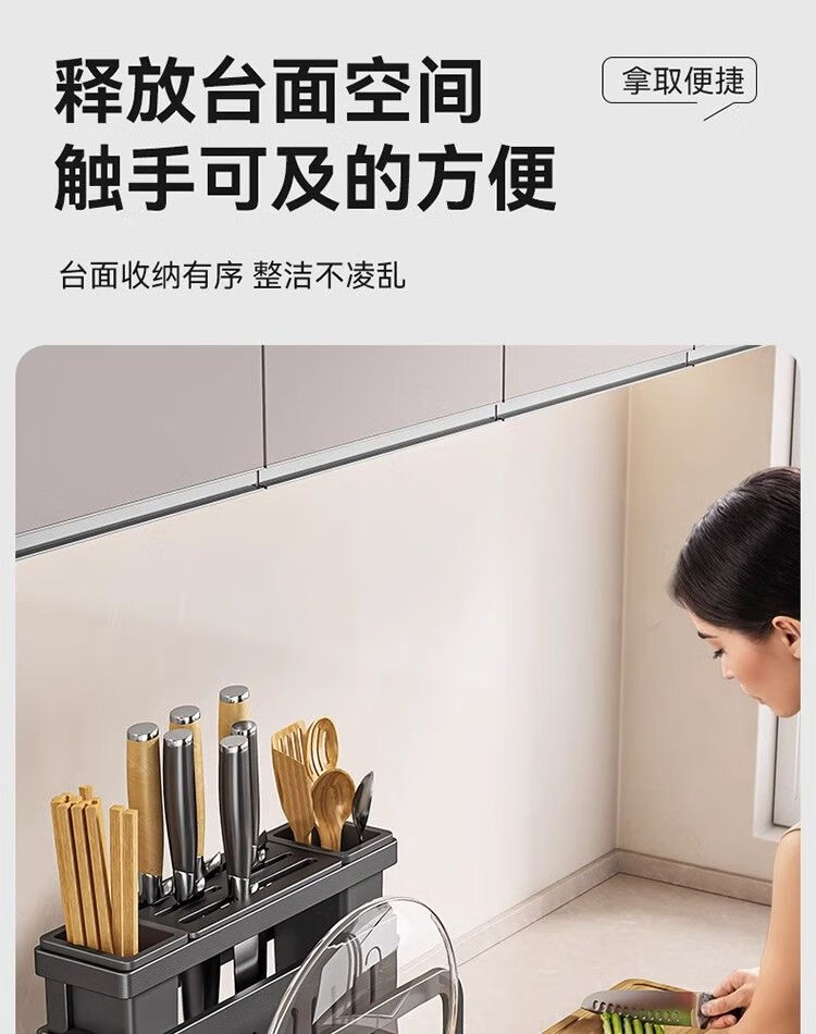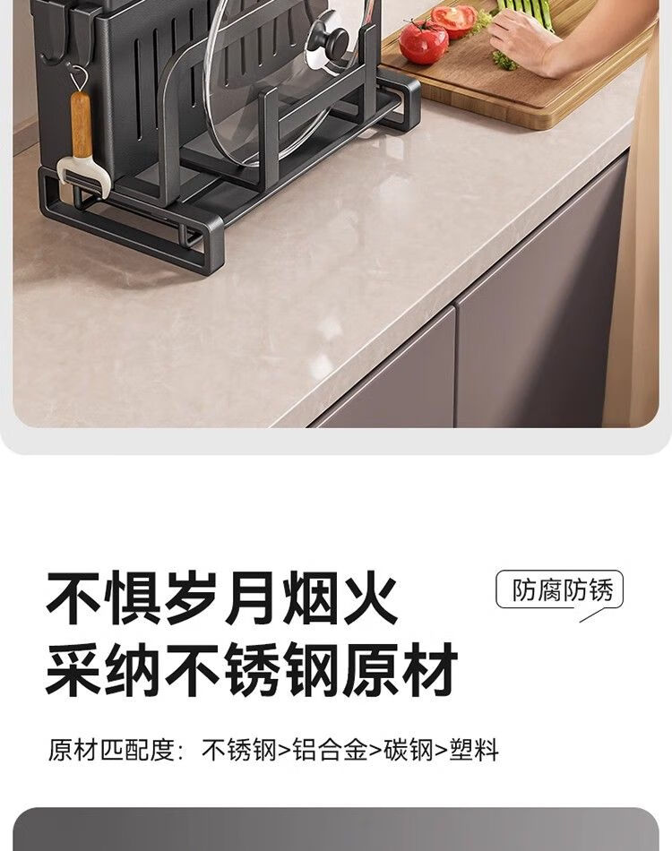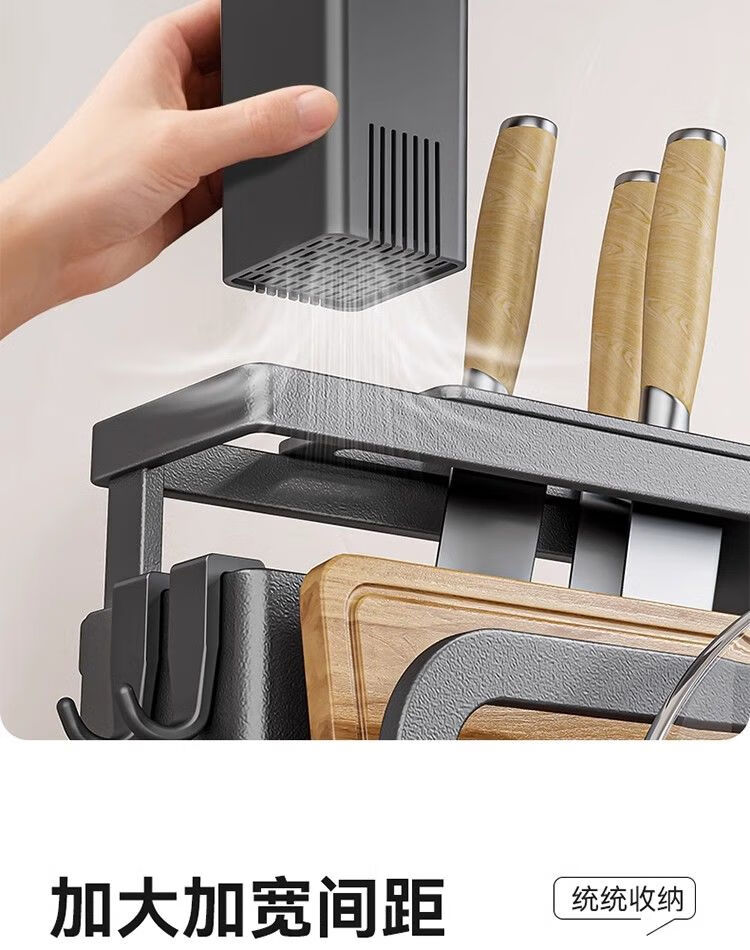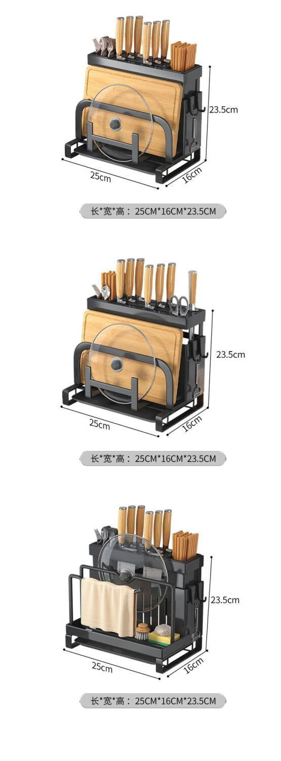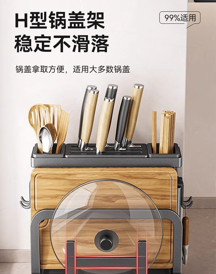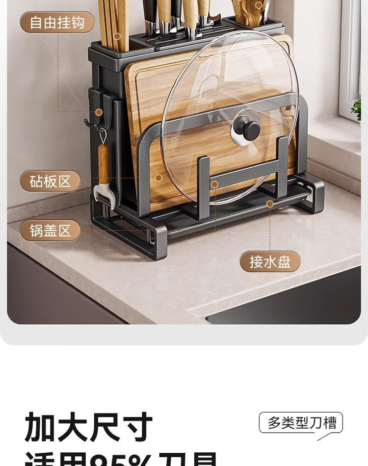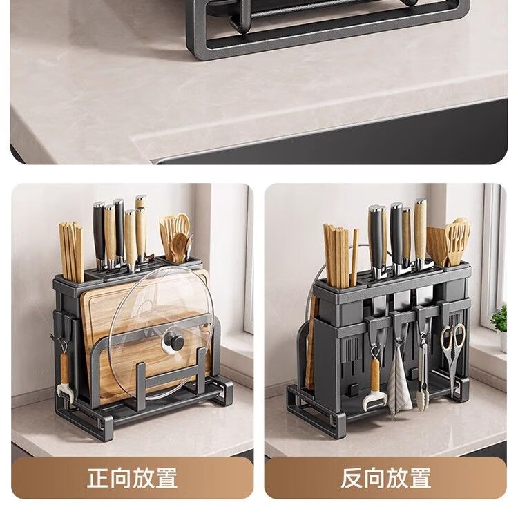 泰禧阁厨房刀架家用菜刀筷子筒砧板锅盖架菜板多功能刀具一体刀架收纳架 经典黑【双筷筒】砧板架+锅盖架+挂钩*4 台面款【优质碳钢 分区收纳】