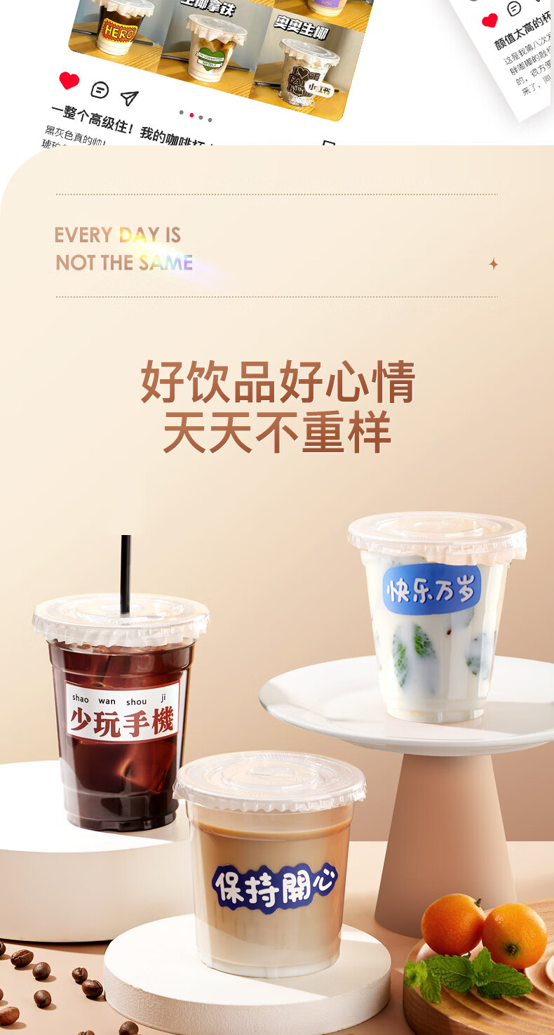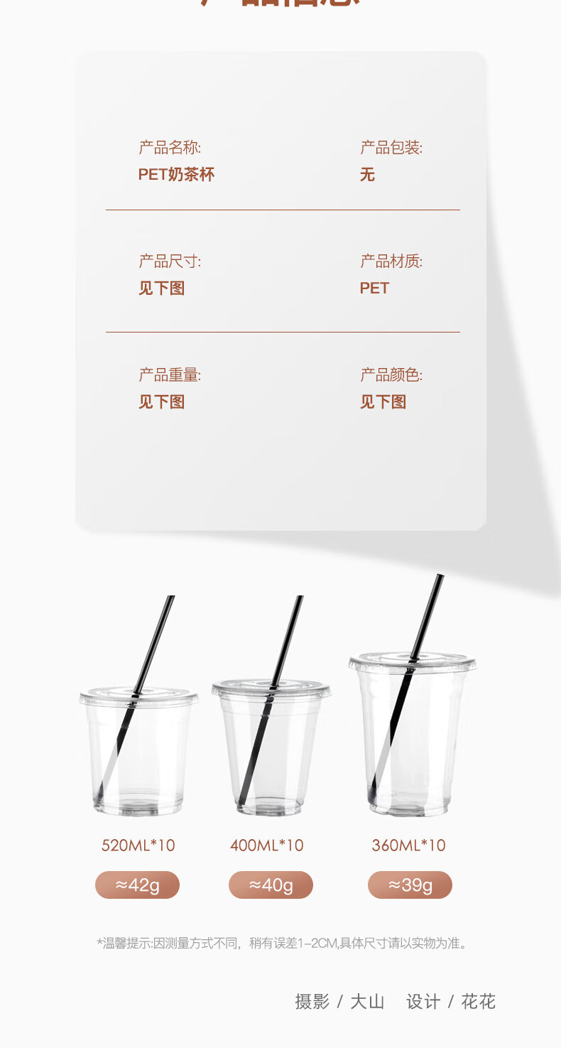 【优选】一次性咖啡杯子自制饮料冷热饮品pet塑料杯打包外带带盖D 360ml -10只套装(杯子+平盖+吸管+防漏纸