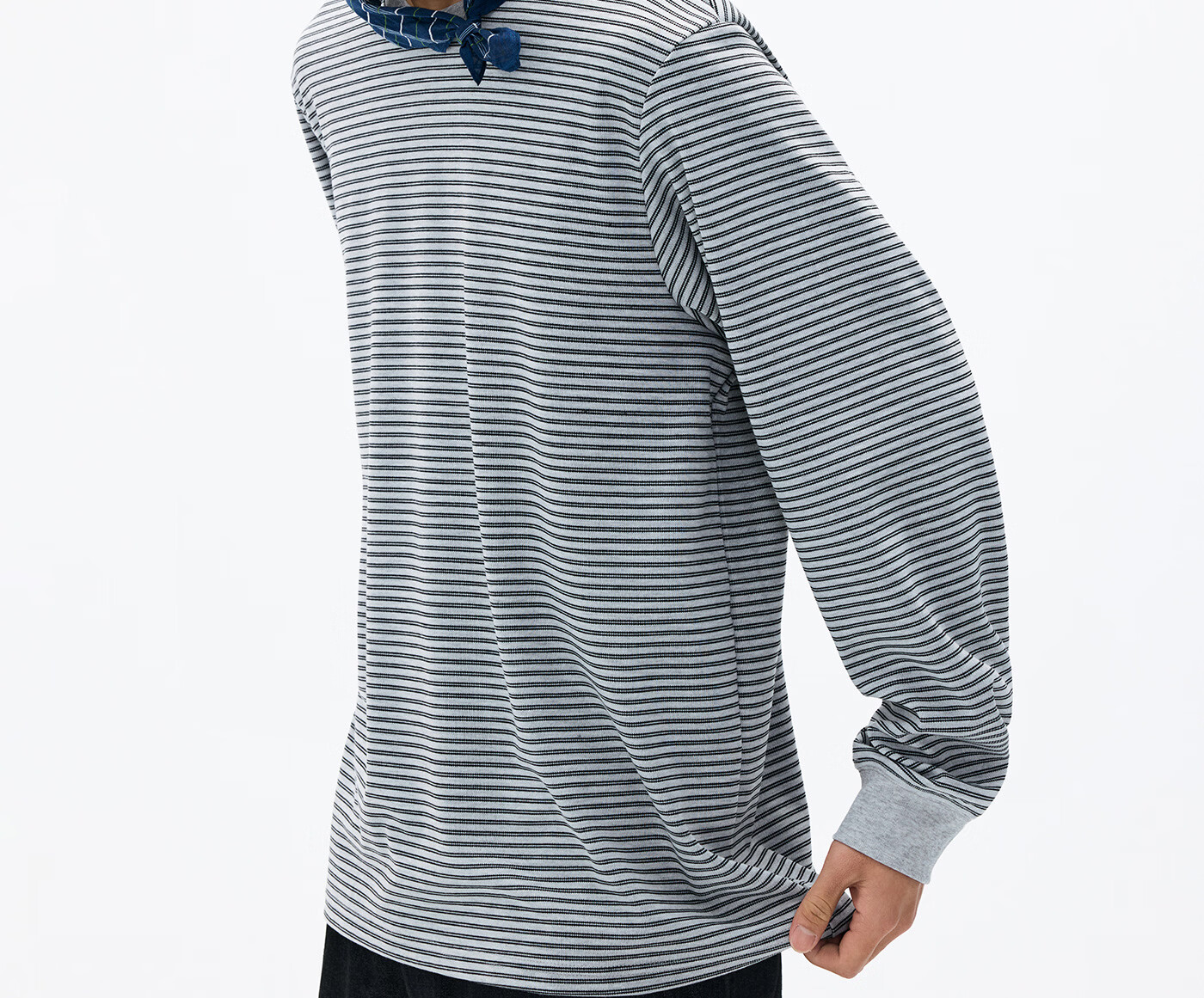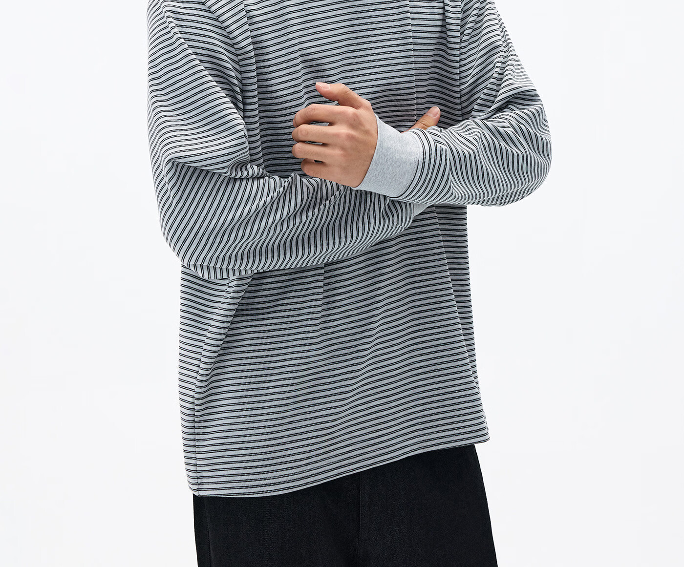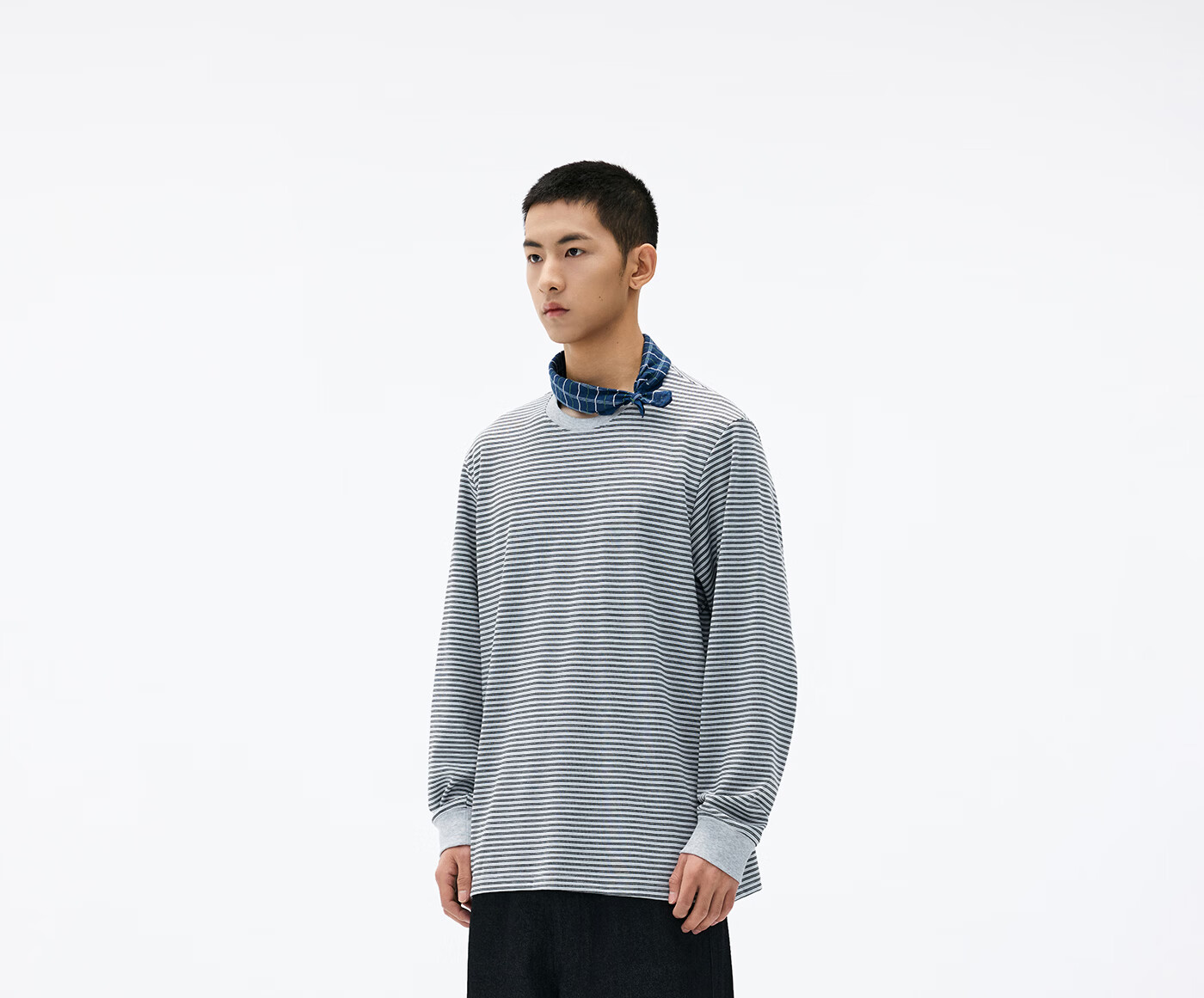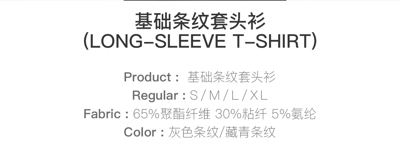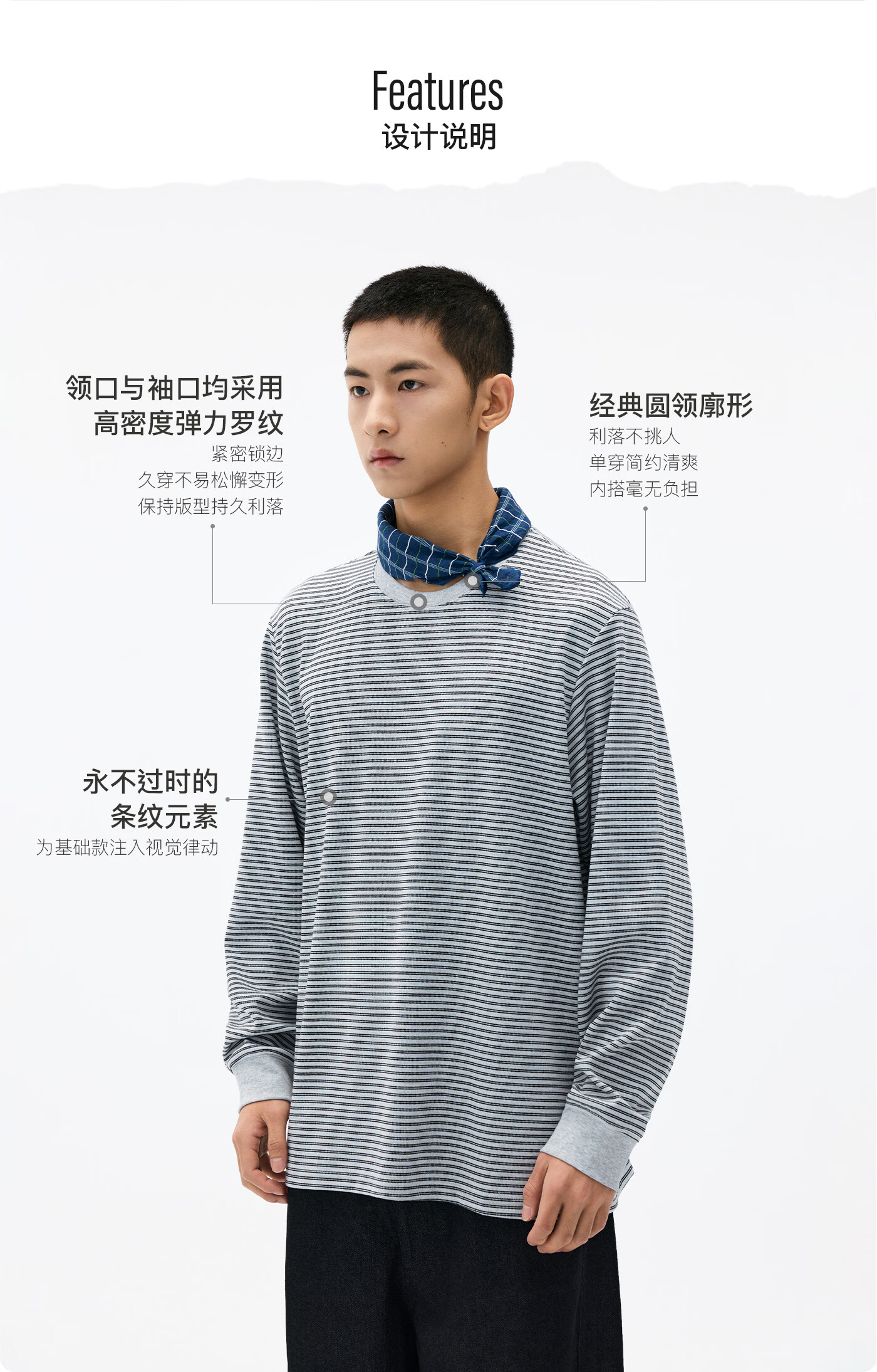 熊猫·本(ben.panda)撞色细条纹圆领长袖T恤男款高弹宽松休闲上衣2026春季 灰色条纹 S