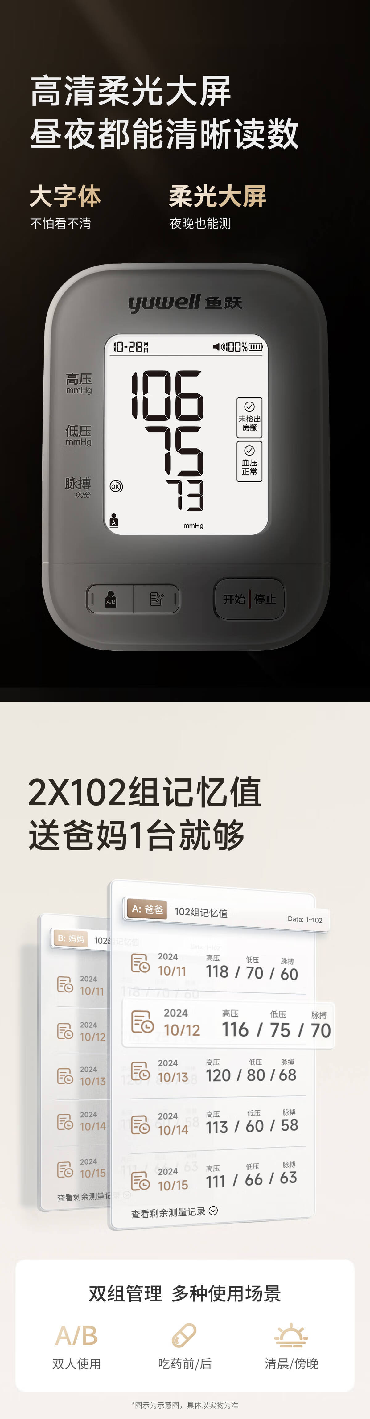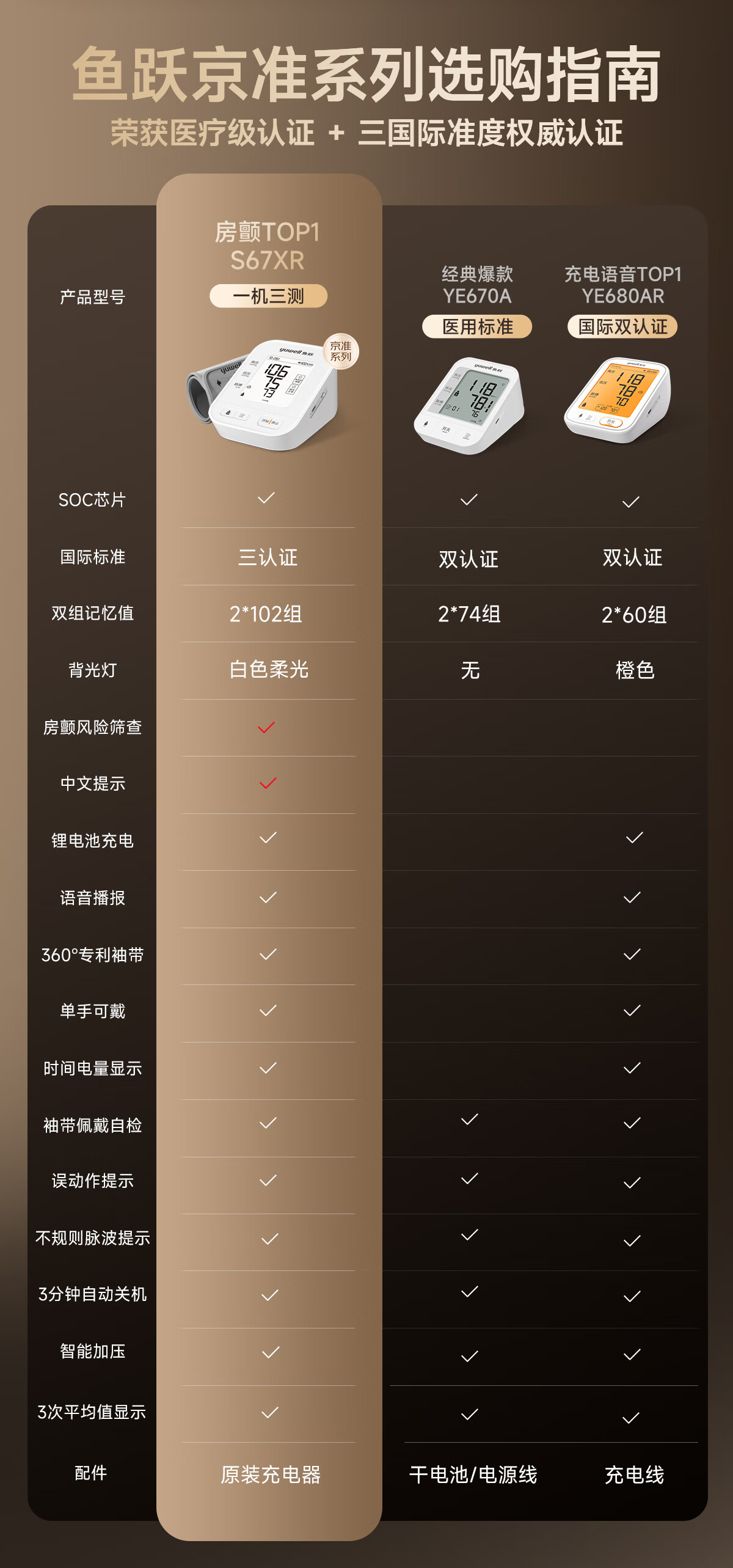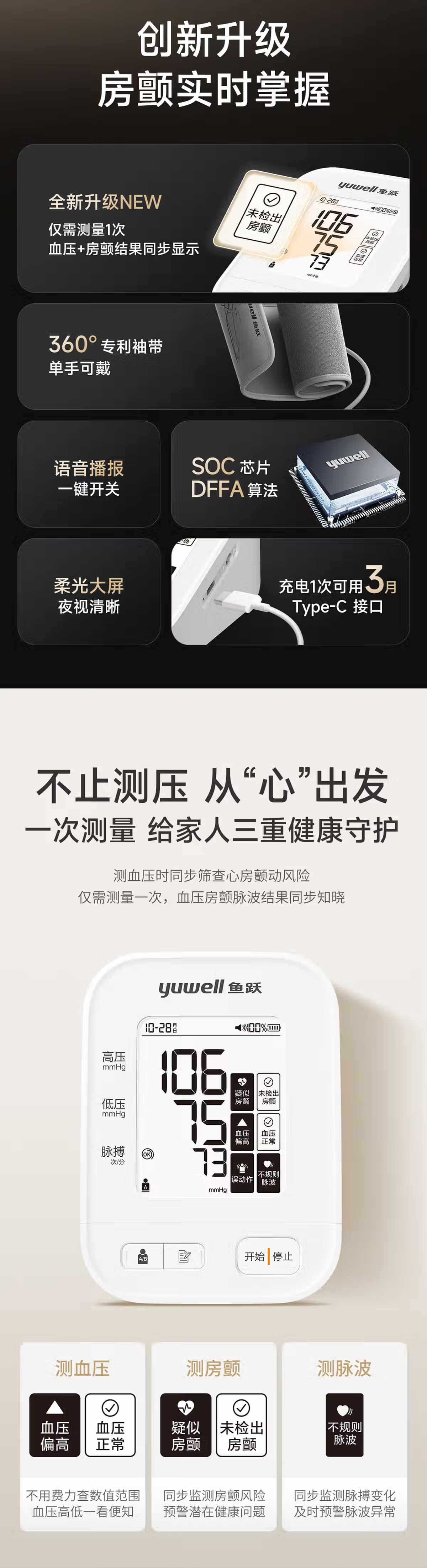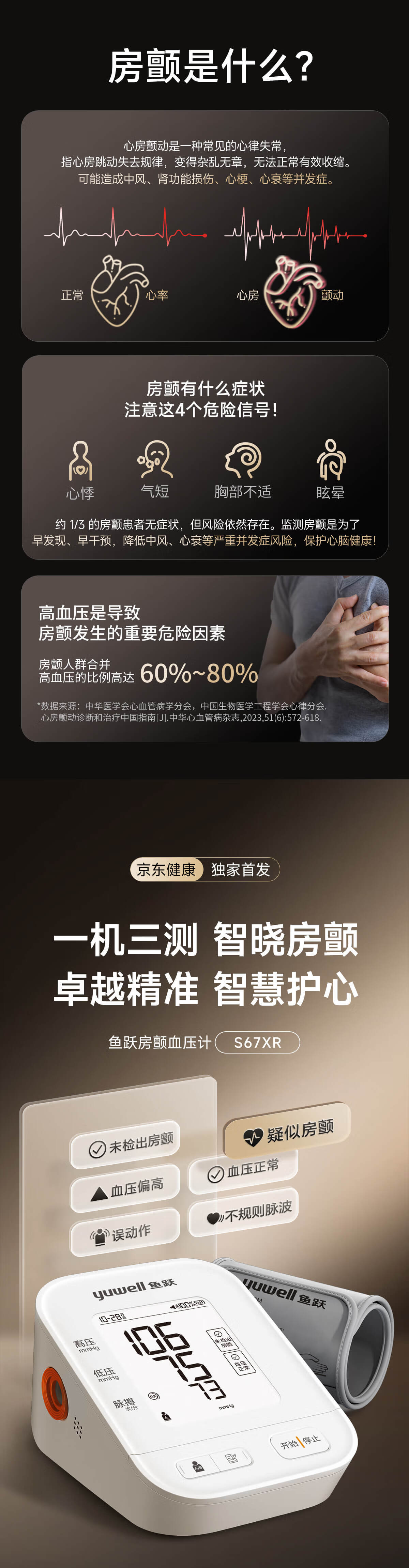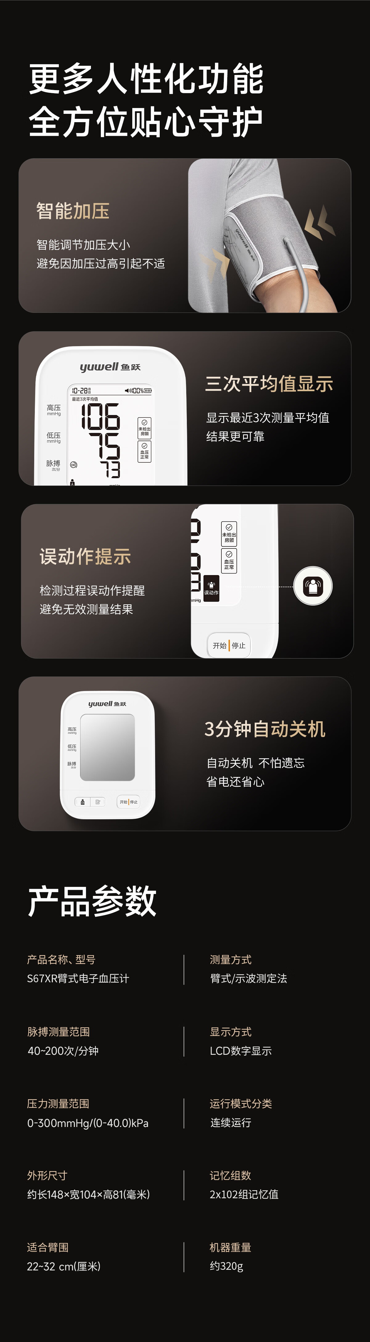 鱼跃(Yuwell)房颤爆款电子血压计S67XR医用高精准血压测量仪器家用充电血压仪